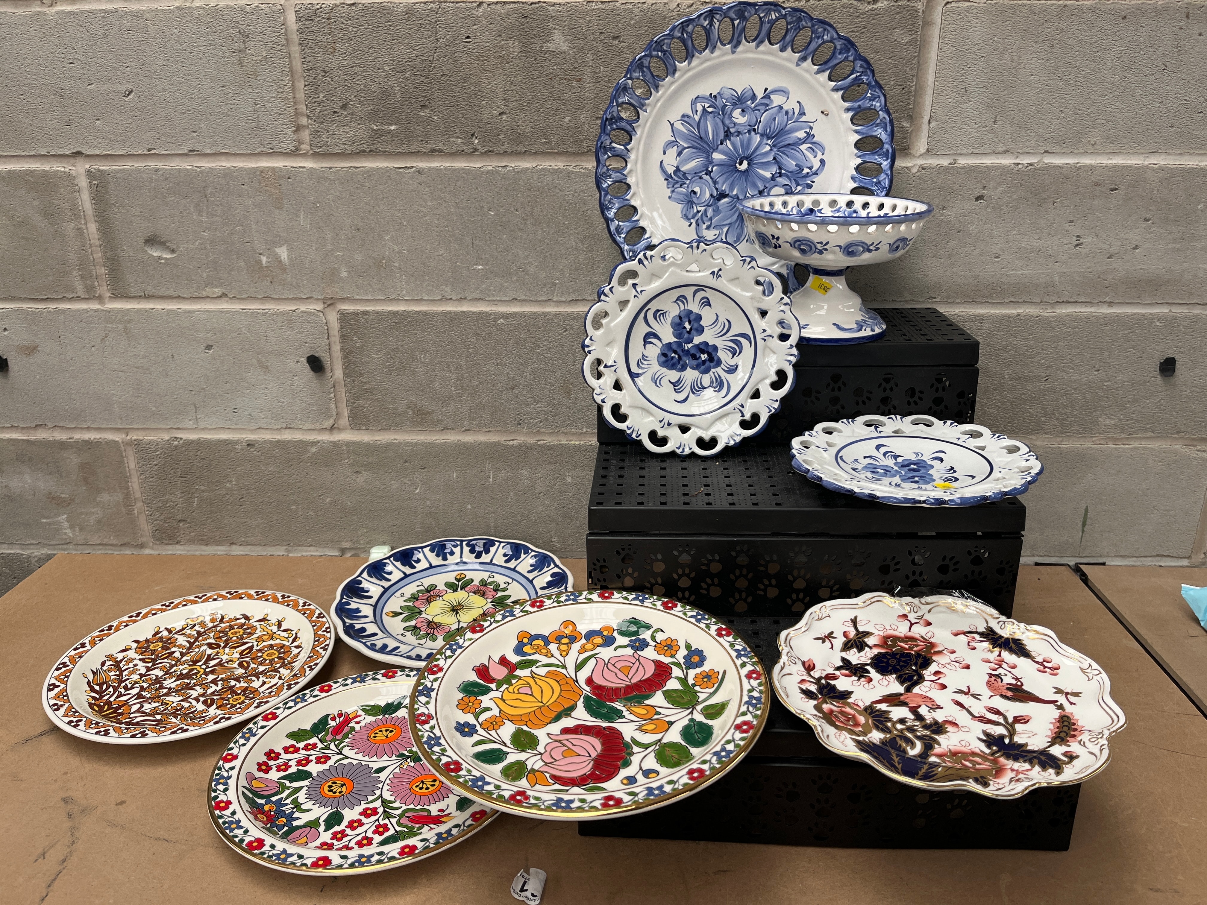 A collection of eleven ceramic items, attributed to Ceramica Olympia Greece, comprising ten plates of various sizes and one footed bowl. The lot includes five blue and white pieces, featuring a large pierced-rim wall plate, a footed bowl (marked ‘$15.00’), and three smaller plates (one with a partial ‘HAND’ sticker, another marked ‘$8.00’), all decorated with traditional floral patterns. The remaining six pieces are brightly colored, including an oval platter with a brown and orange botanical design, and five round plates displaying vibrant, hand-painted-style floral motifs (one marked ‘$10.00’). One of these multi-colored plates features a darker, more detailed scene of birds and flowers with gold rim accents. These pieces exhibit a folk art aesthetic, with some designs reminiscent of European folk pottery or Delftware, and others suggesting Eastern European or Mediterranean origins.