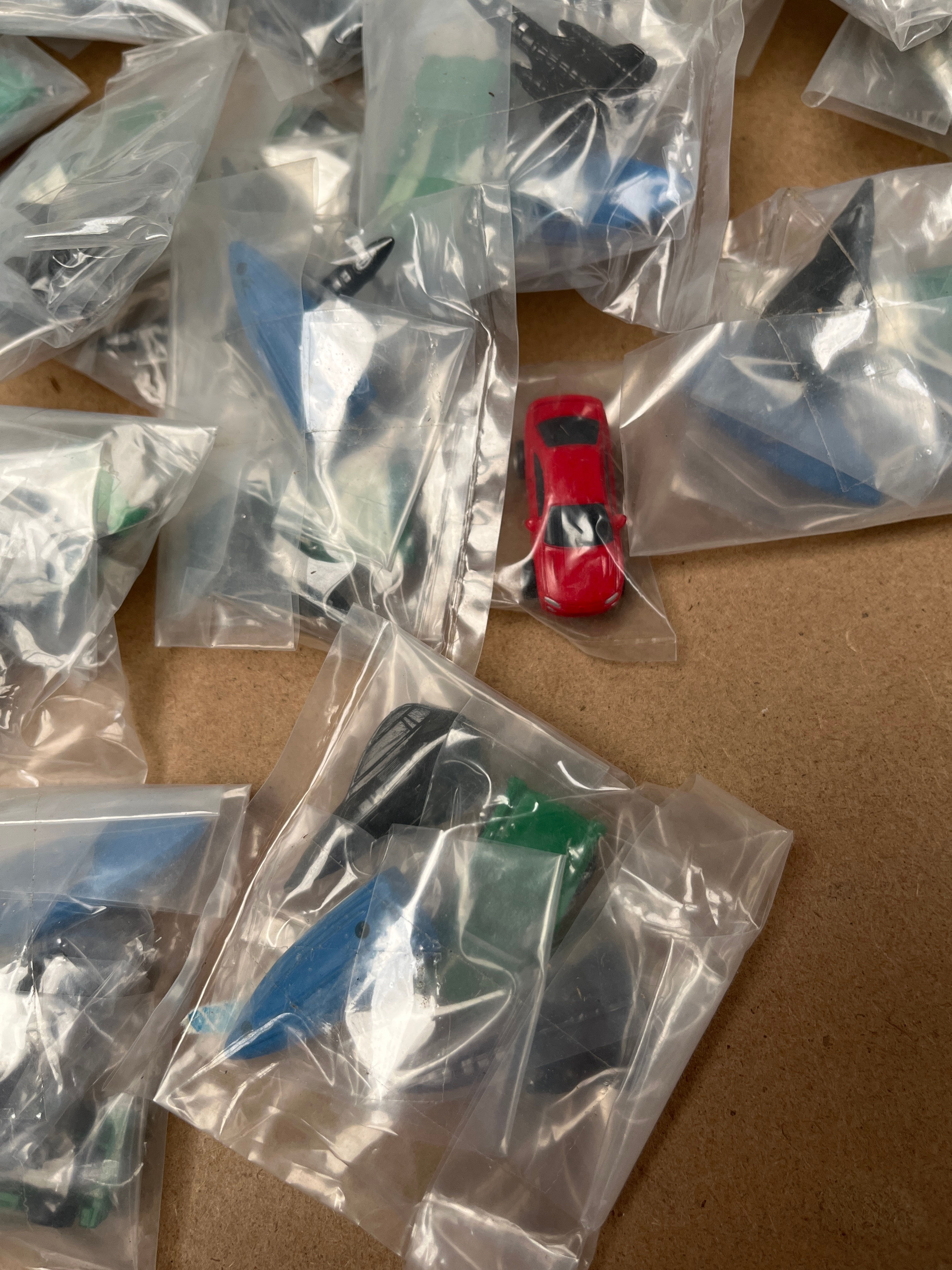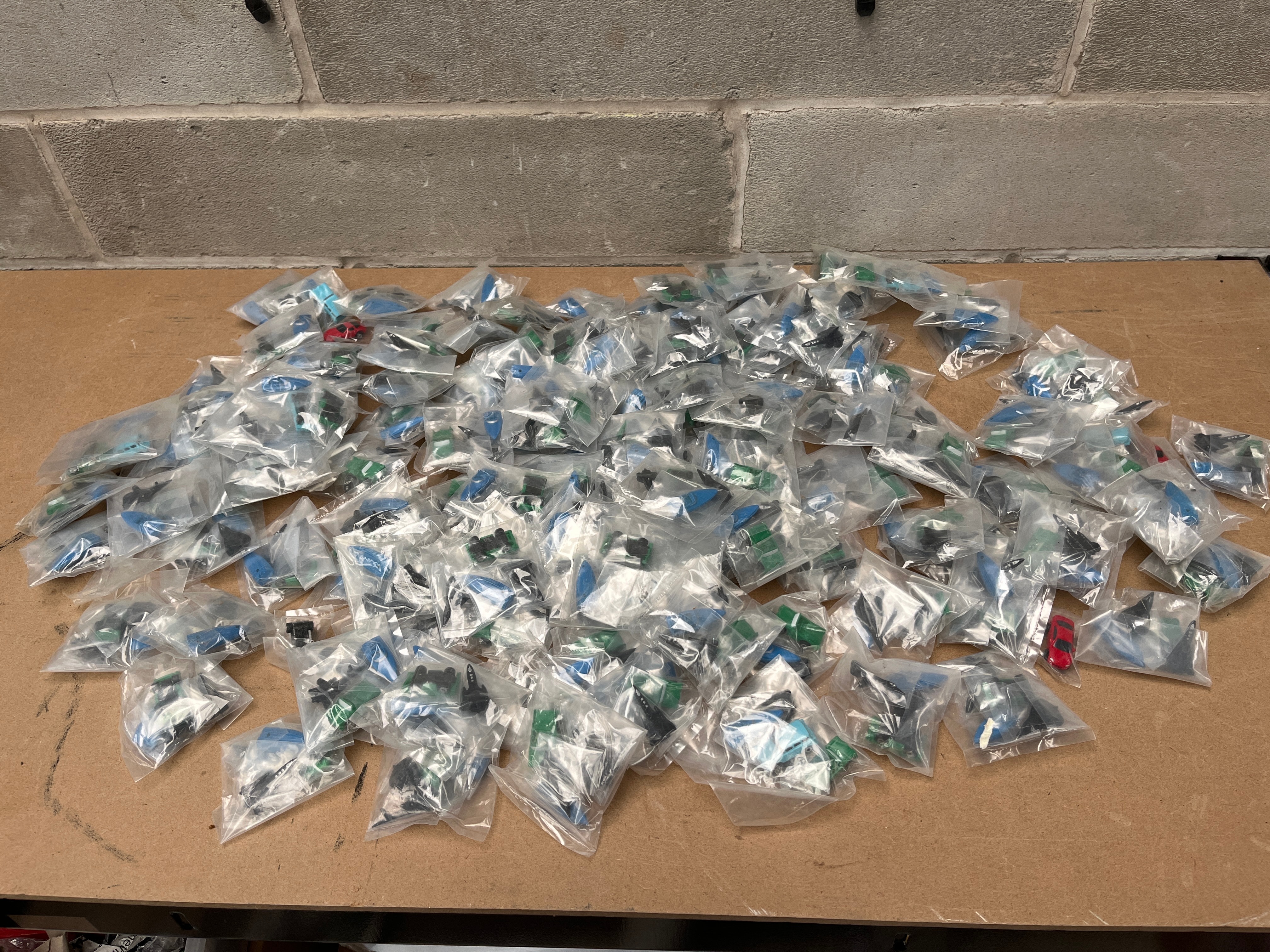 A large lot of Micro Machines miniature plastic toy vehicles, primarily consisting of small cars, airplanes, and other assorted transport models. The vehicles are presented in varying colors including red, blue, green, and black. Each item is individually sealed within a clear plastic bag, appearing to be in factory-sealed condition.