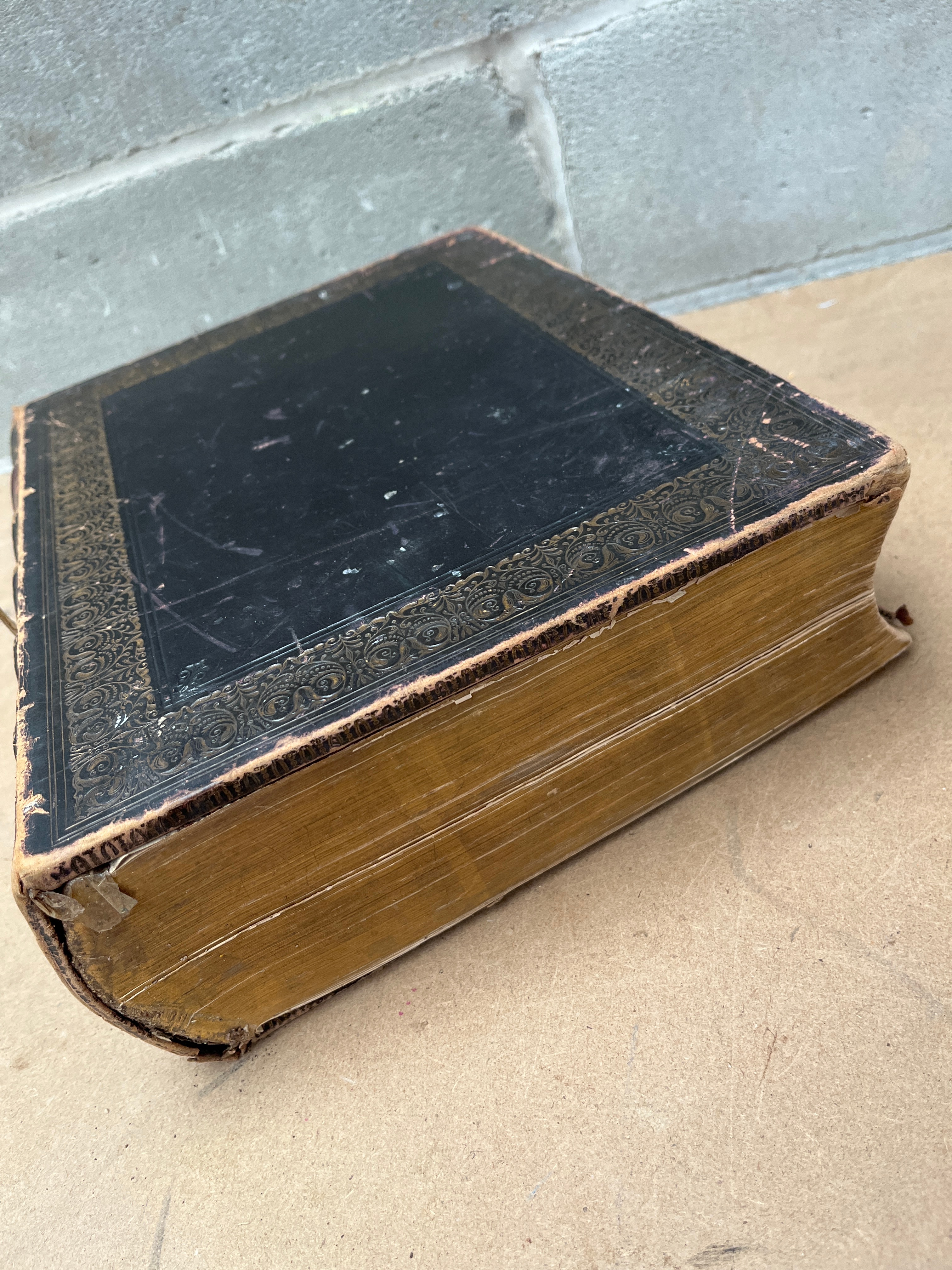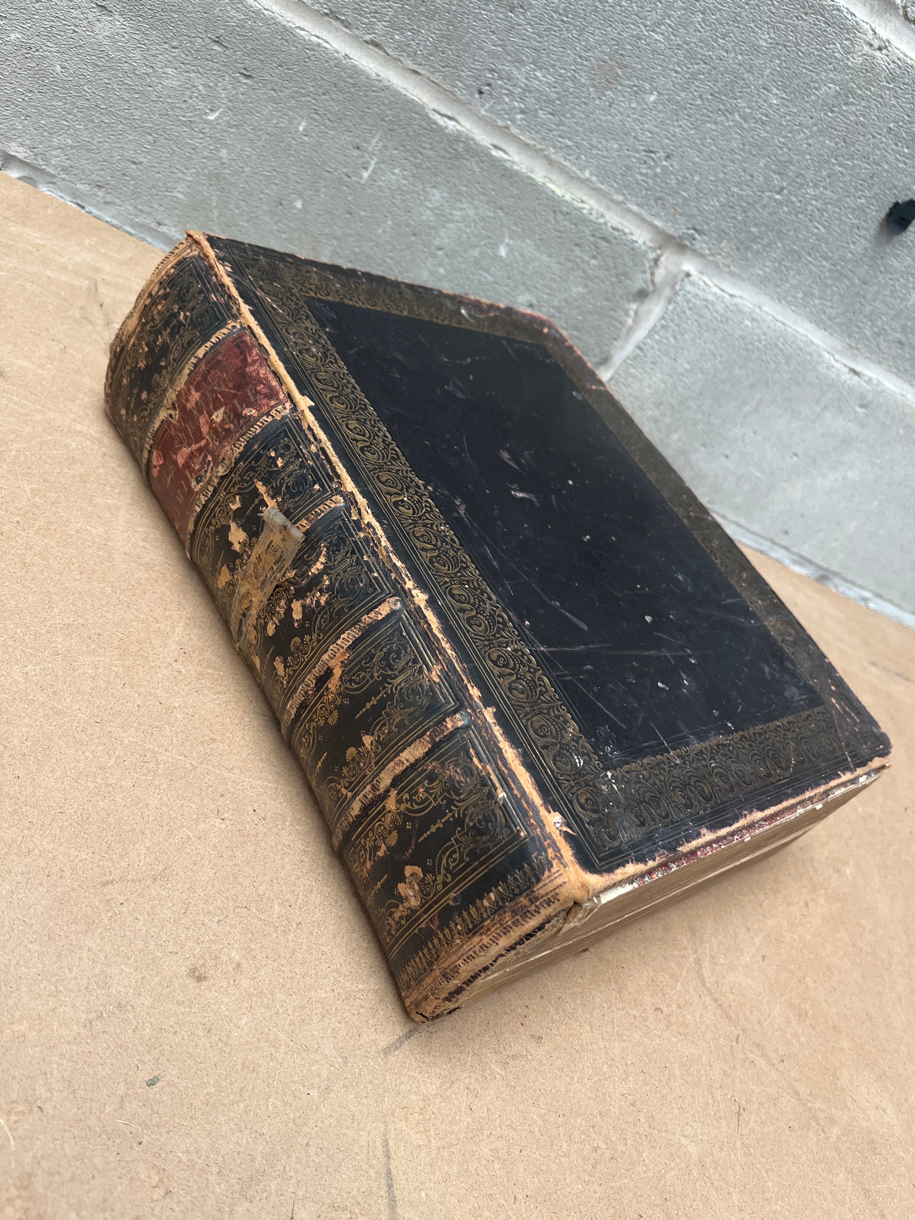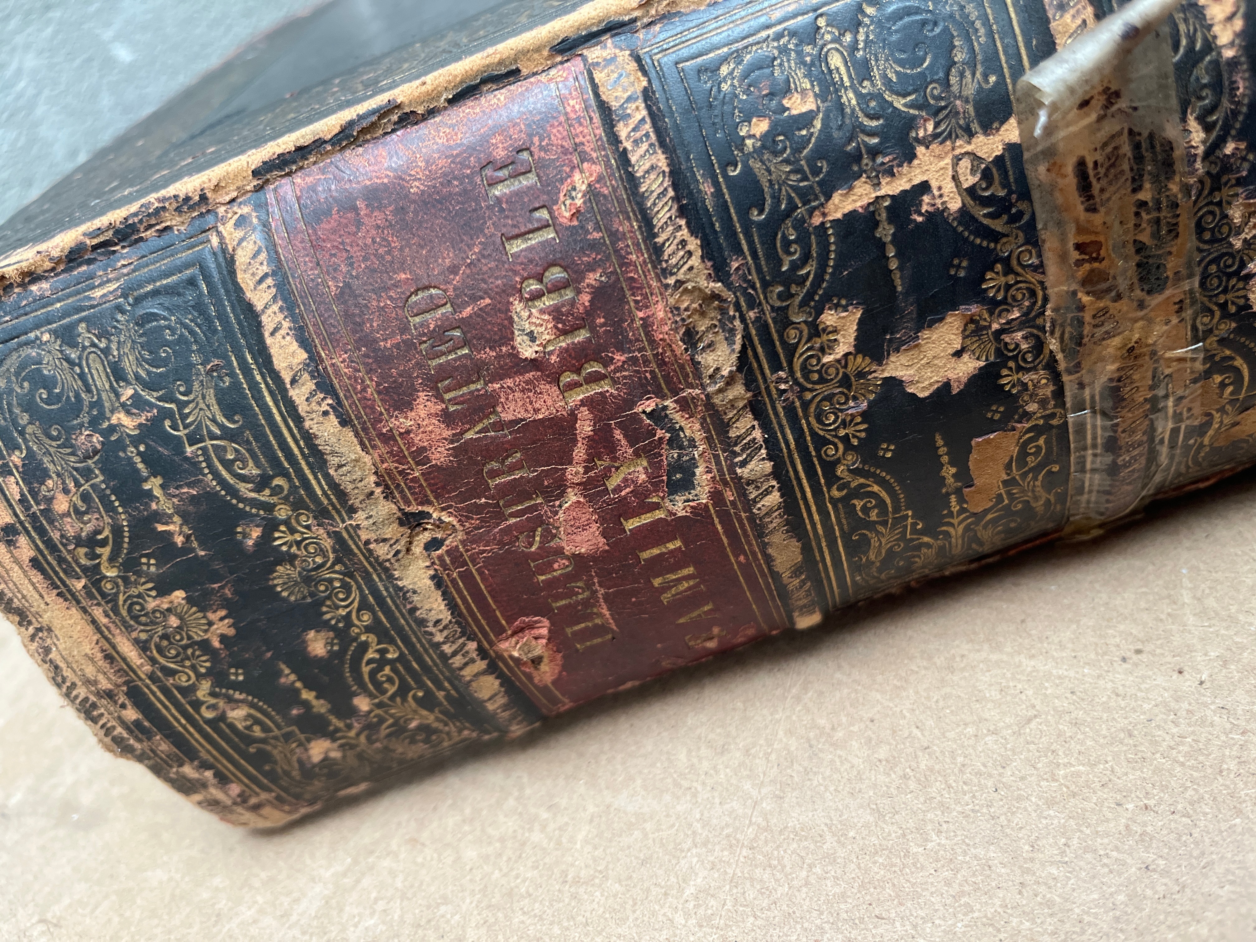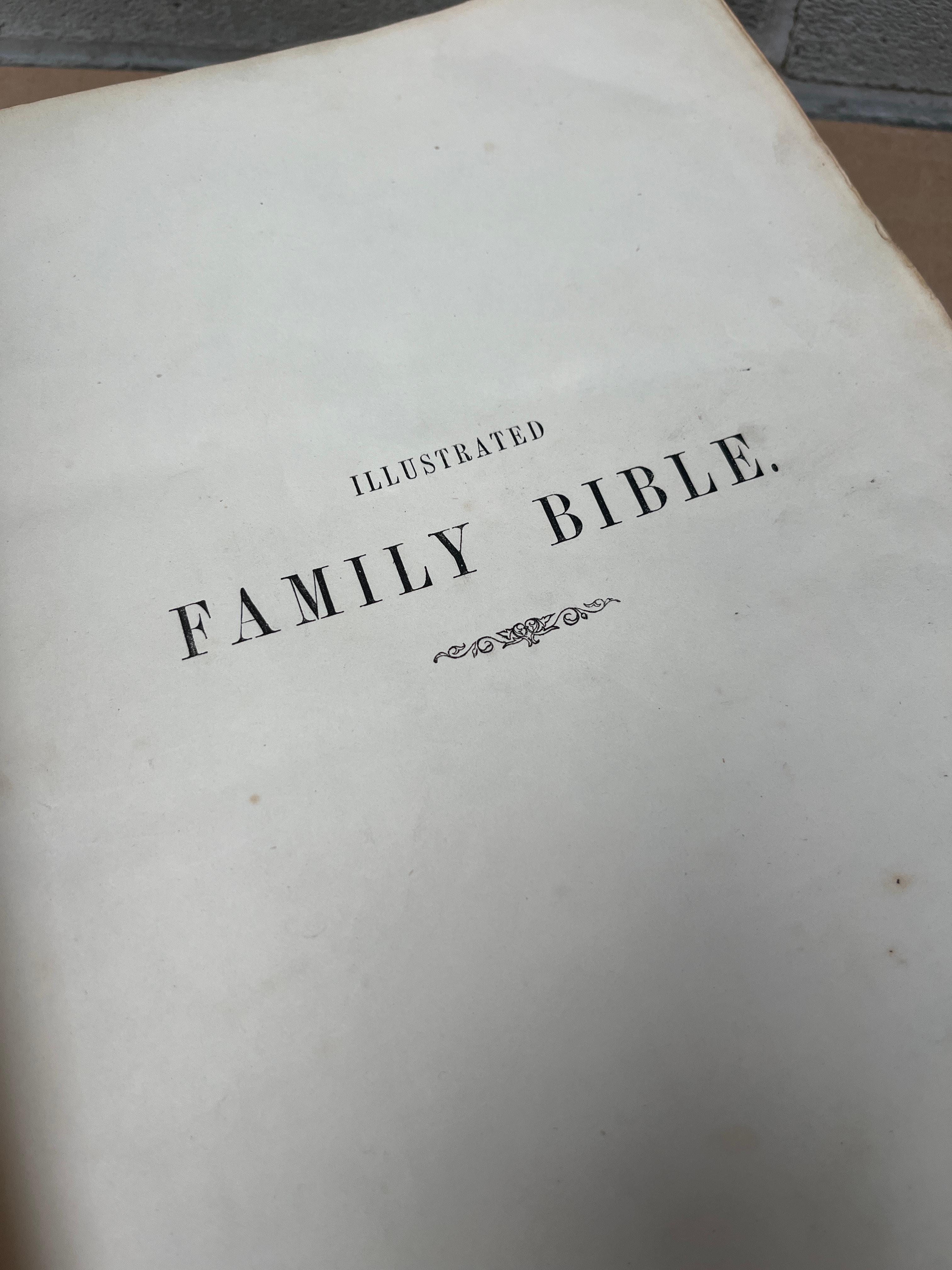 A large, antique-style Illustrated Family Bible, published by D. Appleton & Co. The book features a dark, possibly black or deep brown, leather binding with a distinct red/maroon spine label, all extensively decorated with elaborate gilt tooling on the covers, spine, and page edges, consistent with a 19th-century, likely Victorian, period. The internal title page clearly identifies it as an “ILLUSTRATED FAMILY BIBLE.” The internal page block appears relatively intact.