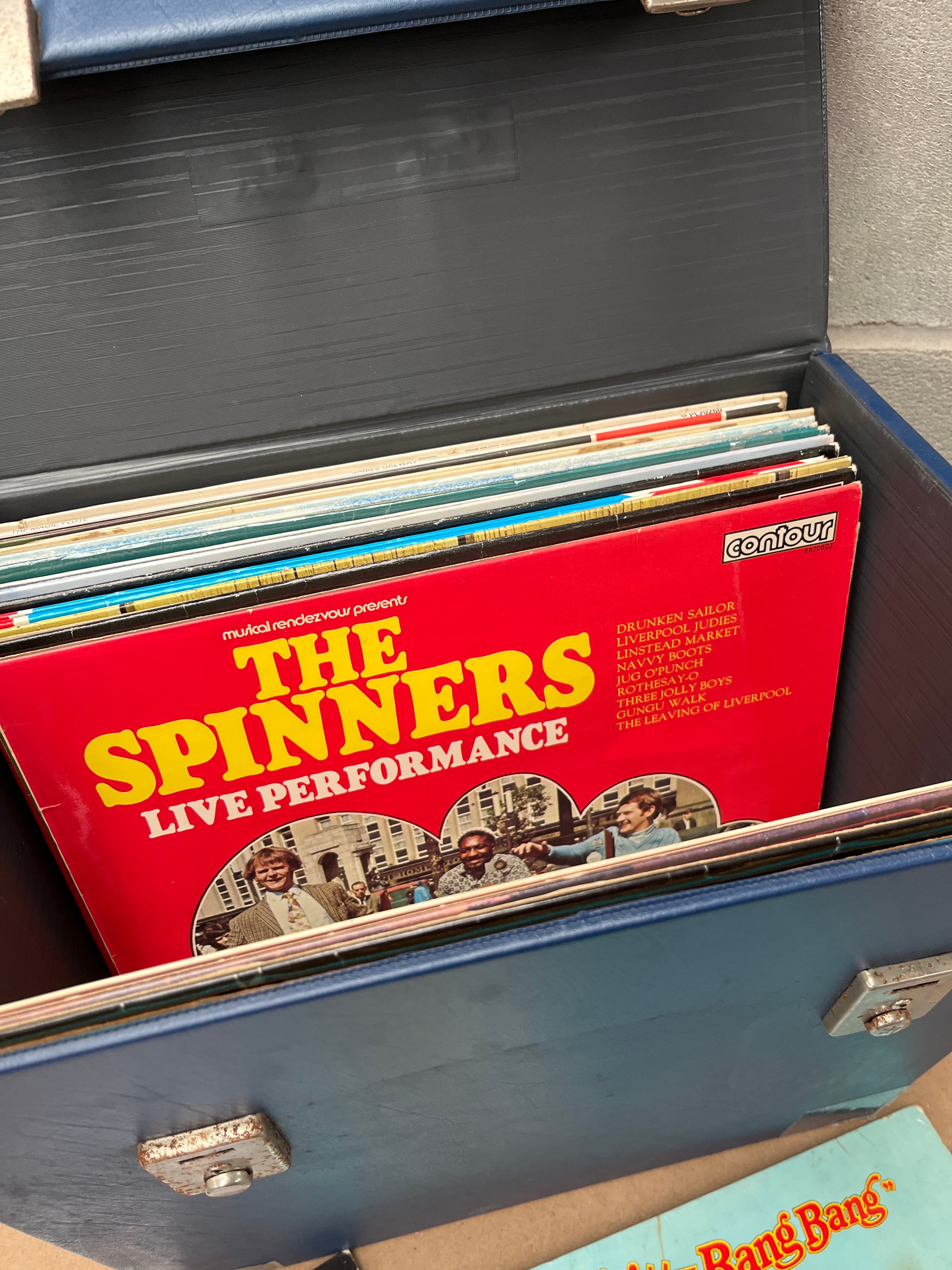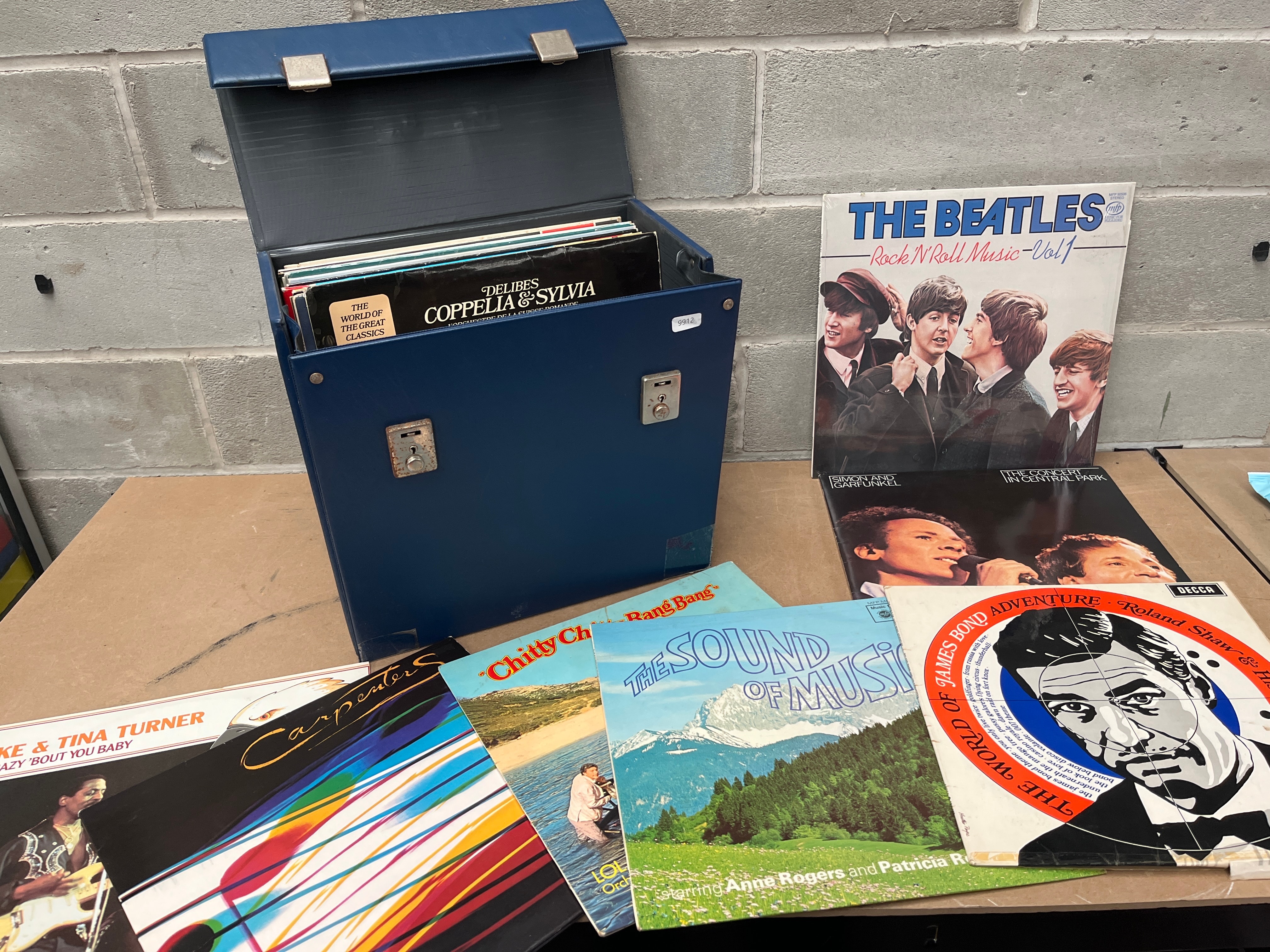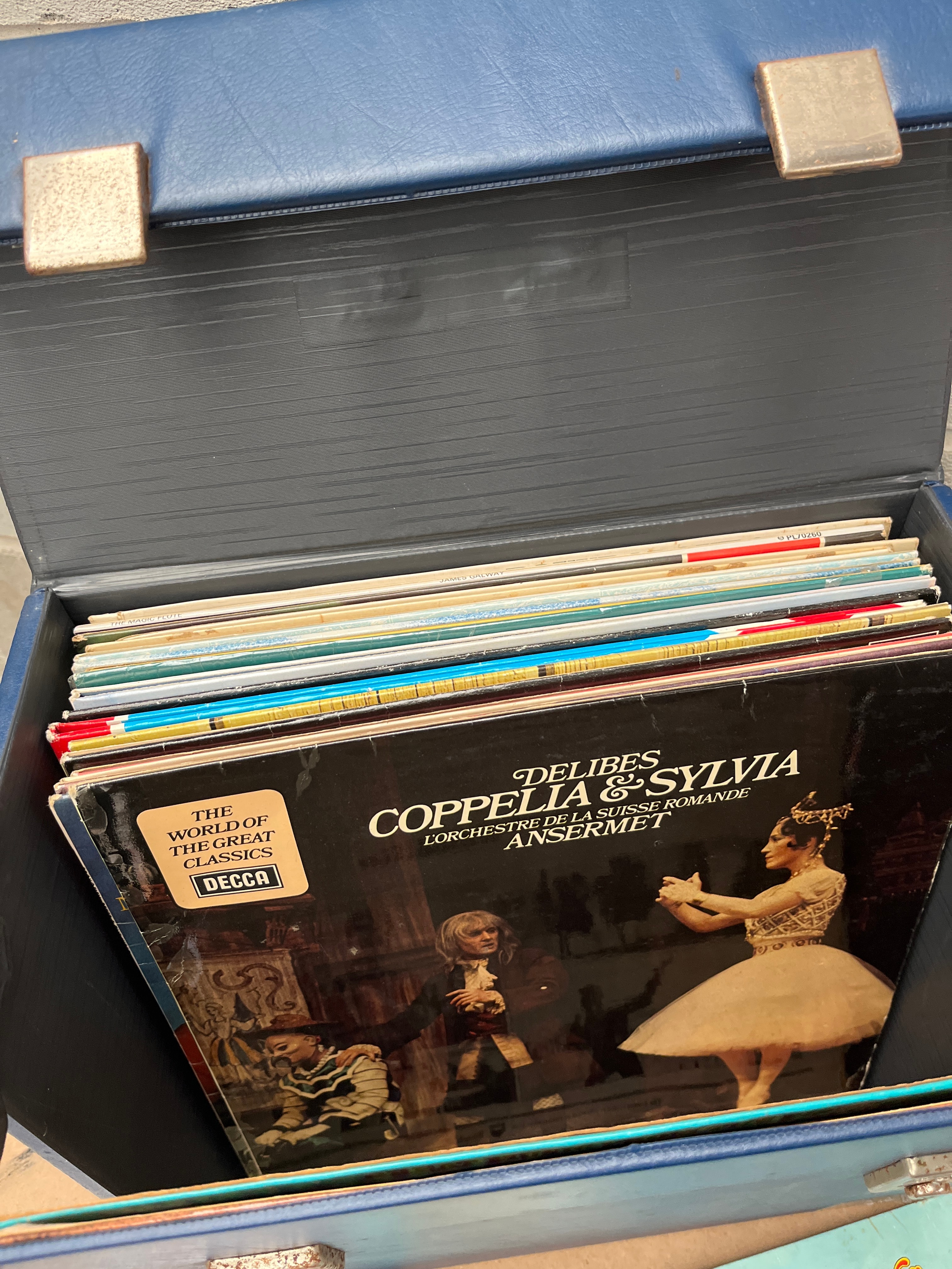 A collection of approximately 30-50 12-inch vinyl long-playing records (LPs) housed within a rectangular, blue, faux-leather or vinyl-covered portable storage case featuring metal latches. The collection spans various musical genres and periods, likely from the 1960s to 1980s. Visible titles include “The Beatles – Rock ‘N’ Roll Music – Vol 1,” “DELIBES COPPELIA & SYLVIA” performed by “L’ORCHESTRA SUISSE ROMANDE ANSEPMET” (The Swiss Romande Orchestra), “The Spinners – Live Performance,” “Chitty Chitty Bang Bang,” “The Sound of Music,” and “James Bond Adventure – Roland Shaw & his Orchestra.”