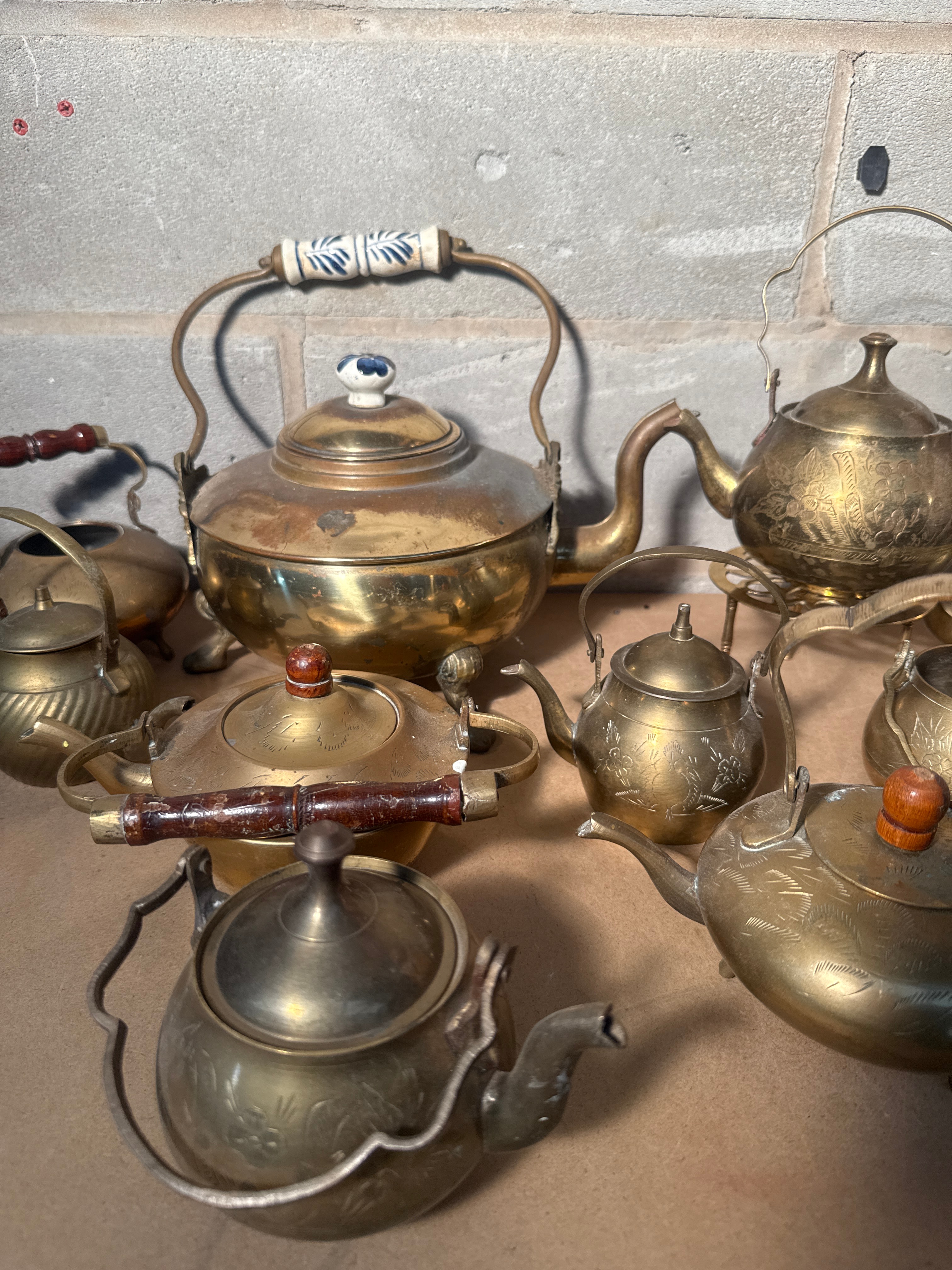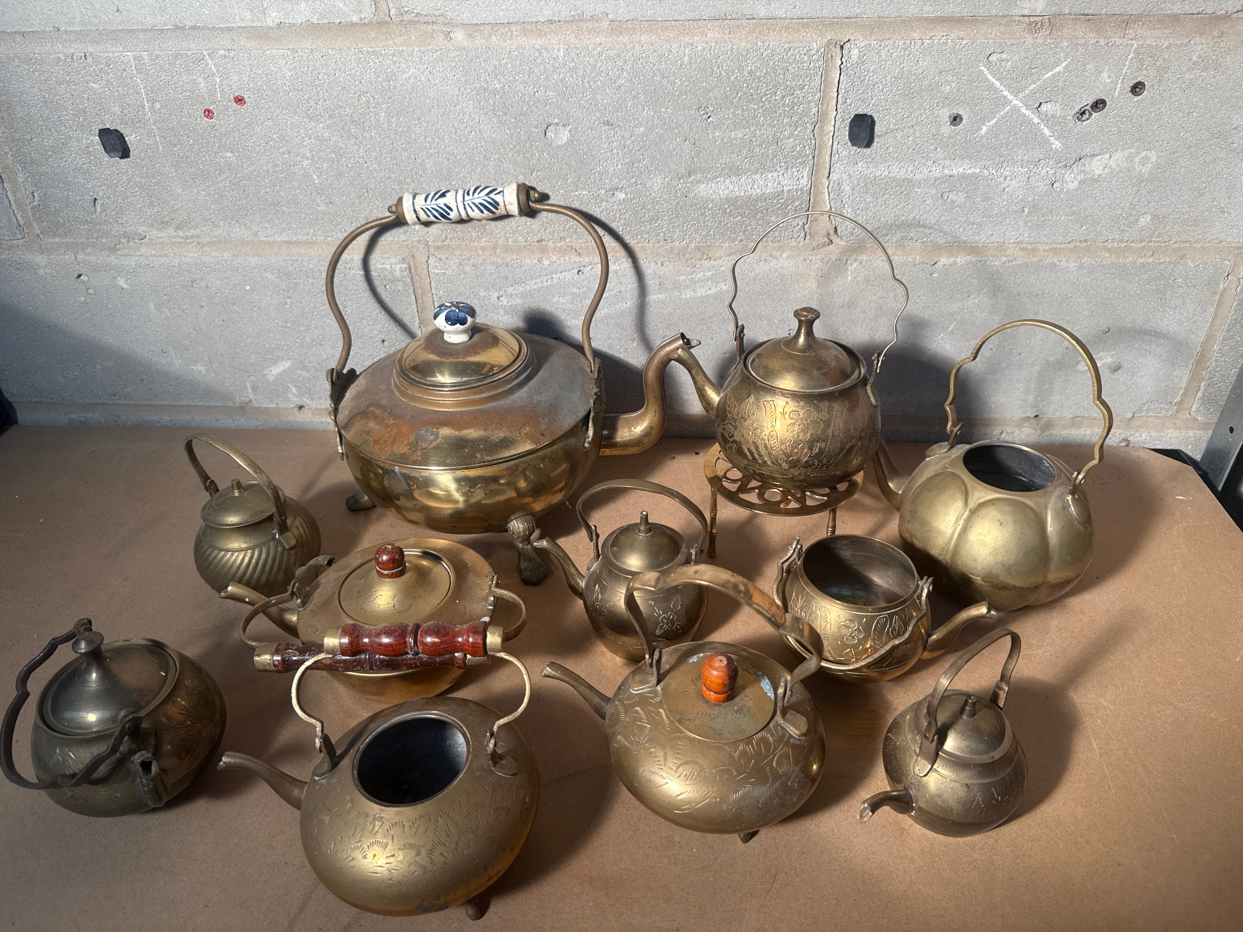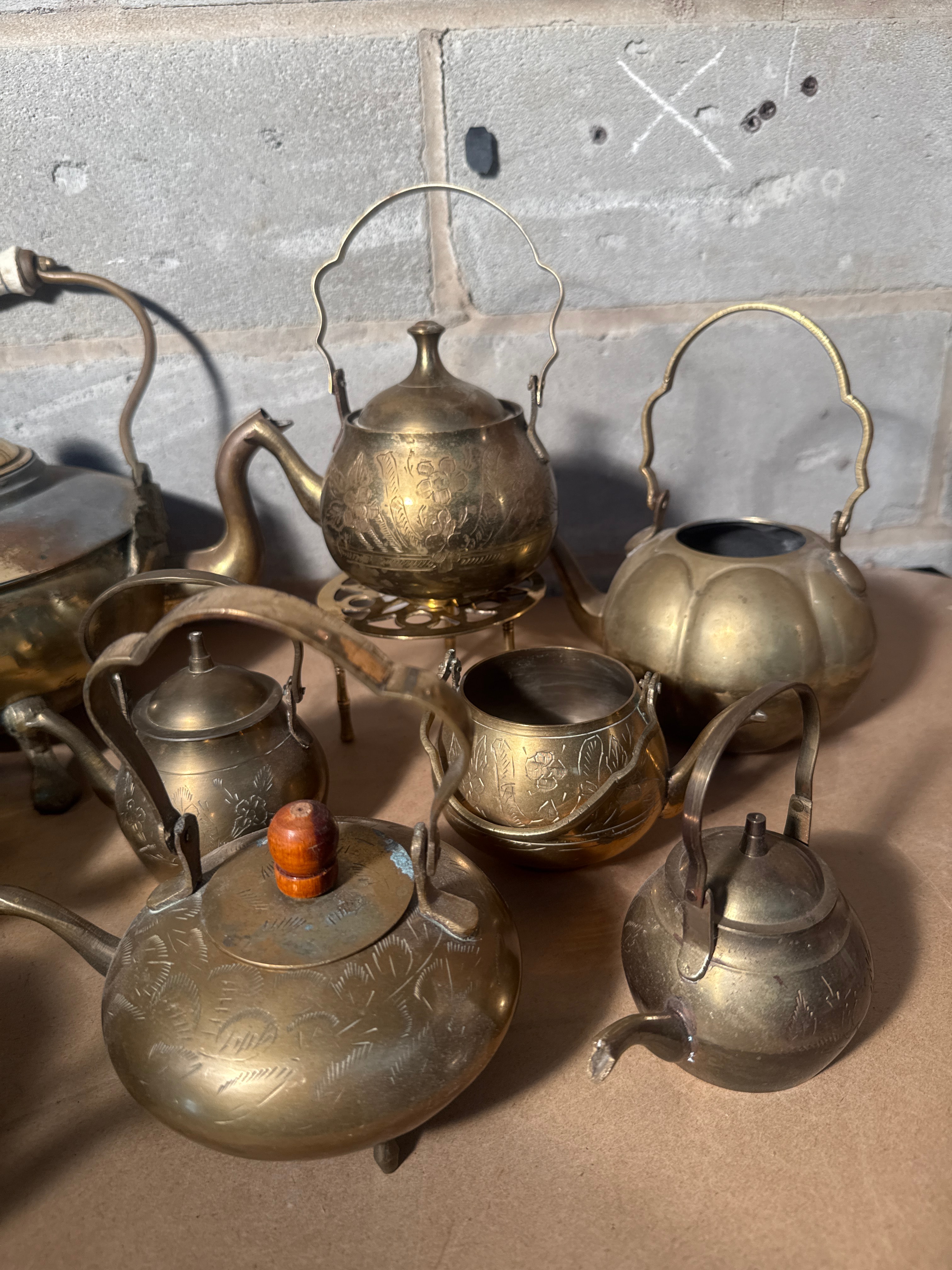 A collection of thirteen varied metal kettles and teapots, predominantly crafted from brass or a brass-toned alloy. The pieces display diverse forms and sizes, ranging from small decorative items to larger functional kettles, many featuring intricate engraved or embossed floral, foliate, and stylized patterns. Several pieces incorporate decorative handles made of ceramic (one with blue and white decoration), wood, or wire. The overall aesthetic suggests an antique or vintage period, with designs appearing to be of East Asian, Middle Eastern, or Indian influence.