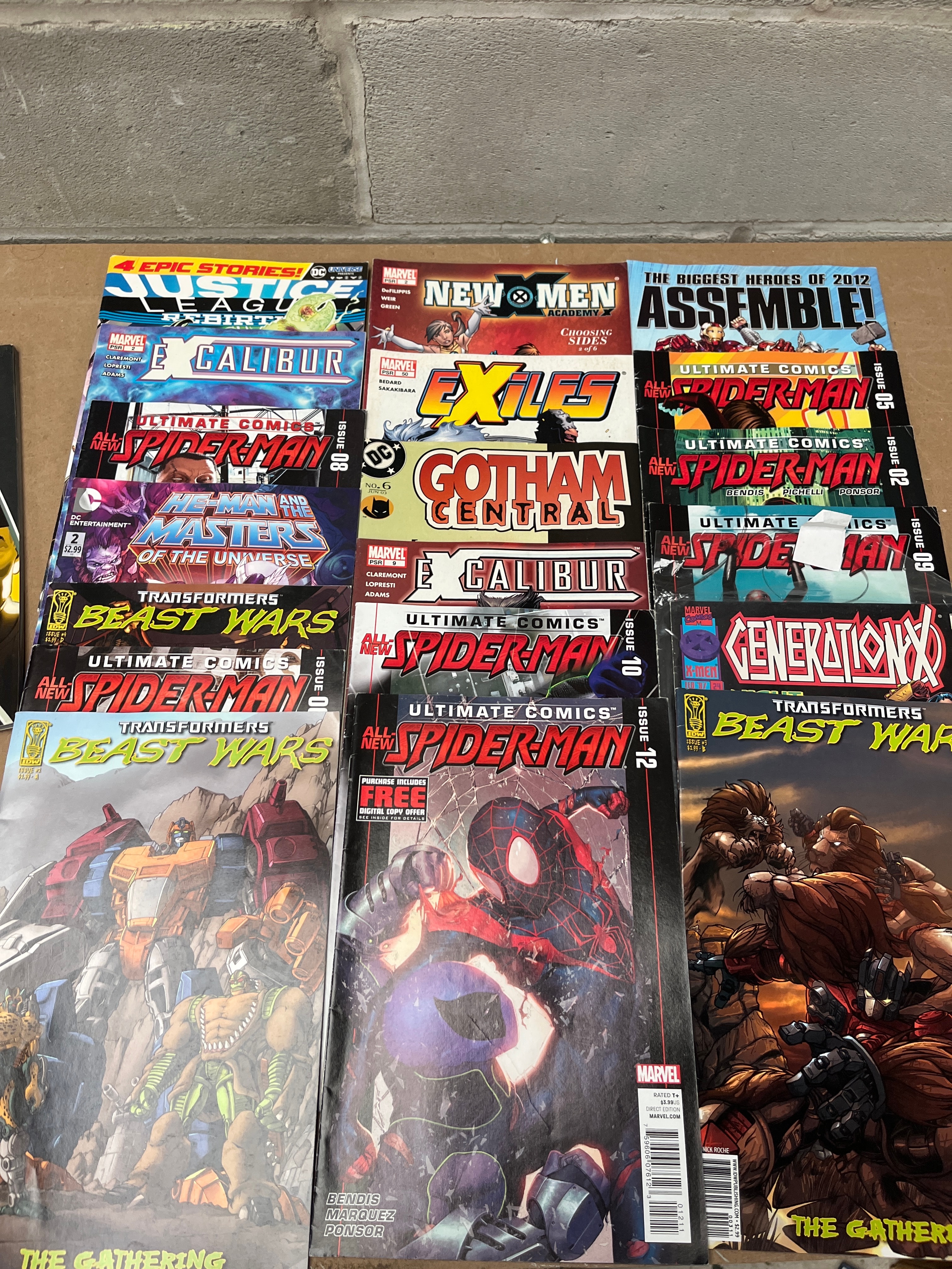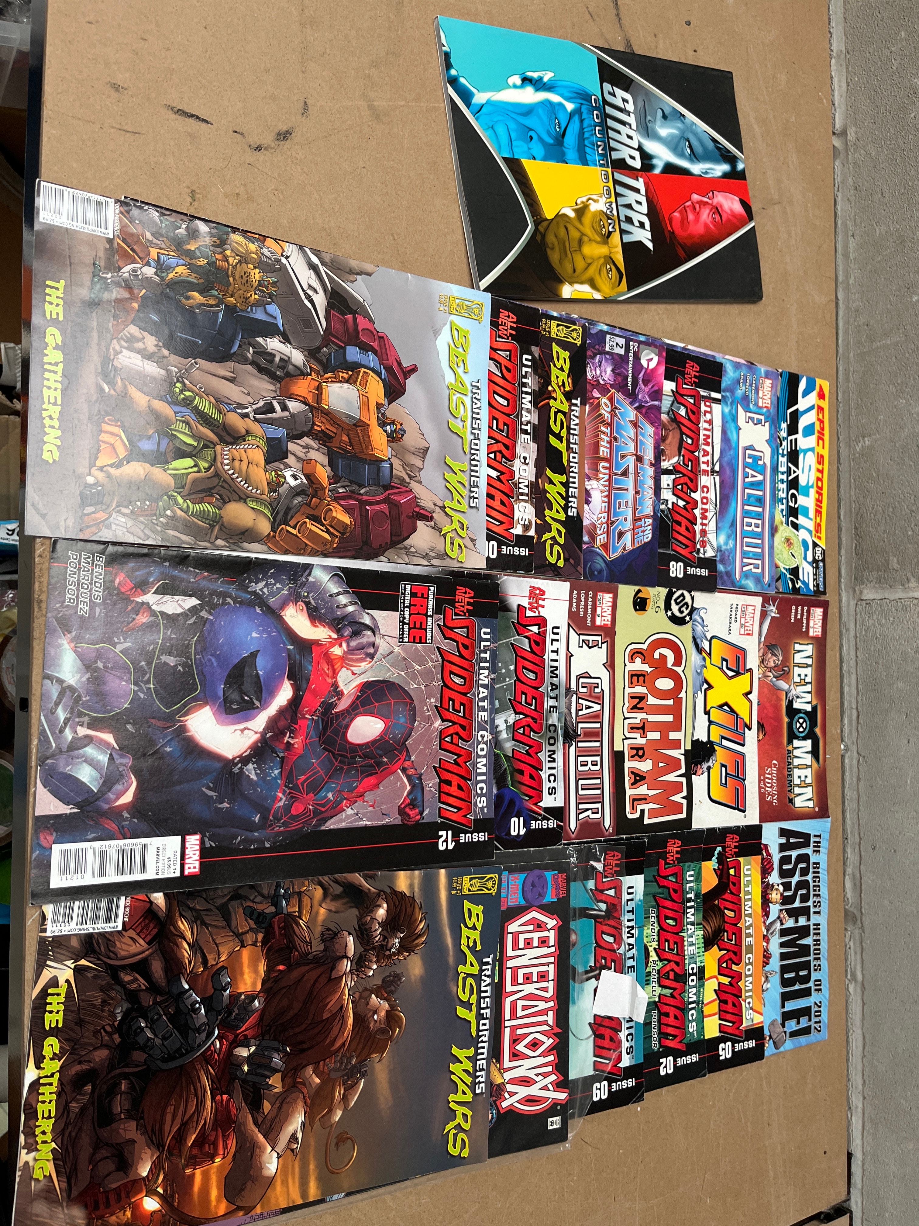 A collection of approximately 20-25 modern American comic books, predominantly from Marvel and DC Comics, dating to the 2000s-2010s. Key visible titles include multiple issues of ‘Ultimate Spider-Man’ (e.g., #0, #10, #12), ‘Transformers: Beast Wars,’ ‘New X-Men,’ ‘Exiles,’ ‘Gotham Central,’ ‘Calibur,’ ‘Masters of the Universe,’ ‘Justice League,’ and ‘Generation X.’ These comics are in standard format, printed on paper/cardstock with glossy covers. Also included is one smaller, square-format publication titled ‘Star Trek,’ featuring character art from various iterations of the franchise, likely a guide or mini-comic.