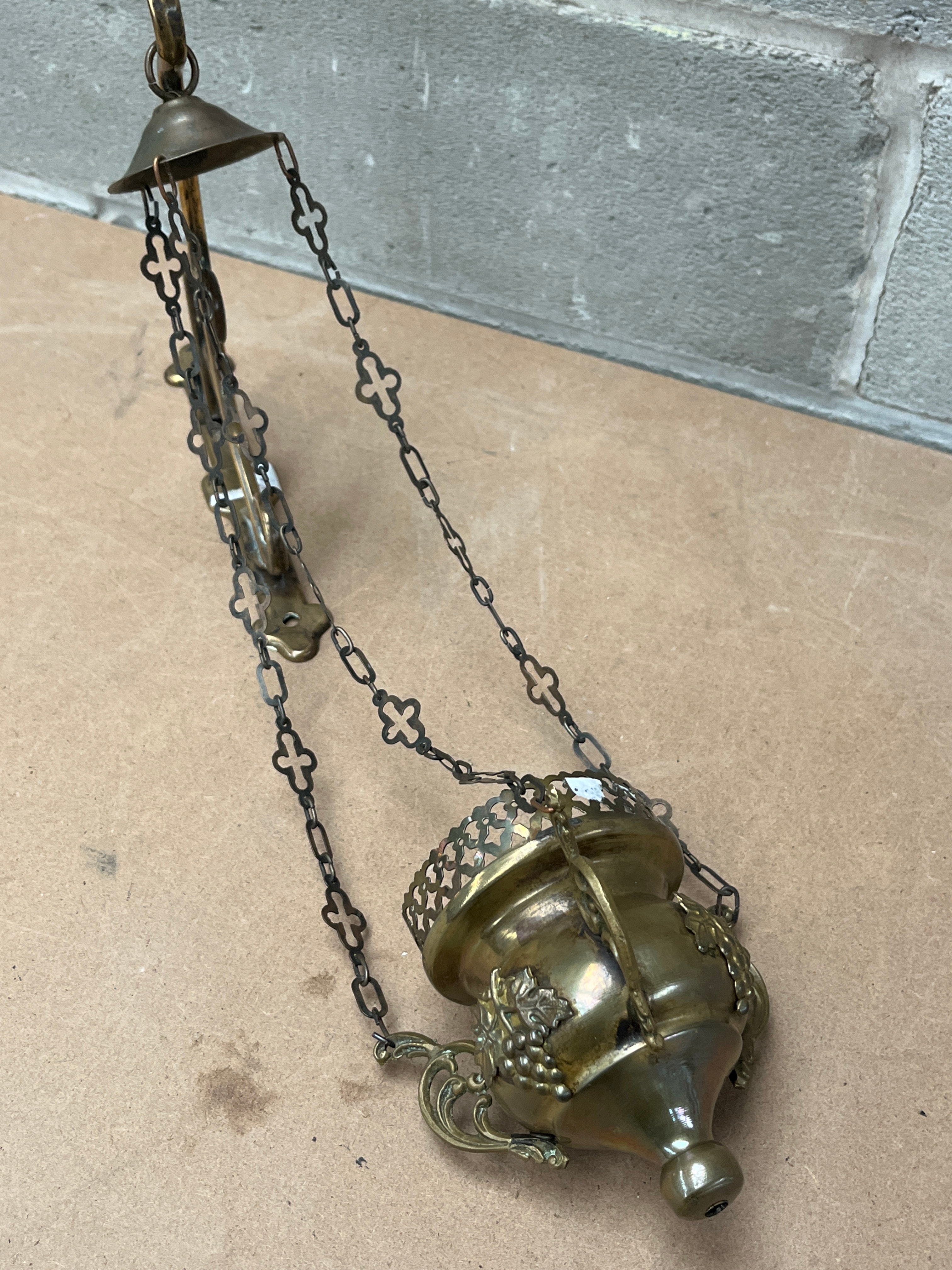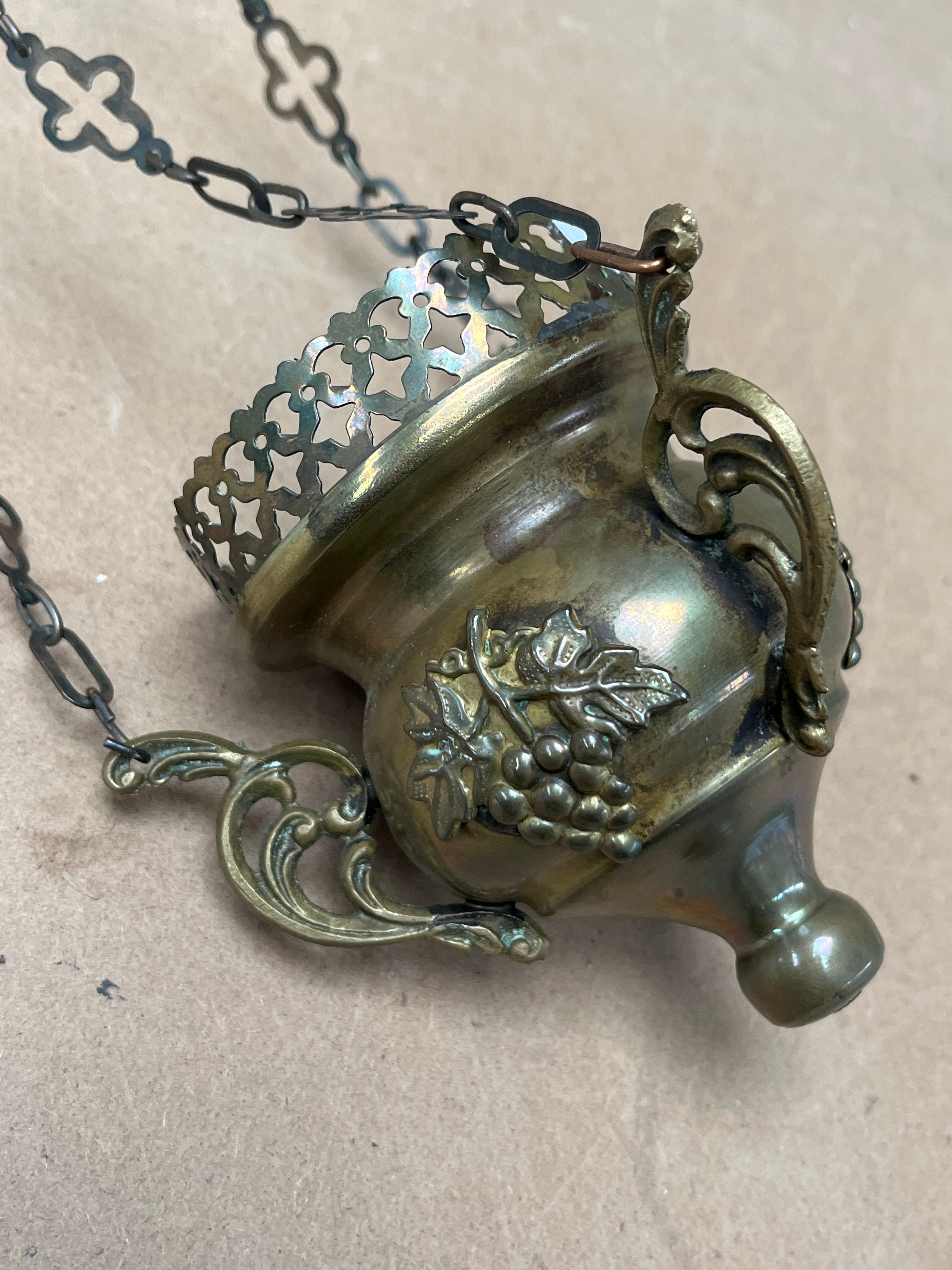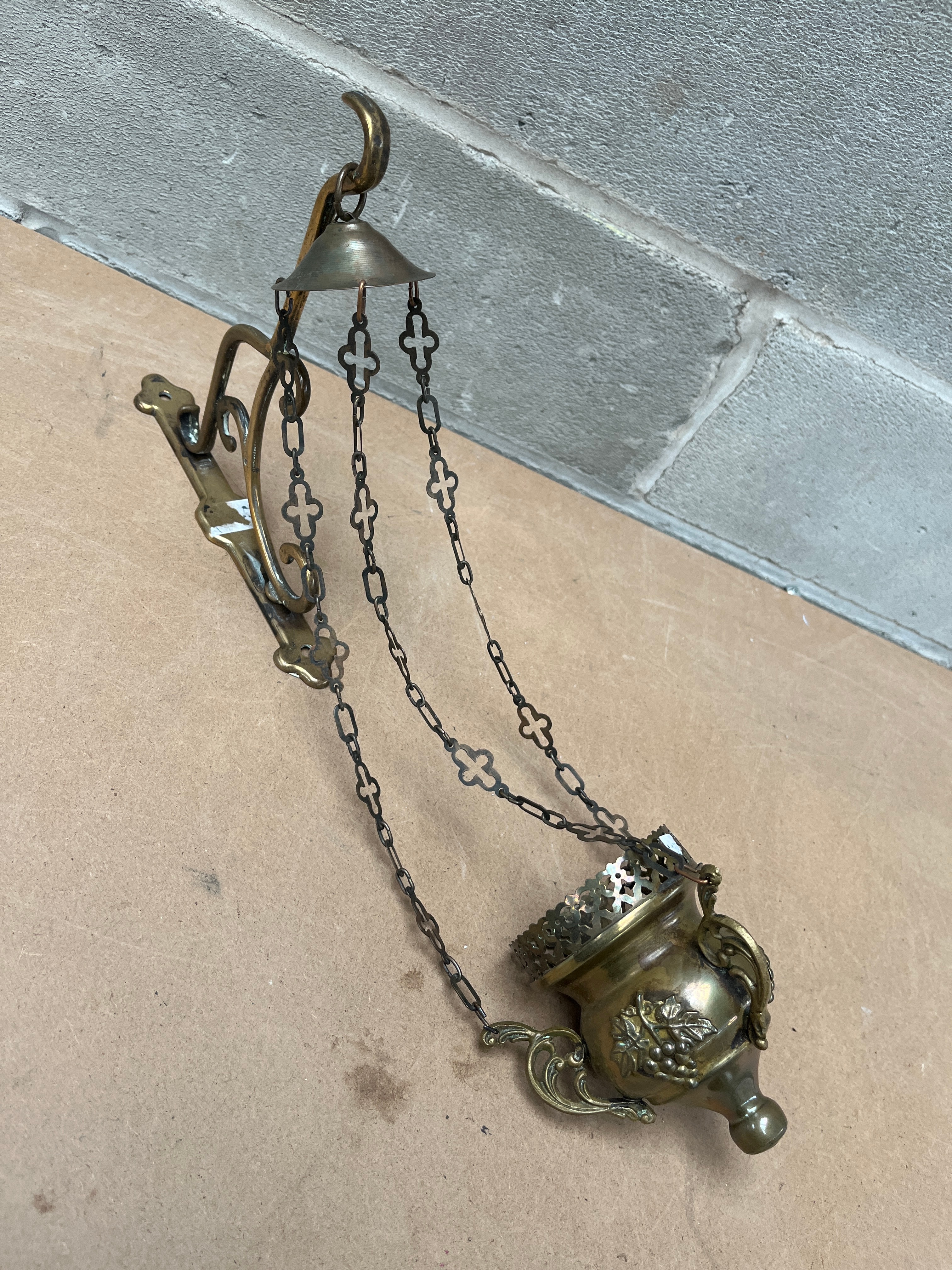 An antique brass ecclesiastical censer or thurible, complete with a matching wall-mounted bracket. The censer features an ornate embossed design of grapevines and fruit on its body, a decorative pierced upper rim, and a pointed base. It is suspended by three chains, each link shaped as a quatrefoil cross, which converge and attach to the scrolled, wall-mounted bracket.