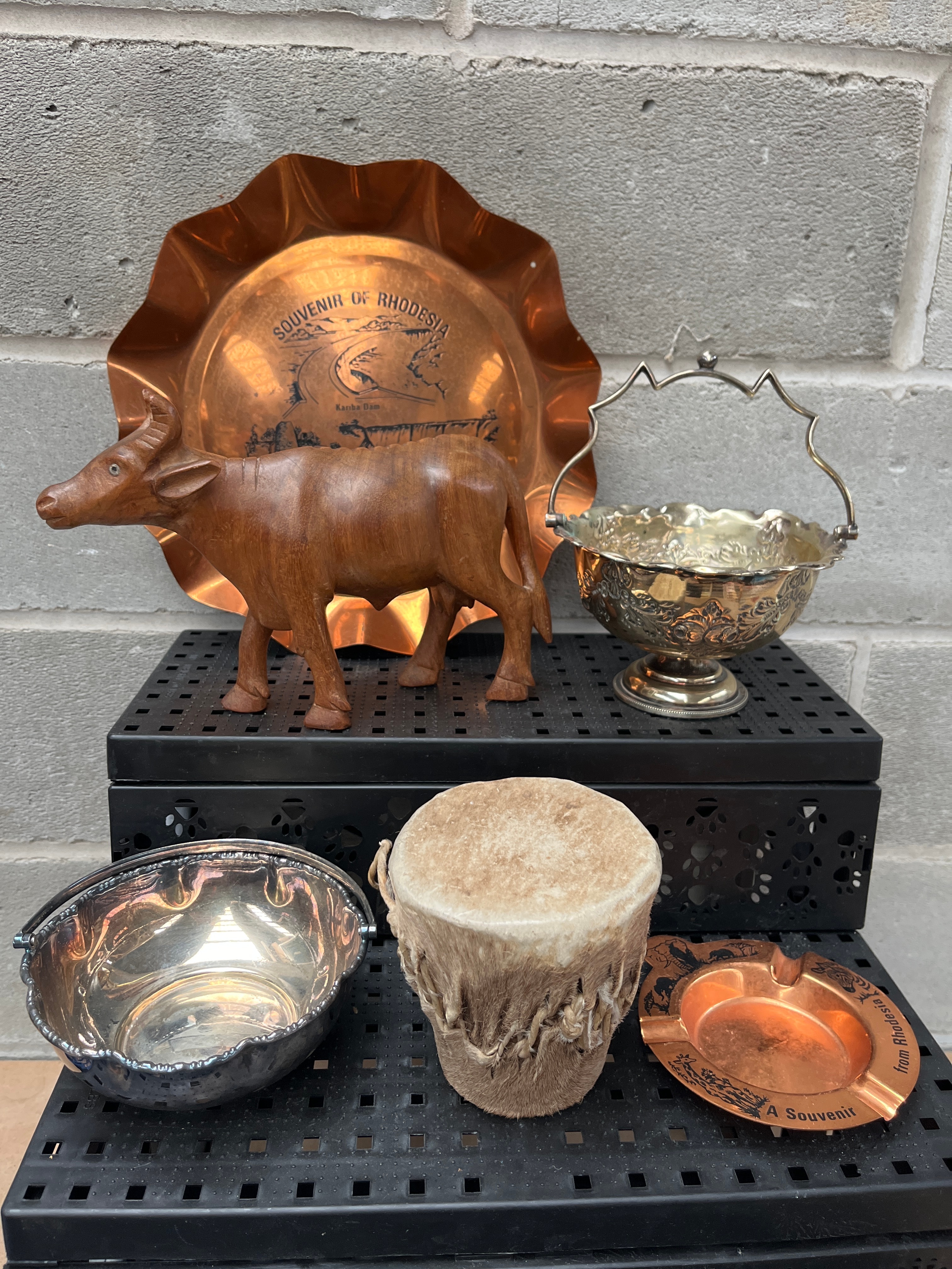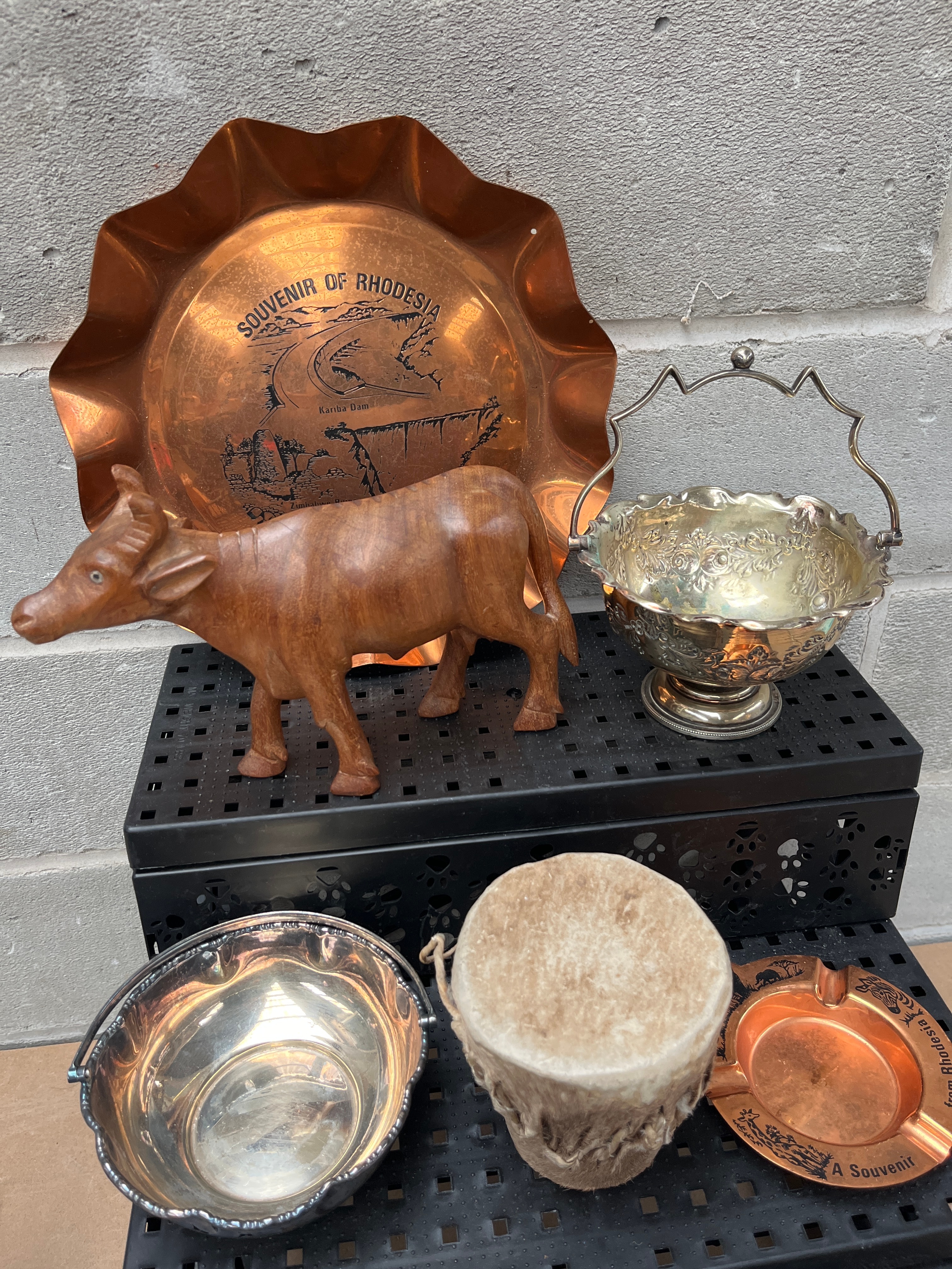 A collection of six assorted decorative and souvenir items. Comprising a large, scalloped copper tray etched with ‘SOUVENIR OF RHODESIA’ and ‘Kariba Dam’; a carved wooden figurine of a bovine animal; two silver-toned metal bowls, one footed with an ornate handle and the other with a simple bail handle; a small drum with a hide top and fur-covered body; and a small copper ashtray marked ‘A Souvenir From Rhodesia’ featuring an elephant. Materials present include copper, wood, silver-toned metal, and animal hide.