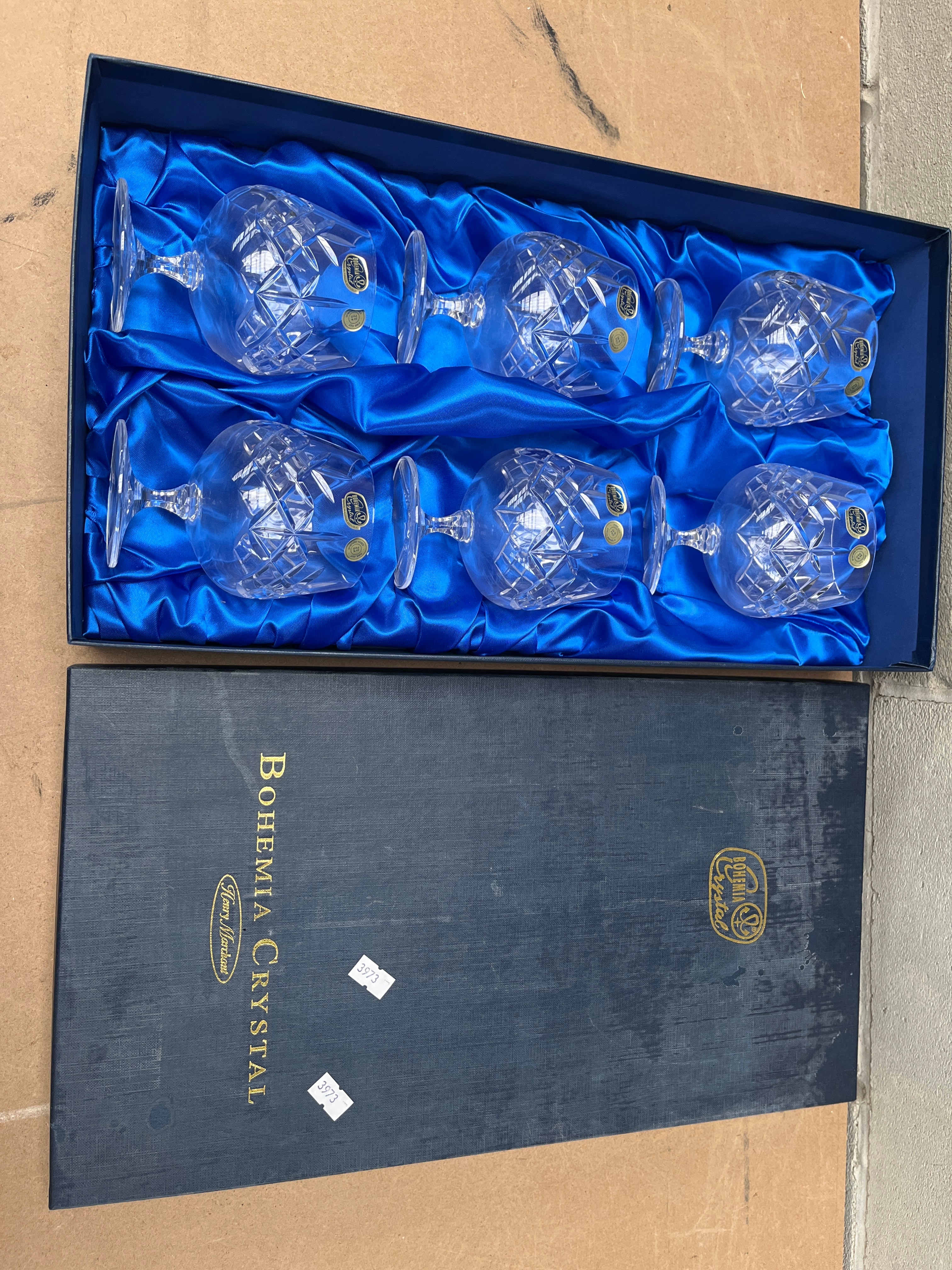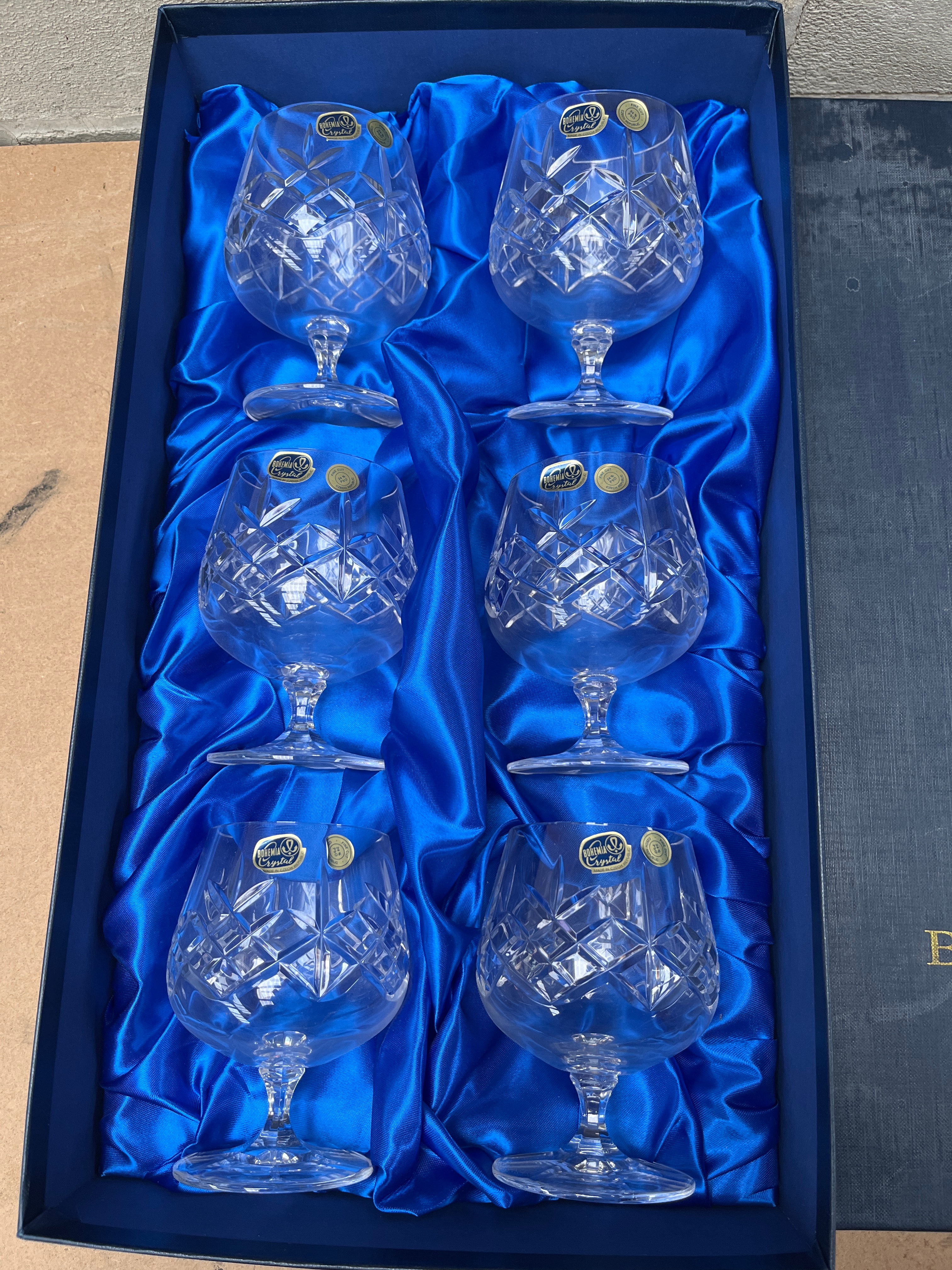 A cased set of six clear crystal brandy or cognac glasses, each featuring a classic deep diamond-cut pattern across its wide bowl and a short stem. The glasses are presented in a dark, hinged box with a deep blue satin interior lining, providing individual compartments for each glass. The box lid is marked ‘BOHEMIA CRYSTAL’ with ‘Hand Made’ beneath, and a circular logo containing ‘Genuine Crystal’. Each glass retains its small gold oval brand sticker, which also states ‘Genuine Crystal’ and ‘Bohemia Crystal’.