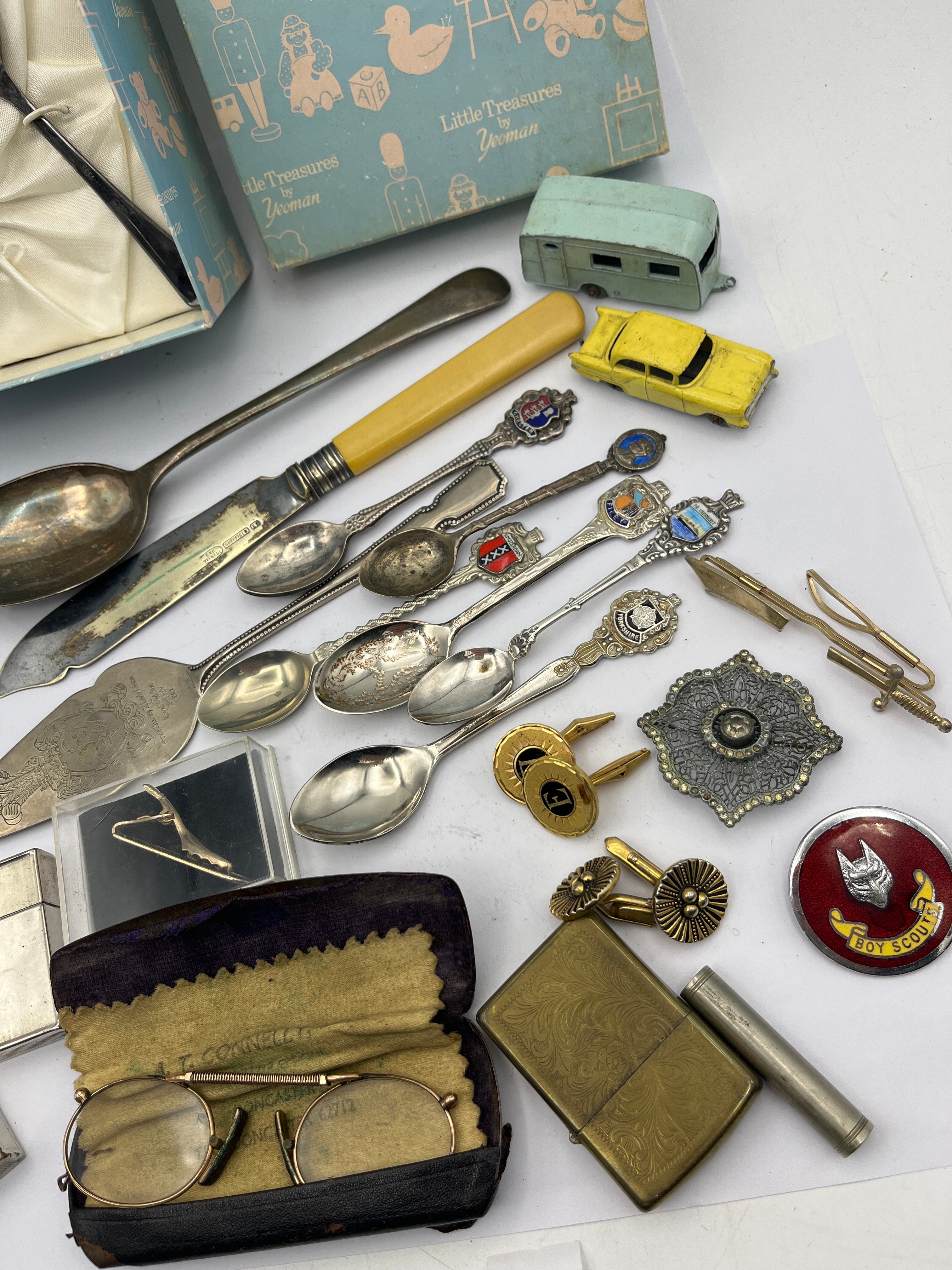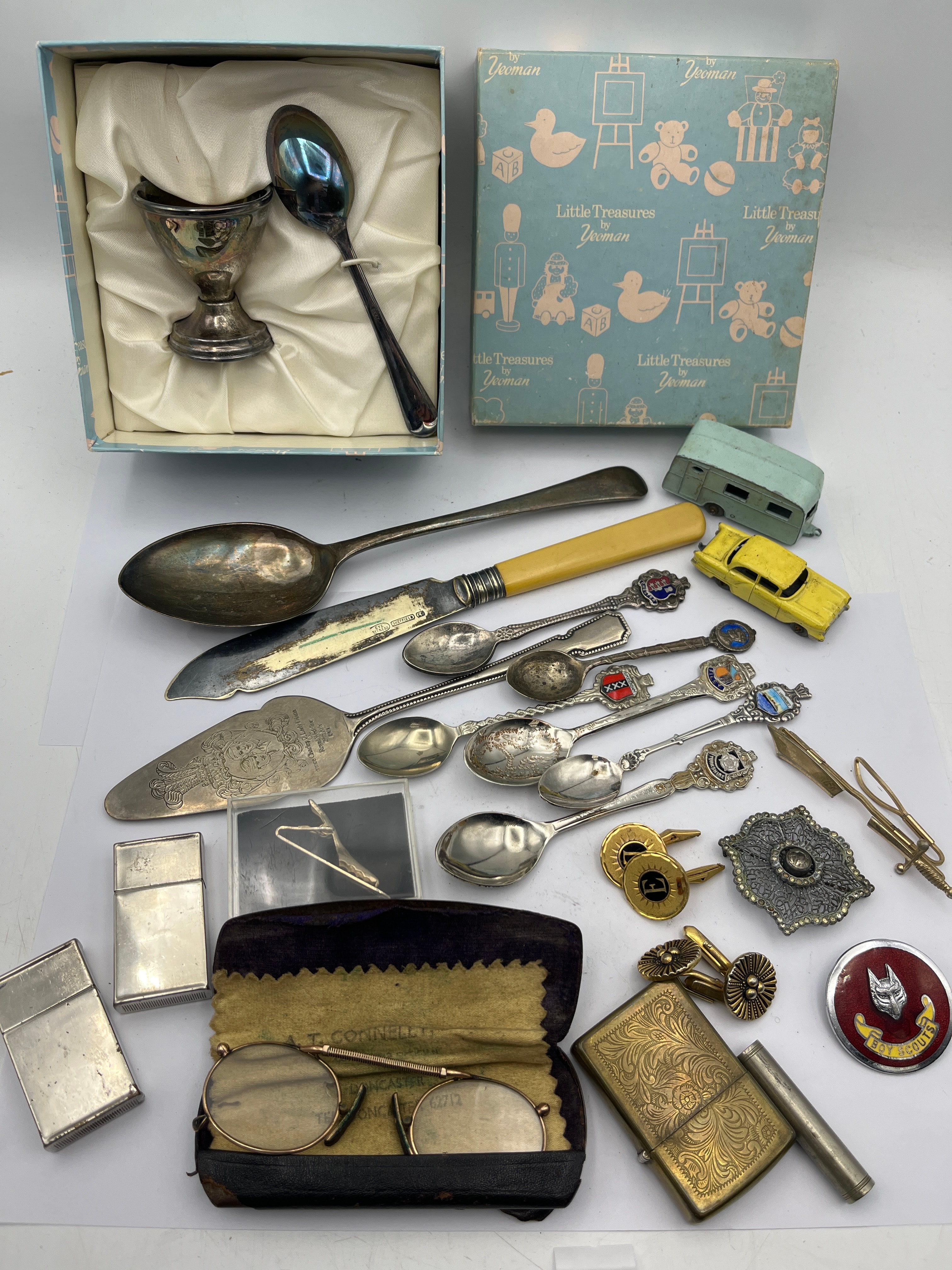 A varied collection of vintage and later personal accessories, flatware, and small collectables. The lot includes a cased silver-toned egg cup and spoon set by Yeoman, presented in an open blue “Little Treasures by Yeoman” box, with a matching closed box nearby. The assortment of flatware comprises a large serving spoon, a knife with a yellow handle, a decorative pie server, and a collection of silver-toned souvenir spoons, several adorned with enameled crests. Personal accessories feature a collection of Zippo-style and cylindrical lighters, including one gold-toned example with elaborate scrollwork; two pairs of gold-toned cufflinks; two tie clips; a large ornate silver-toned brooch or buckle; a money clip; and a pair of vintage wire-frame spectacles housed in a black “CONCASE LTD.” “PAT. PEND.” case. Completing the collection are a red circular “BOY SCOUTS” badge depicting a wolf’s head, and a pair of small toy vehicles: a light blue caravan and a yellow car.