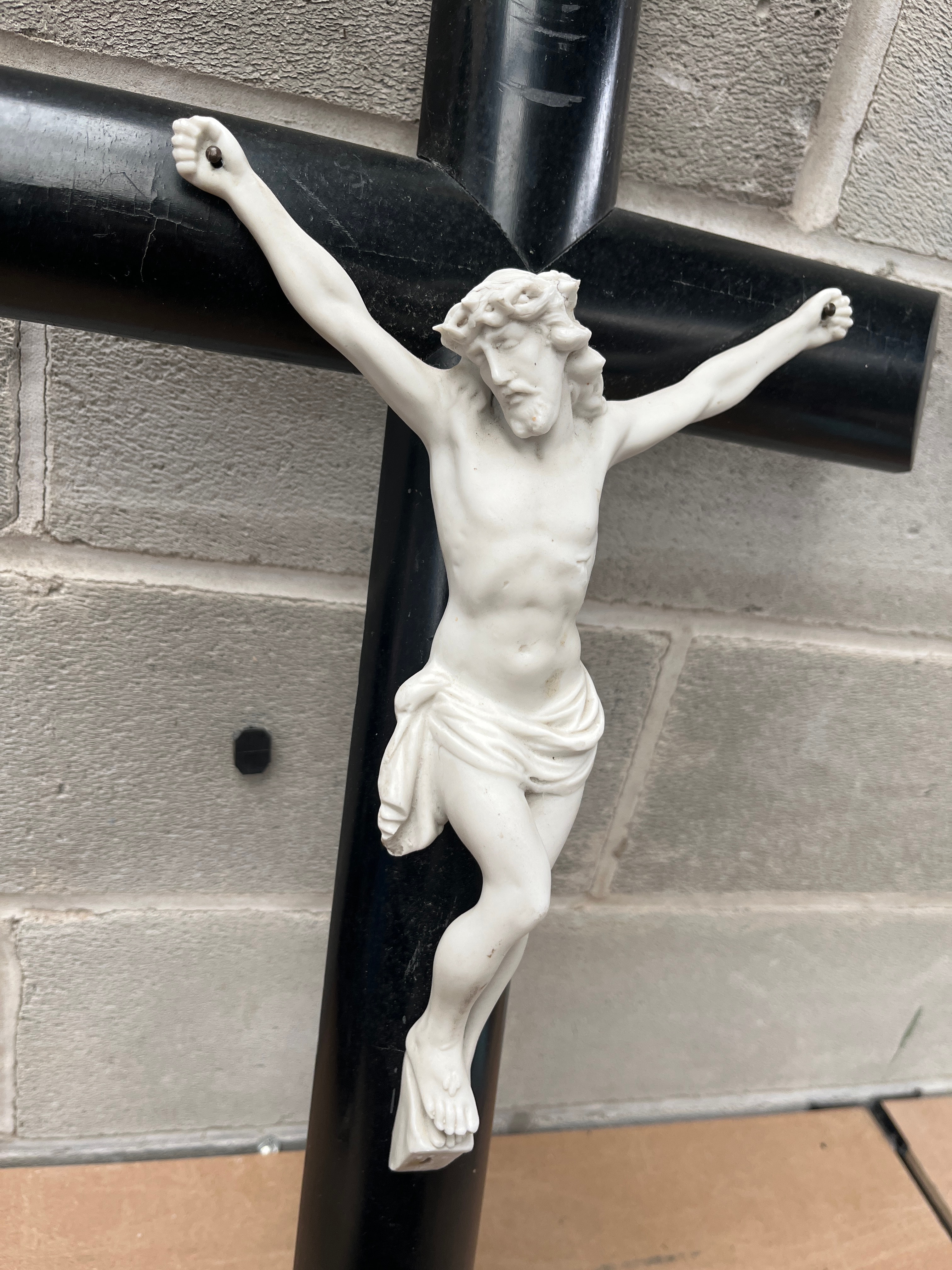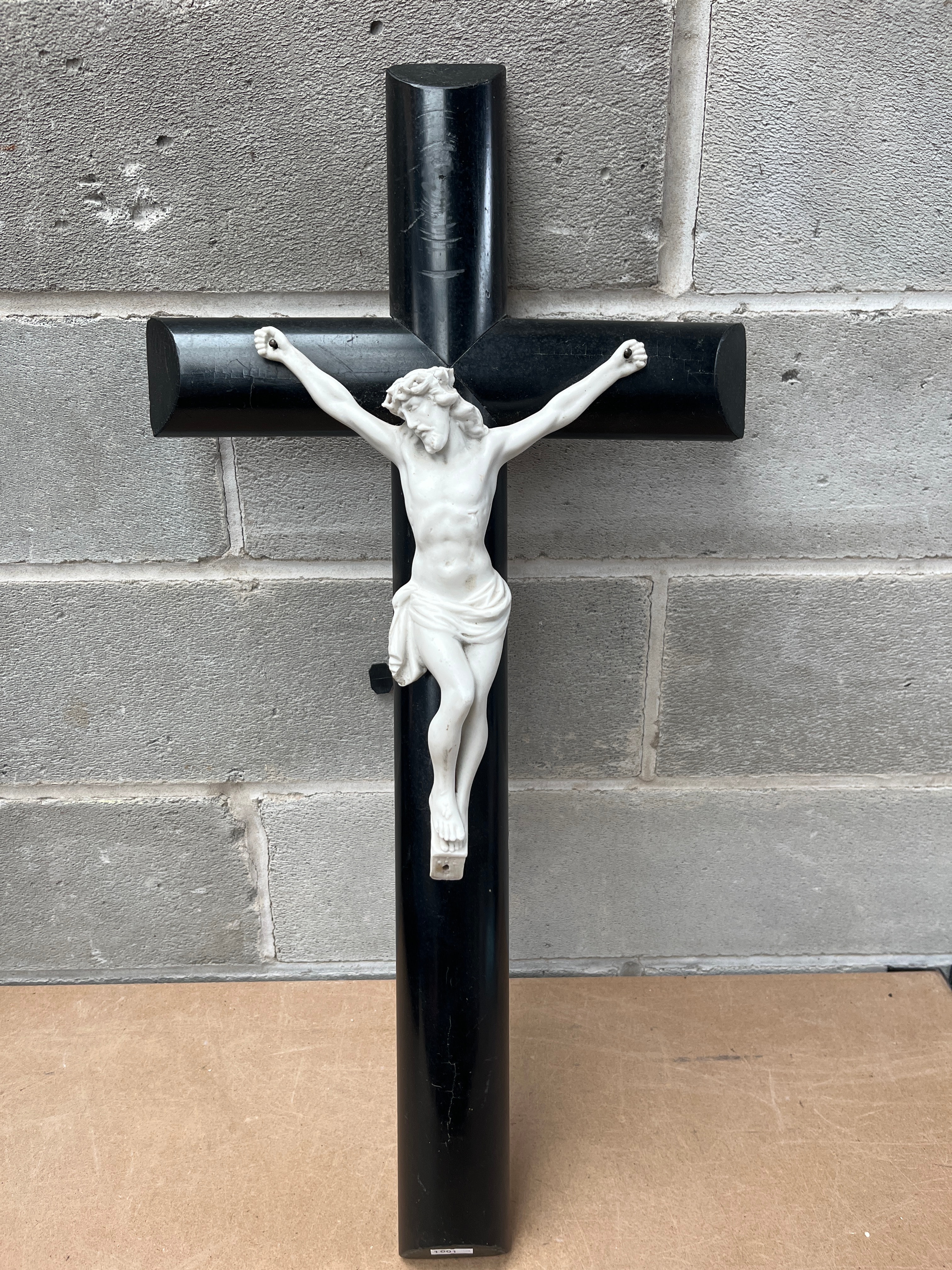 A traditional devotional crucifix, featuring a white corpus of Christ mounted on a dark, smooth cross. The cross appears to be crafted from either a stained dark wood or a dark synthetic material with a glossy finish, while the corpus is likely cast from a resin, plaster, or composite material designed to emulate marble or alabaster. The figure of Christ wears a crown of thorns and a loincloth, with hands and feet apparently affixed to the cross. A small, unreadable rectangular label or marking is visible on the bottom edge of the vertical beam; no other visible text or clear maker’s marks are discernible.