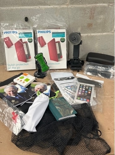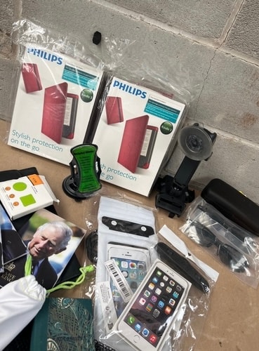 A diverse collection of modern personal accessories and electronics, predominantly composed of plastic, paper, and electronic components. The lot includes two new-in-packaging Philips-branded protective covers, labeled “Stylish protection on the go” and depicting a device with a “Kindle” logo, alongside two device mounts (one green, one black suction cup style). Also present are a black sunglasses case containing sunglasses, two smartphones (appearing to be iPhones) housed in clear protective pouches with visible app screens and barcodes, a small green embossed book-like object, and various small electronic cables and accessories. Promotional materials featuring images of King Charles III are interspersed, along with a small box of green stationery items, a white drawstring bag, and a black mesh drawstring bag containing other sundry items.
