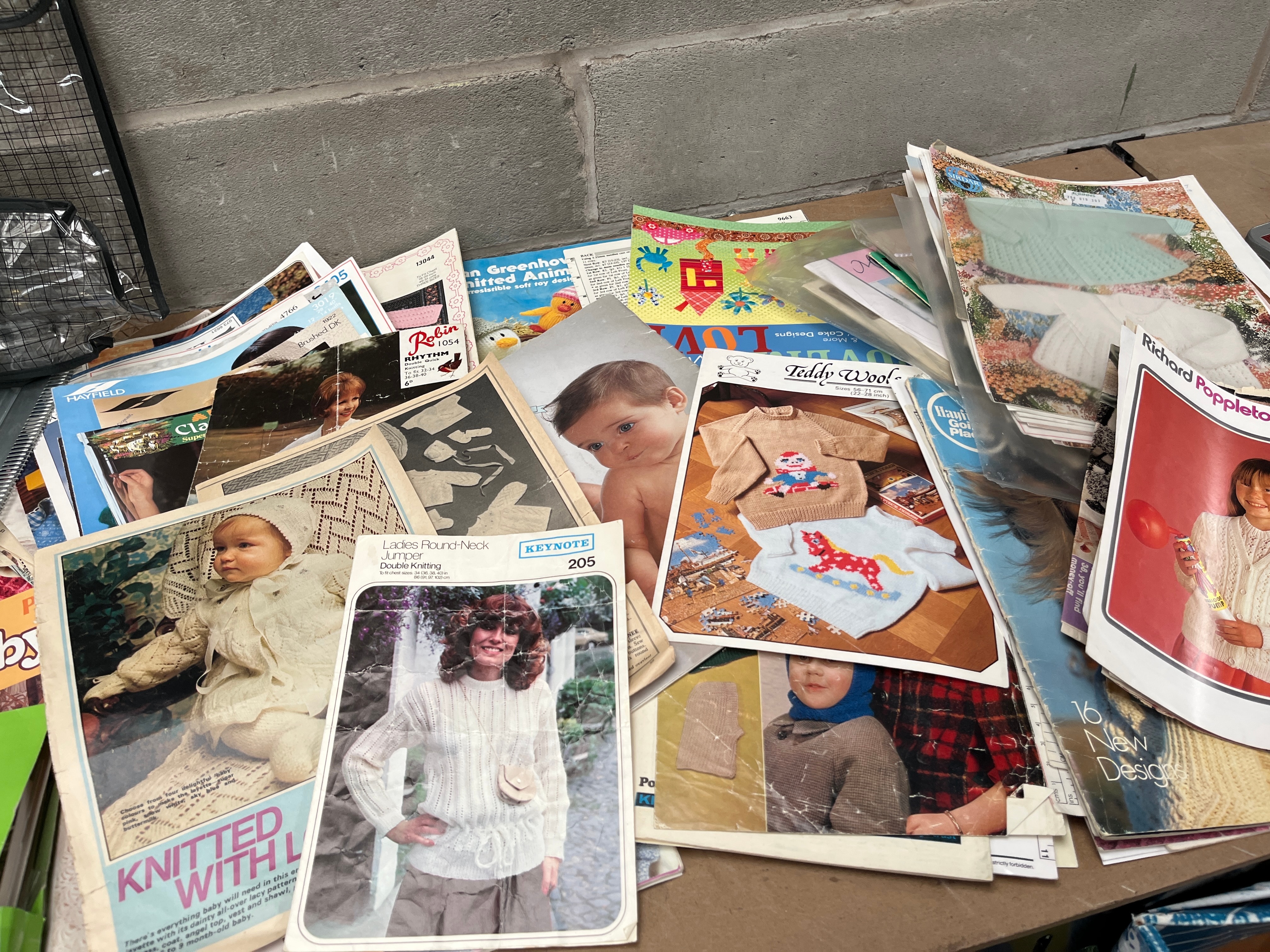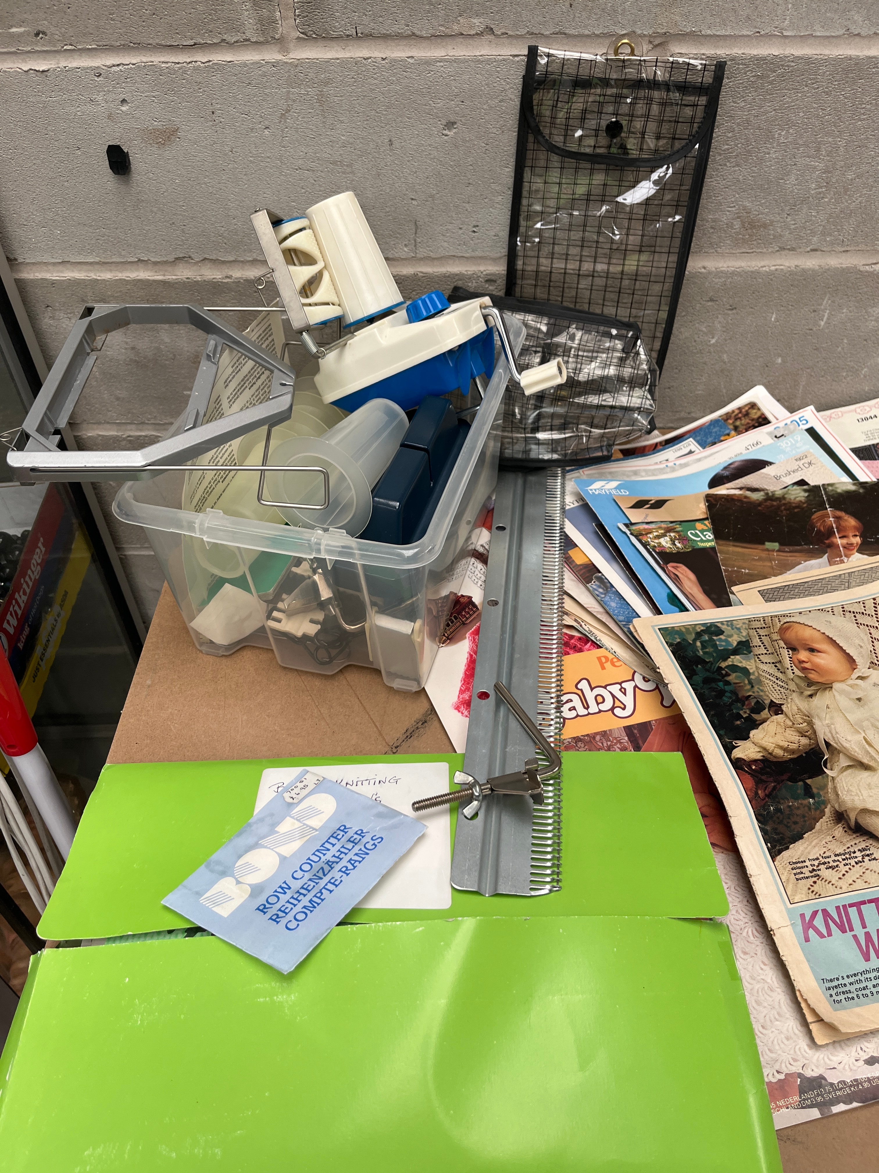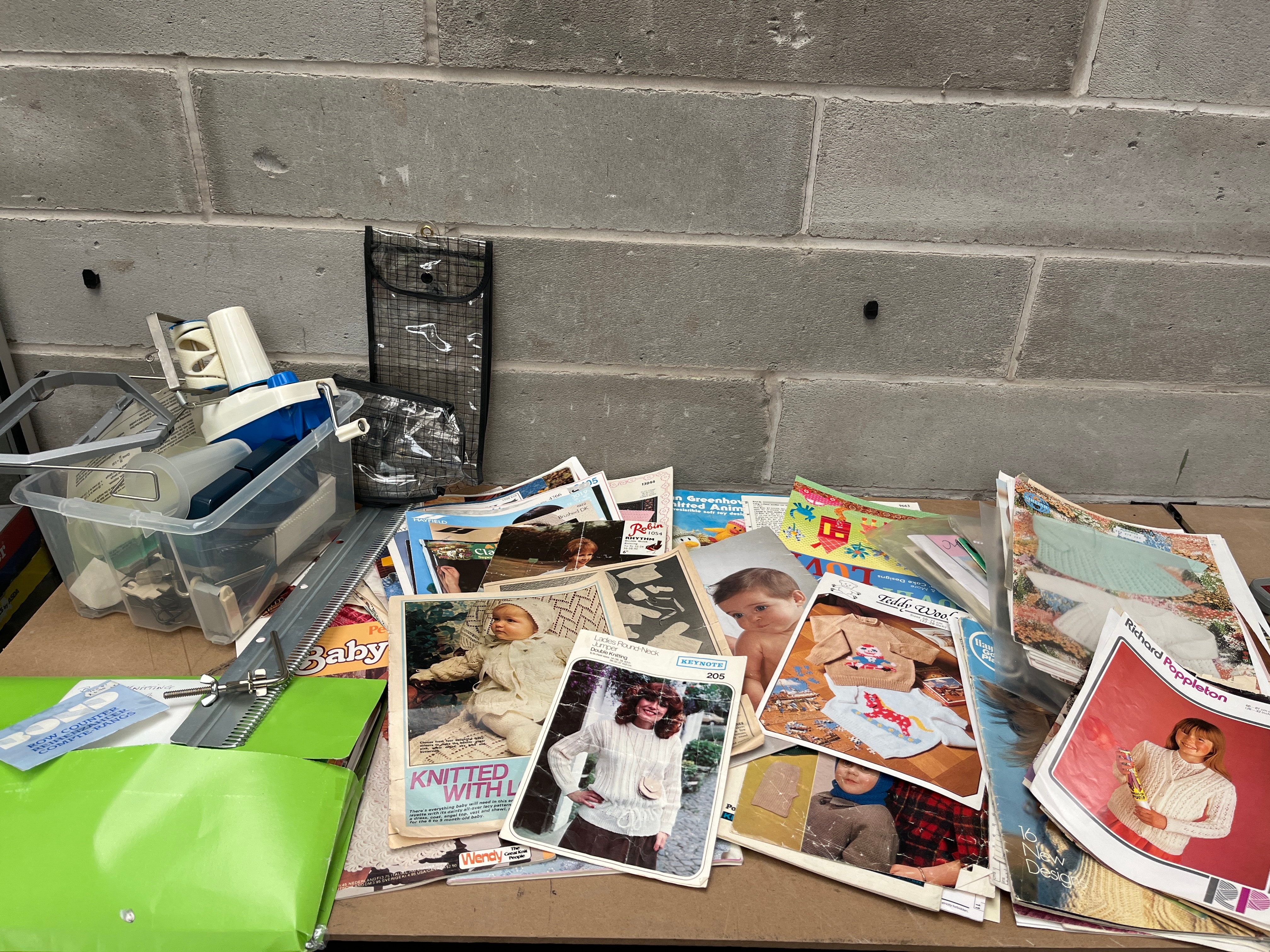 A collection of primarily paper-based vintage-style knitting patterns and craft magazines, likely dating from the mid-to-late 20th century. The patterns feature various knitted garments for babies, children, and adult women. Visible text on the patterns includes ‘Richard Poppleton’, ‘Teddy Wool’, ‘Wendy’, ‘Robin Knitwear’, ‘Keynote 205’, ‘Baby’, and ‘Knitted with L…’. The lot also includes a green folder marked ‘KNITTING’. Complementing the patterns are assorted plastic and metal crafting tools housed in a clear plastic bin, which include a yarn winder, bobbins, and a metal knitting needle gauge. A small blue card clearly indicates a ‘ROW COUNTER’ (‘COMPTE-RANGS’ in French).