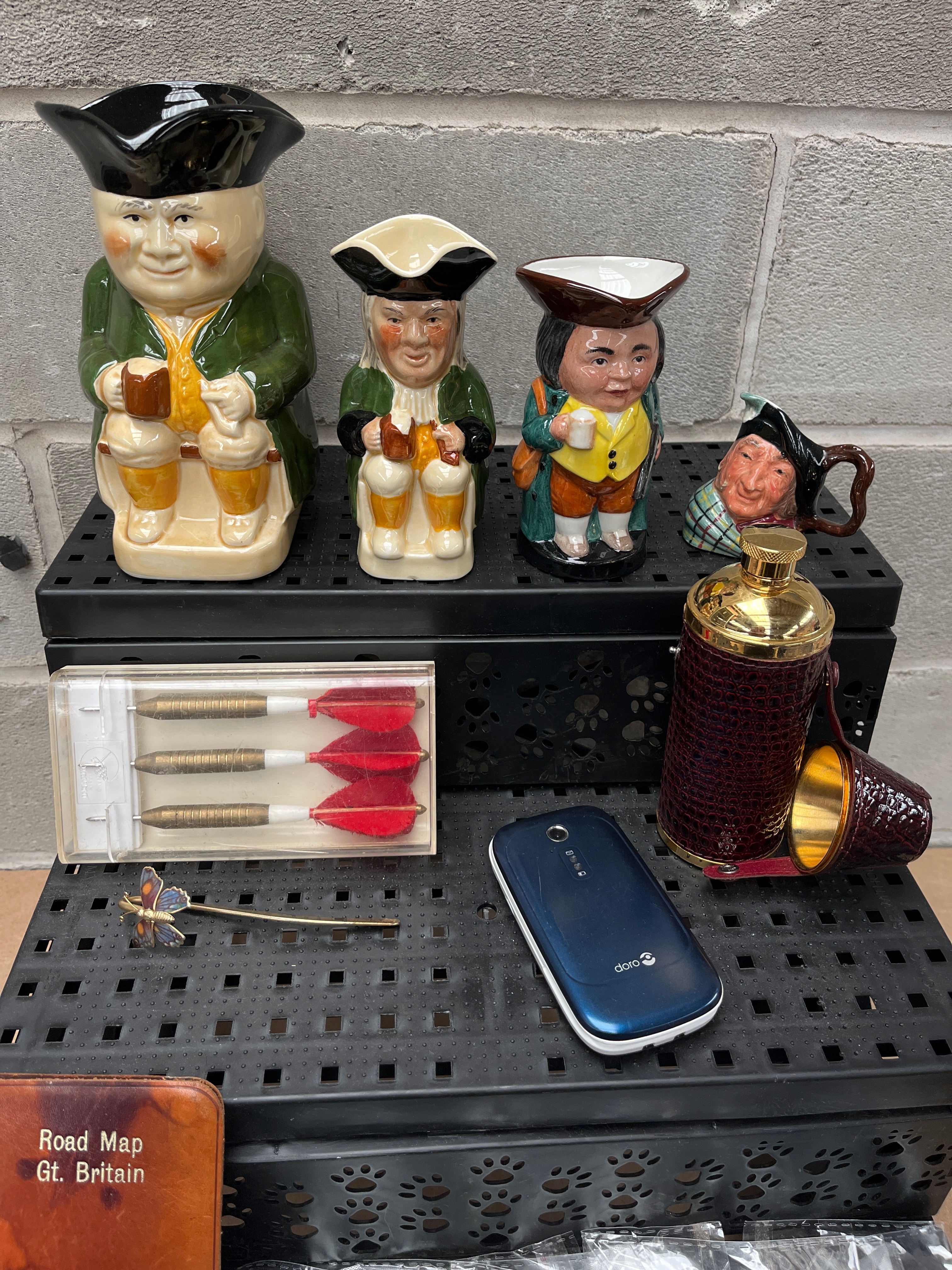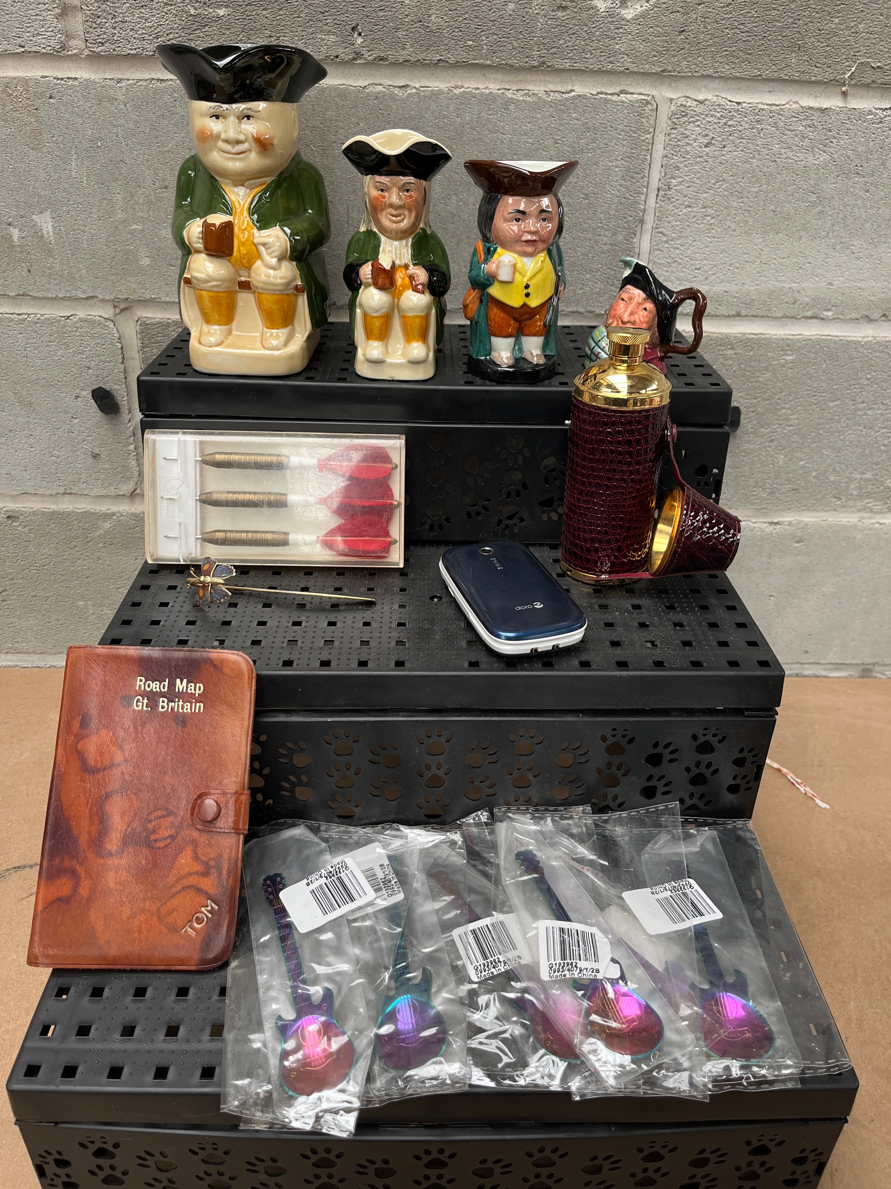 A collection of four figural glazed ceramic character jugs depicting gentlemen in traditional attire. Also included is a boxed set of three darts with gold-colored barrels and red flights, a dark blue Doro-branded flip phone, and a brown leather or faux-leather cased hip flask with a gold-toned metal cap and accompanying cup. The lot further comprises a gold-toned metal stick pin with a butterfly motif, a brown leather-bound booklet titled ‘Road Map Gt. Britain’ with ‘TOM’ embossed on the lower right corner, and a group of five individually packaged novelty spoons, each featuring an iridescent bowl and a guitar-shaped handle.