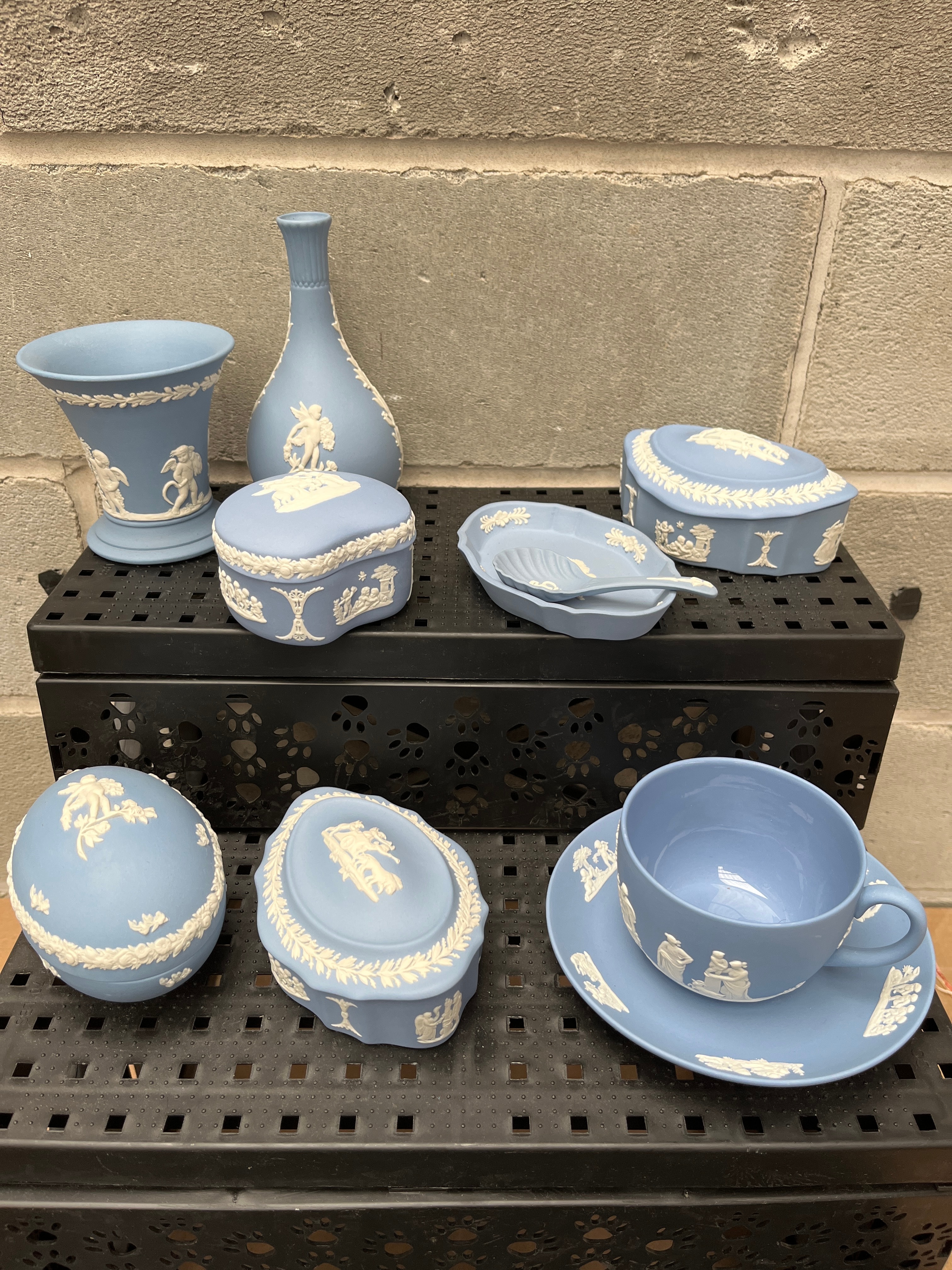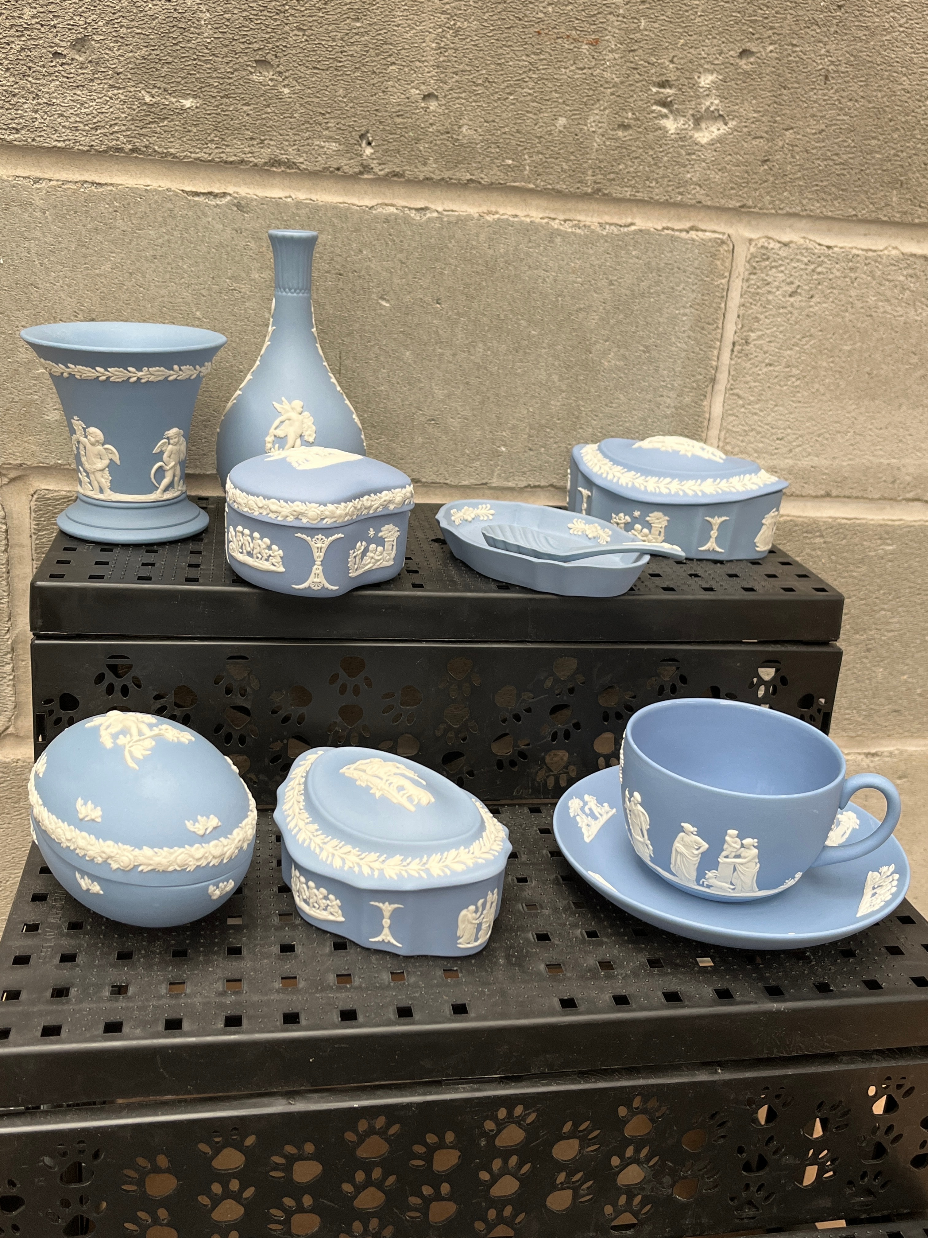 A collection of Wedgwood Blue Jasperware ceramic items, comprising two vases (one fluted urn-shape and one bottle-necked), three various lidded boxes (two oval and one rectangular), a small covered dish, and a cup with a matching saucer. Each piece features white bas-relief decoration in a Neoclassical style, depicting classical figures, mythological scenes, and decorative borders of garlands and foliage.