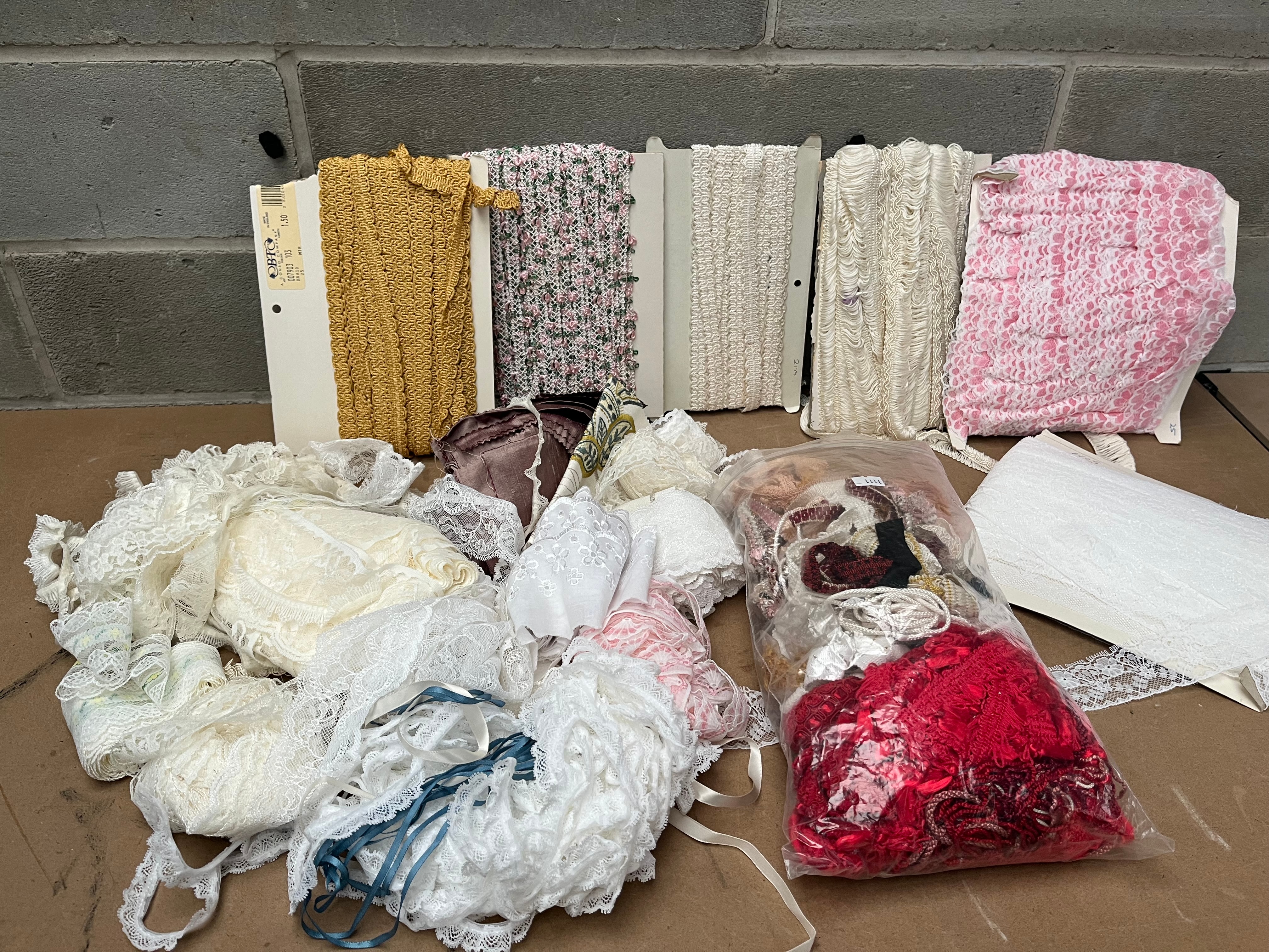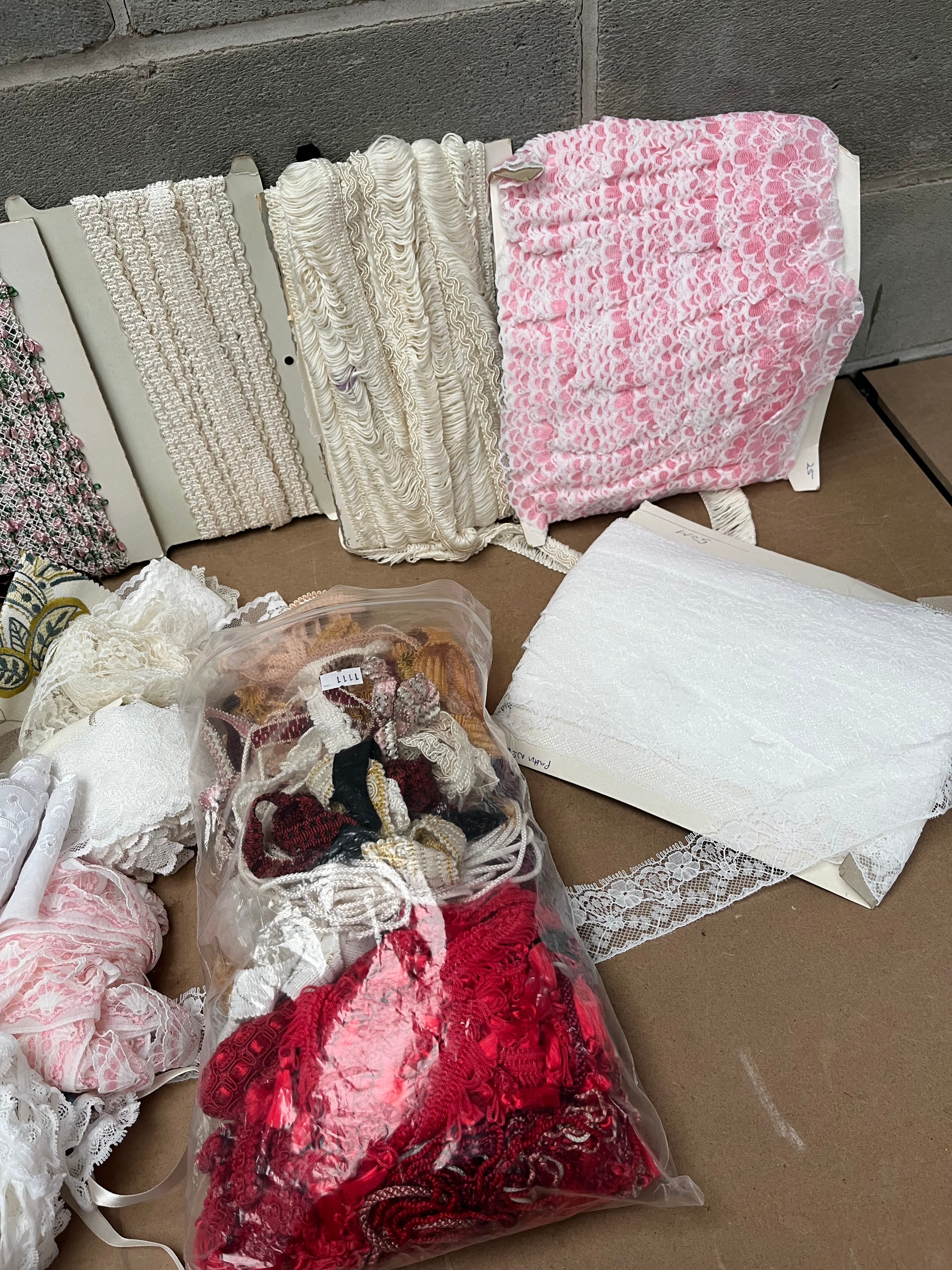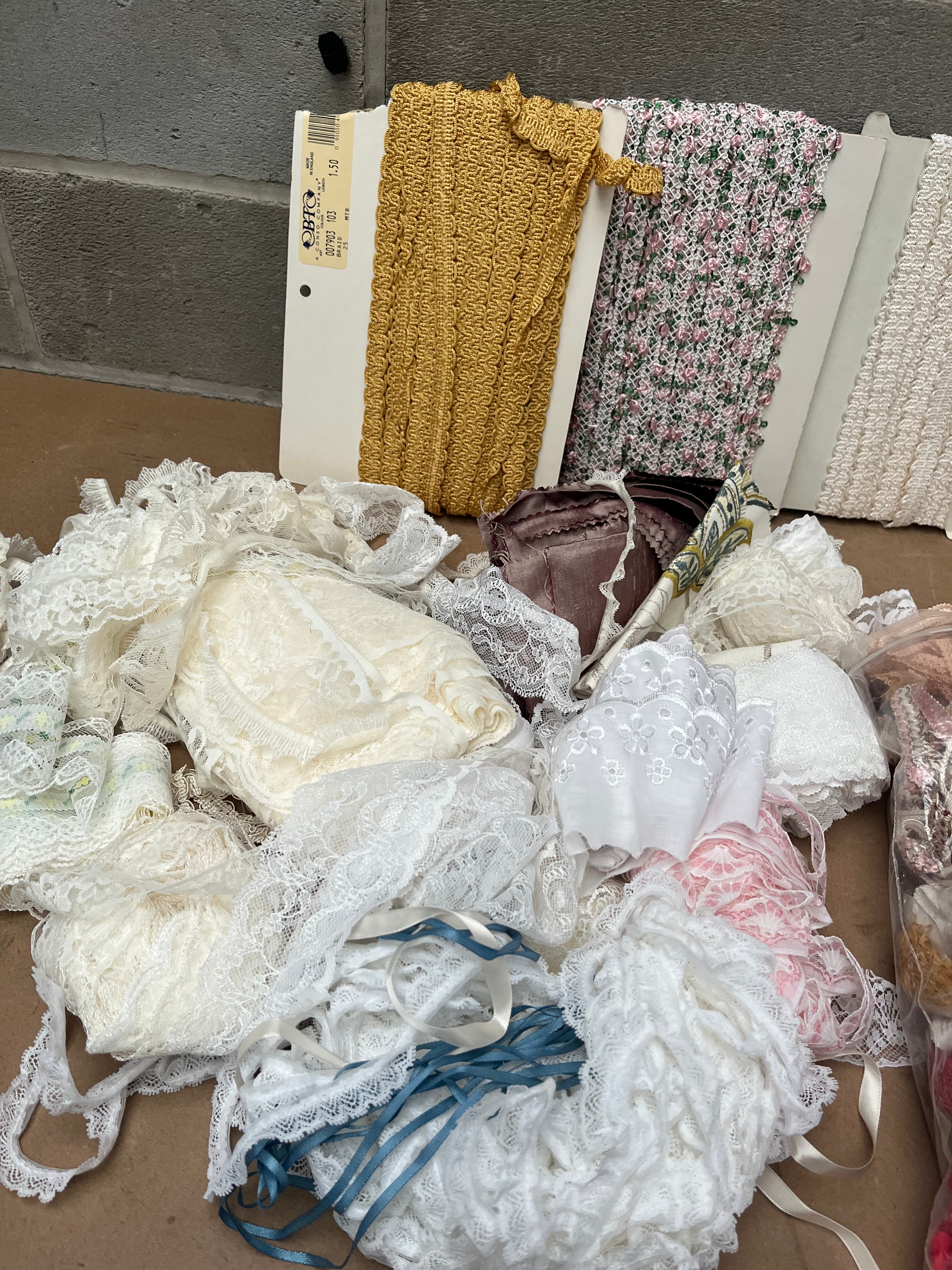 This lot comprises a substantial and varied collection of textile trimmings, including numerous styles of lace, ribbon, braid, and fringe. Items are presented both on original retail cards and as loose assortments. Carded items include a yellow braided trim, a floral patterned ribbon, various cream-colored woven and ruffled trims, and a wide pink lace. One visible label on the yellow trim reads “BTC BRAID TRIM, ITEM NO. D11, COLOR 101, 10 YDS,” alongside Japanese text translating to “Braid Trim, Item Number, Color Number, Length, Unit,” suggesting a modern manufacturing period for that specific item. The loose items consist of large piles of white and off-white lace in diverse patterns and widths, interspersed with blue ribbons and wider brown/burgundy fabric strips. A clear plastic bag contains an assortment of colorful trims, predominantly red fringe and gold braids, marked with a white sticker reading “1118.” The materials appear to be various textiles, likely synthetic blends.