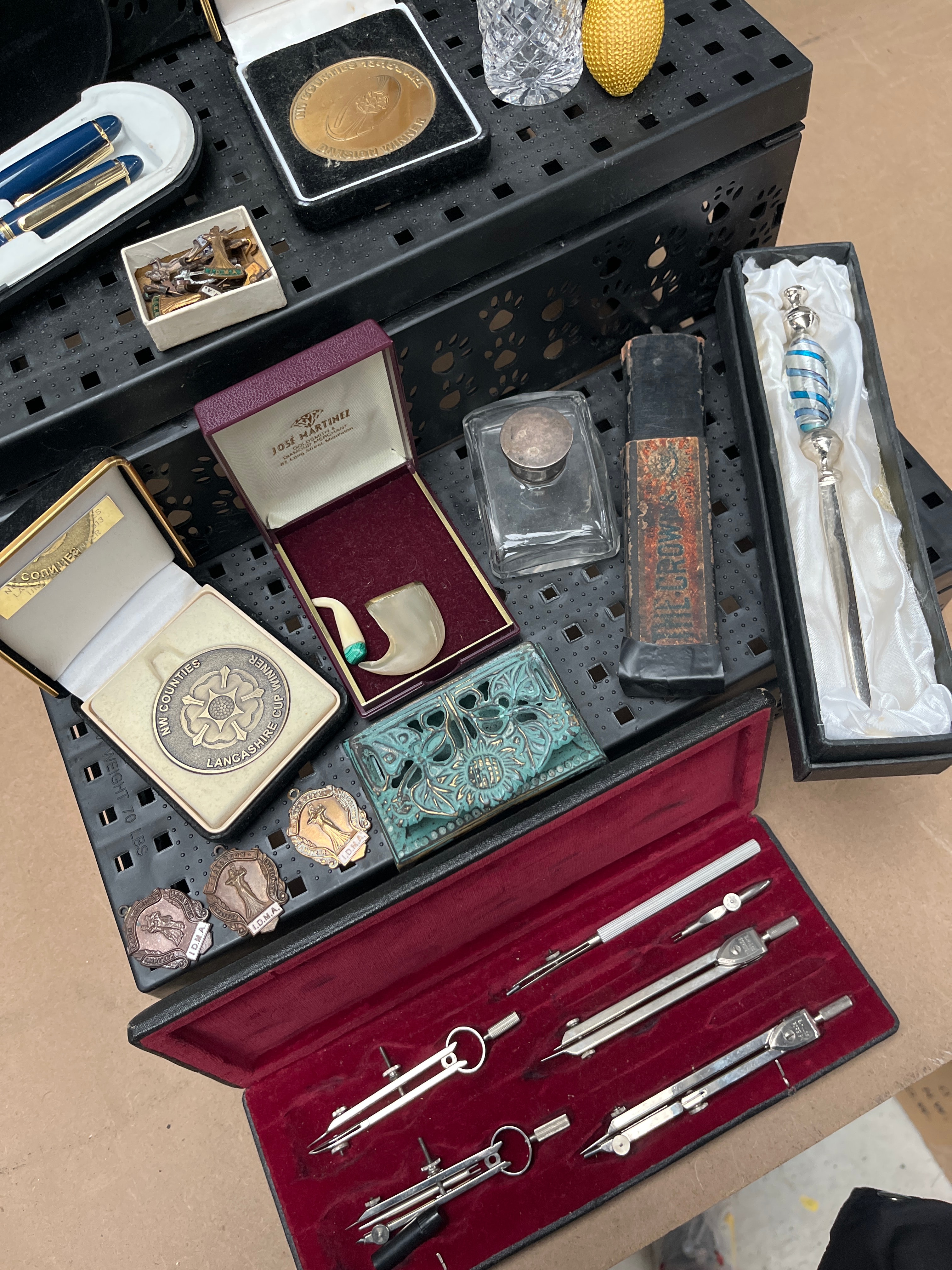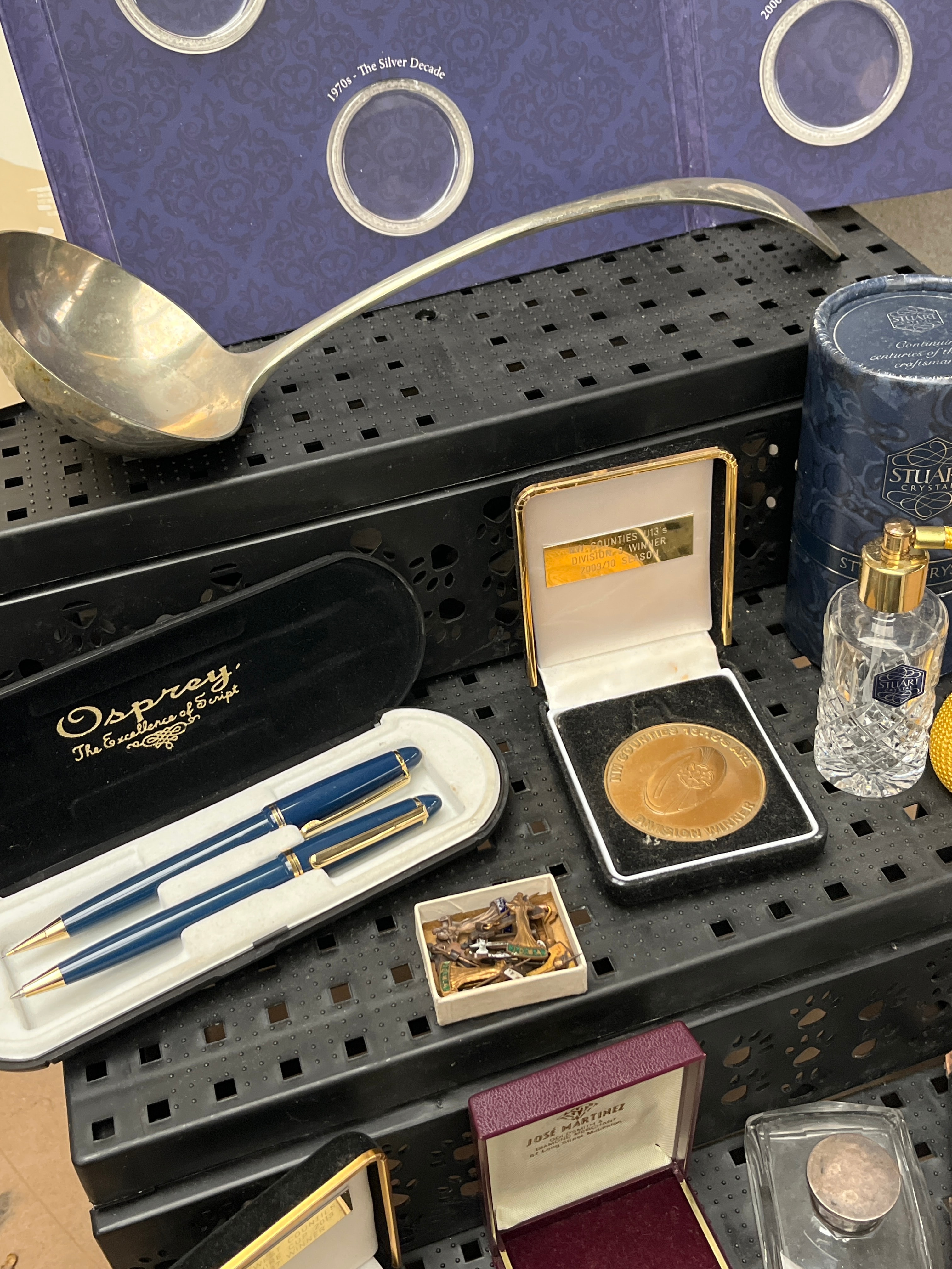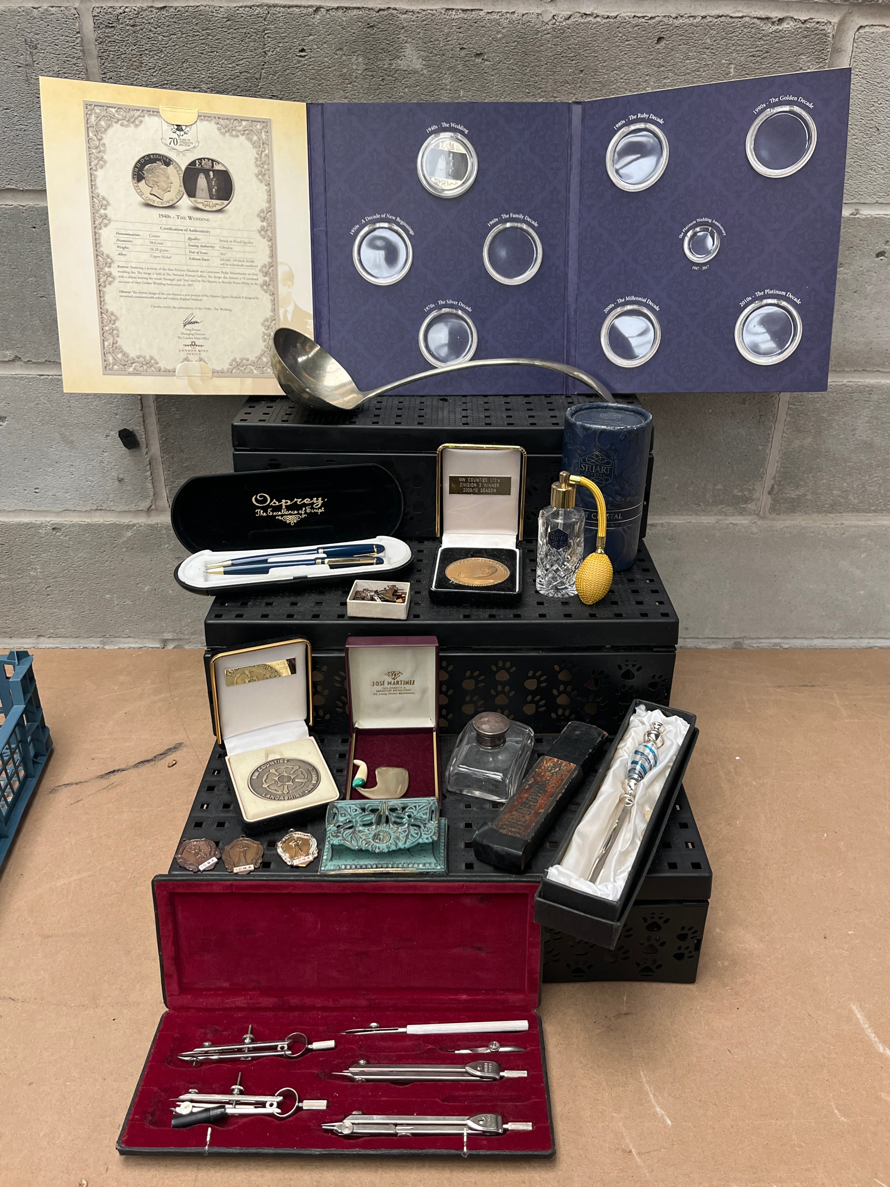 A diverse collection of personal and collectible items, primarily appearing to be from the late 20th to early 21st century. The lot includes a commemorative coin/medal collection folio with an associated “Certificate of Authenticity” for the “Diamond Wedding 1947-2007,” referencing “The Silver Decade” (1970s) through “The Platinum Decade” (2000s). Also featured is a cased “Osprey – The excellence of Script” pen set containing two dark blue pens, a cased “JOSE MARTINEZ” pipe, a “STUART CRYSTAL” perfume bottle, and a silver-toned ladle. Further items comprise a cased decorative letter opener with a blue and white handle, and a cased set of silver-toned drafting instruments. The collection also includes several bronze-toned medals or medallions, one marked “WORCESTER – THE SHIRE / LANCASHIRE” featuring a rose emblem, a clear glass inkwell, a bottle labeled “INK,” and a rectangular, possibly brass, box with intricate turquoise-colored enamel or patina.