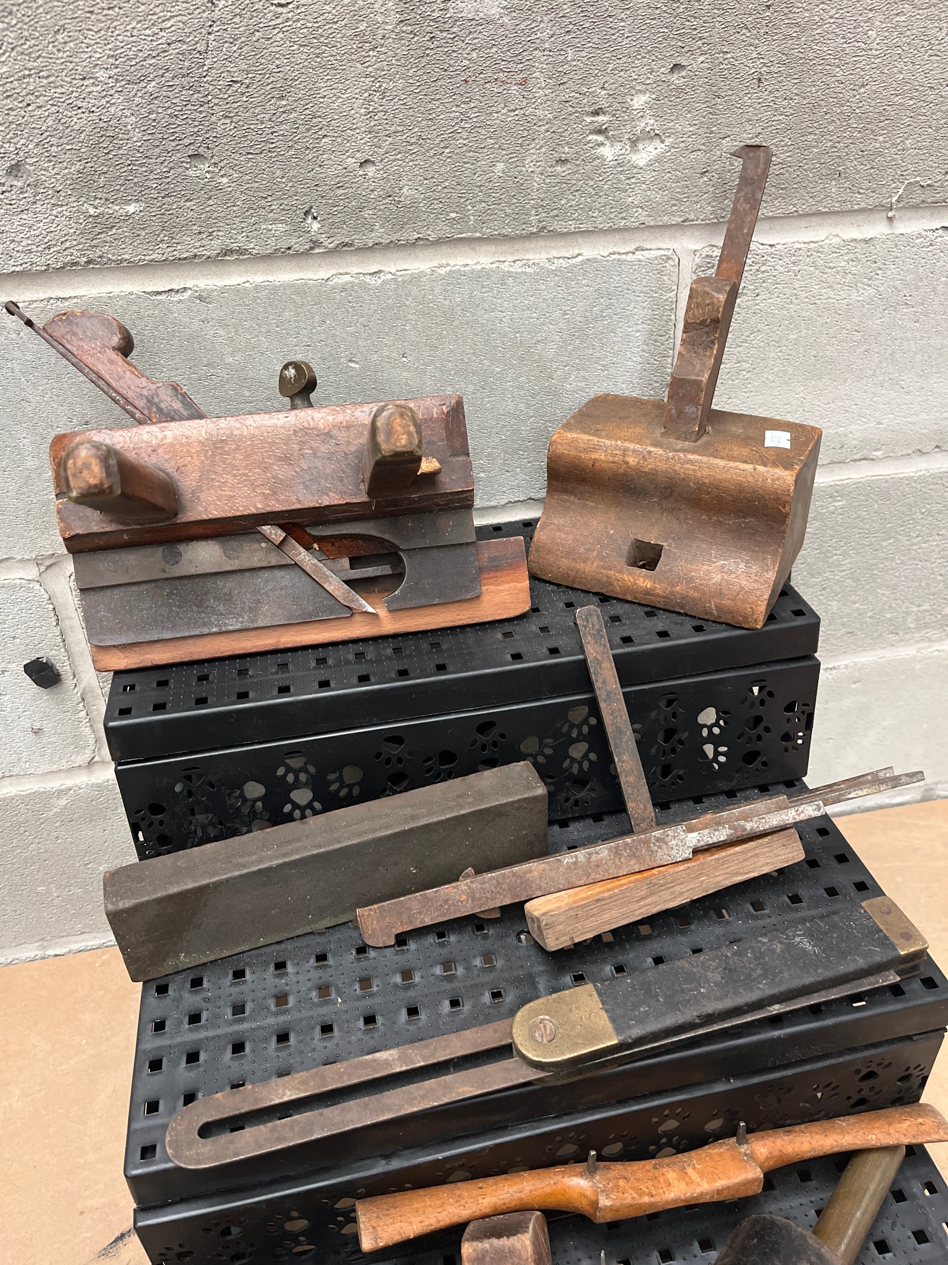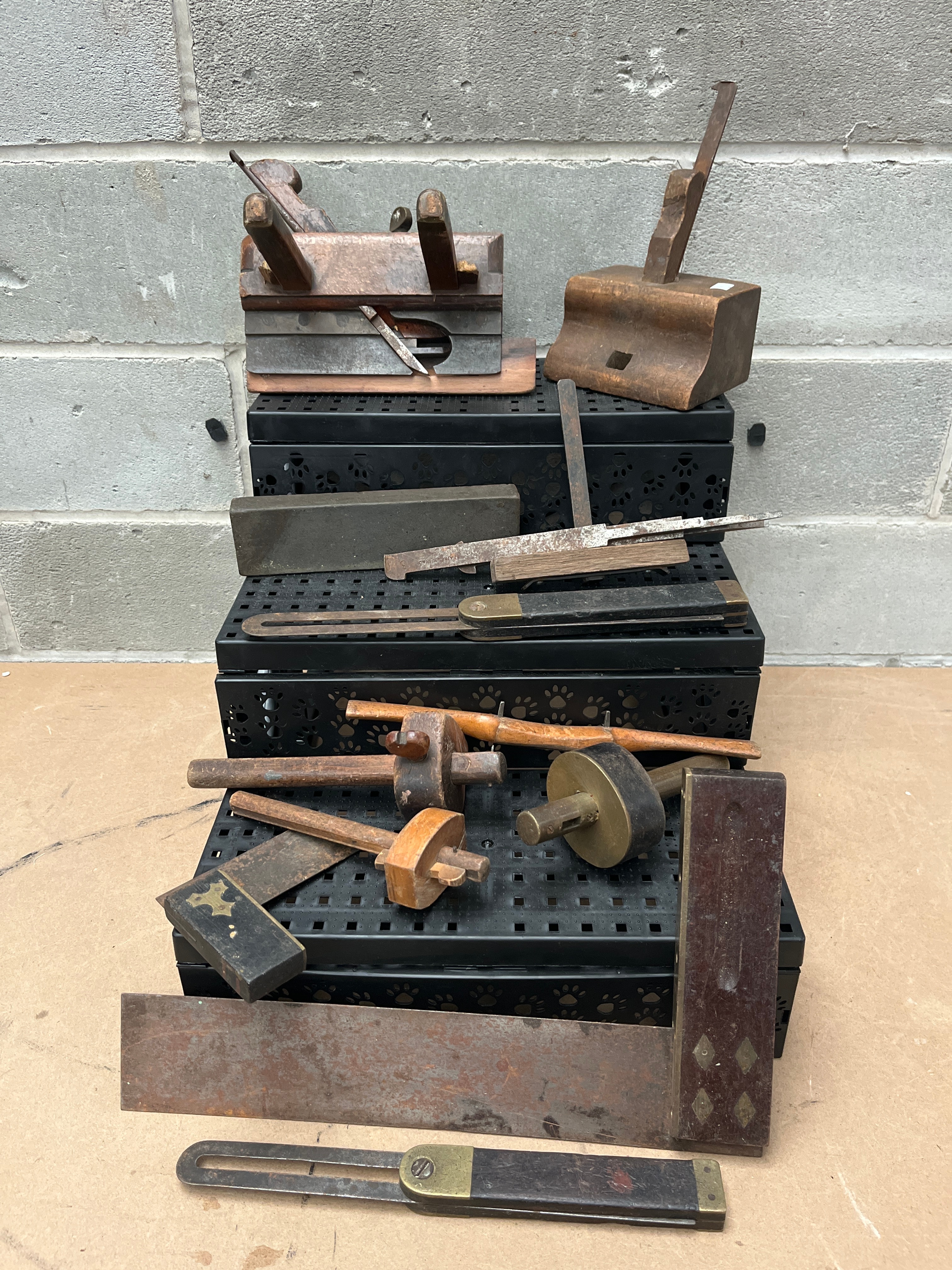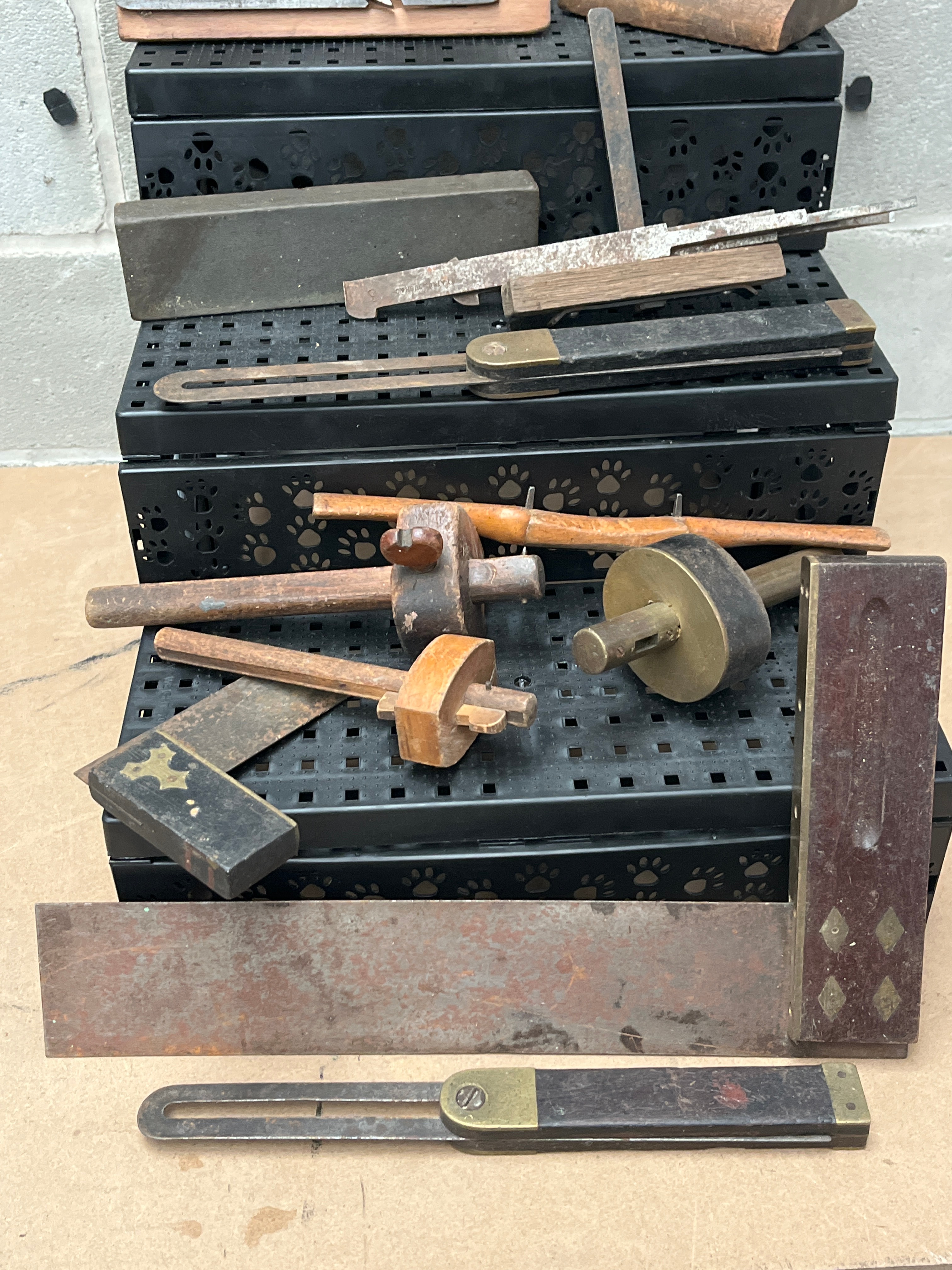 A collection of antique/vintage woodworking hand tools, prominently featuring a wooden plow plane. This lot comprises a wooden rabbet/molding plane (identified as a plow plane), various marking gauges including wooden and brass-headed examples, a wooden mortise gauge, two sliding bevel gauges, two try squares (one with decorative brass/wood inlay), a natural sharpening stone, and an assortment of metal rules, blades, and scribers. The tools are predominantly constructed from wood, steel, and brass. They exhibit a well-used condition, reflecting traditional hand woodworking practices, likely dating from the late 19th to mid-20th century. A gold-colored number ‘7’ is visible on a small black square-headed tool; no other legible manufacturer’s marks or text are discernible.