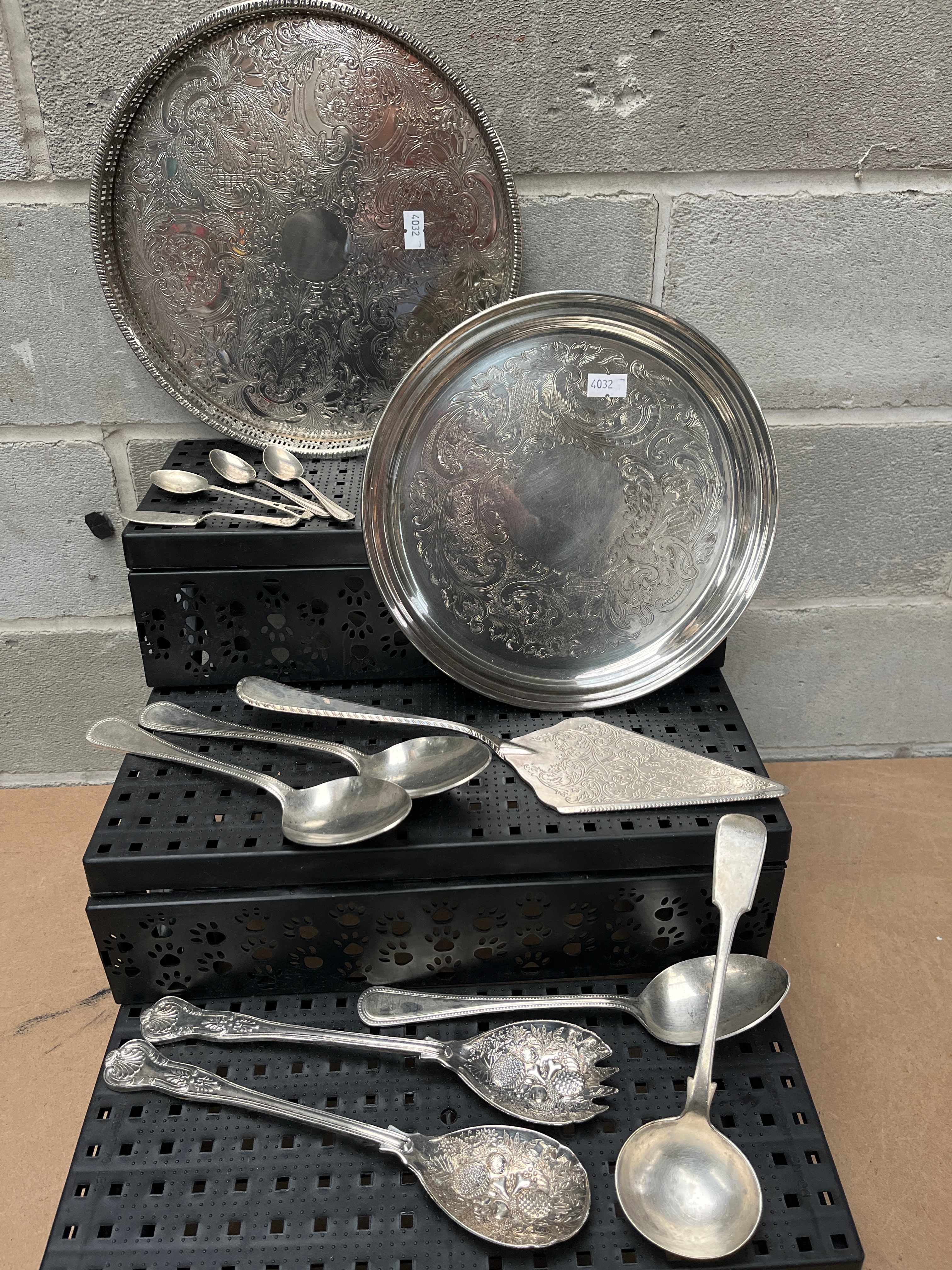 A collection of silverplate serving pieces and flatware, exhibiting a late 19th to early 20th-century decorative style characterized by intricate chased and embossed floral and scrollwork motifs. The lot includes two circular serving trays, one larger with a pierced gallery rim, both displaying ornate patterns. The trays bear white adhesive labels with numbers “4032” and “032” respectively. The accompanying flatware comprises various spoons of different sizes, a decorative pie or cake server, and a pair of large serving utensils with heavily embossed bowls depicting fruit and foliage, one of which is tined. The items are likely silverplate on copper.