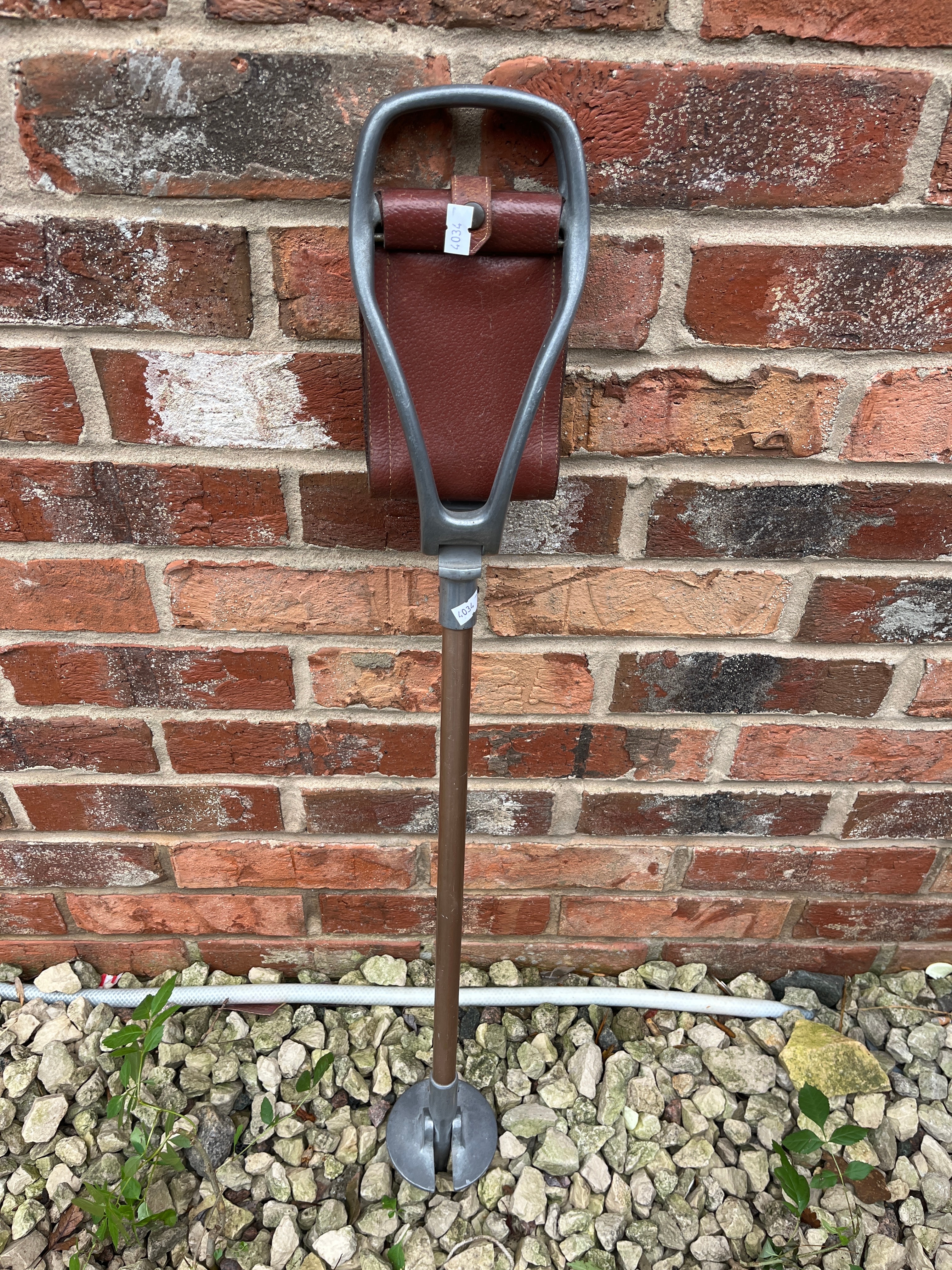 A modern folding seat stick, also known as a shooting stick. It features a U-shaped grey-finished metal frame that forms the handle and supports a dark reddish-brown leather or faux leather seat, which is secured by a strap and stud closure. This seat is mounted on a single brown-finished metal shaft, terminating in a circular, split grey-finished metal ground plate for stability. Two white adhesive labels with the number “4034” are affixed; one on the leather strap closure and another on the metal shaft below the seat hinge.