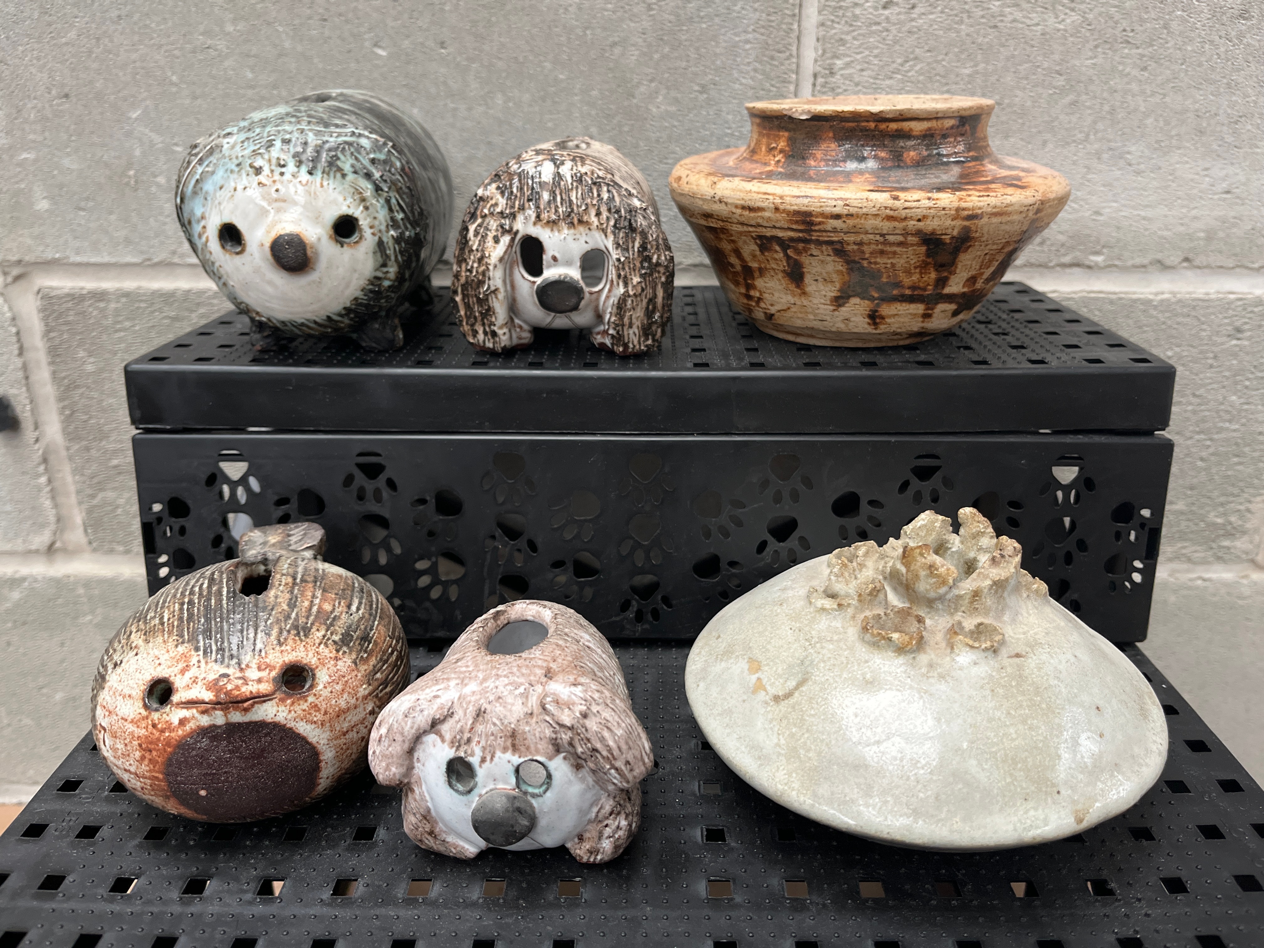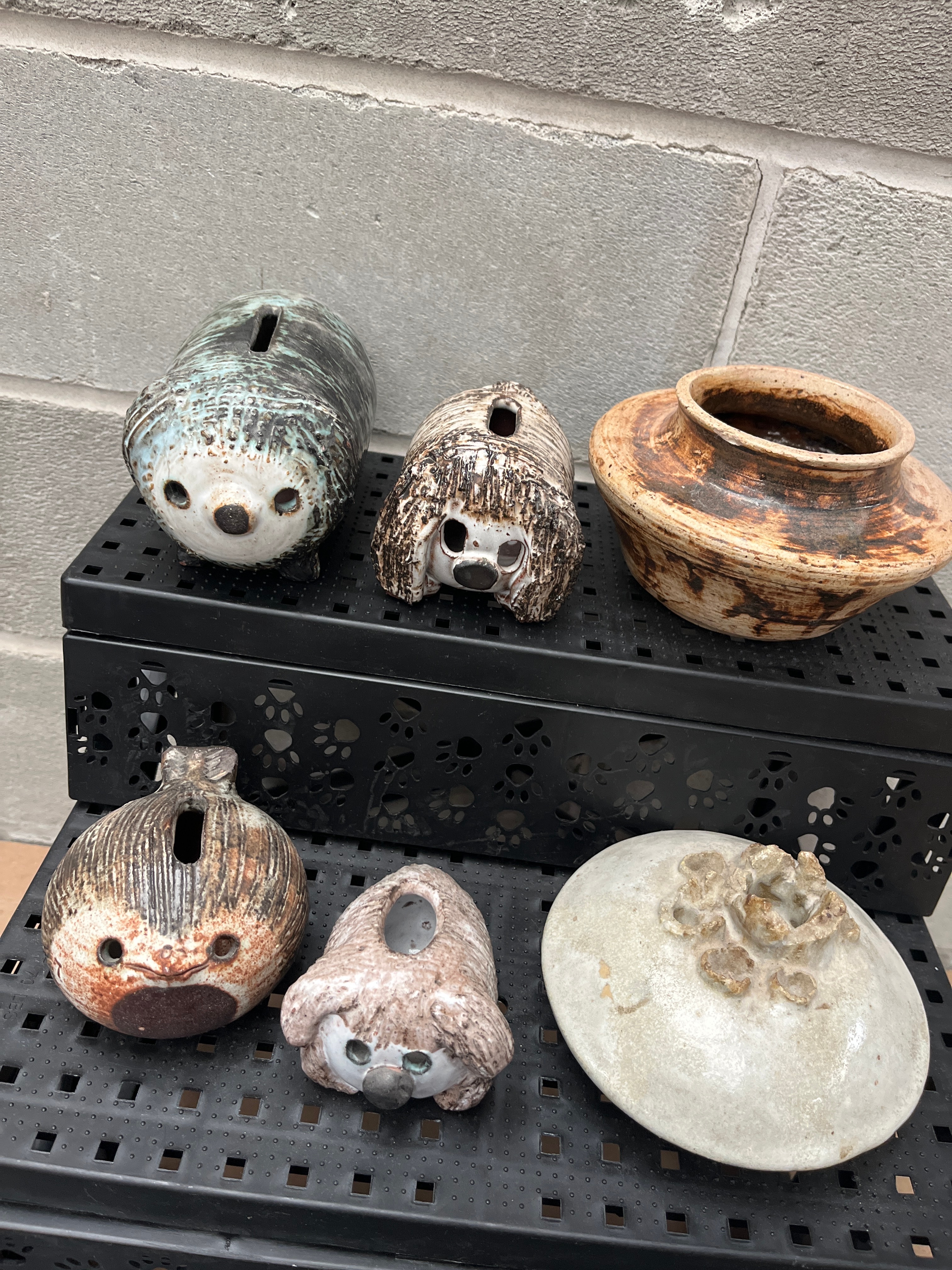 A group of six ceramic pieces attributed to Lindy Martin. This group includes four distinct stylized animal-form coin banks, a standalone rustic pot, and an organic-shaped lid. The objects display a studio pottery aesthetic, characterized by earthy glazes in shades of brown, cream, grey, and teal, with textured and speckled finishes. The animal forms are whimsical and abstract, while the pot features a classic, rounded profile with a splayed rim. The separate lid, decorated with clustered organic forms, appears consistent in style and material with the pot, suggesting they may belong together. No visible maker’s marks or textual inscriptions are present.