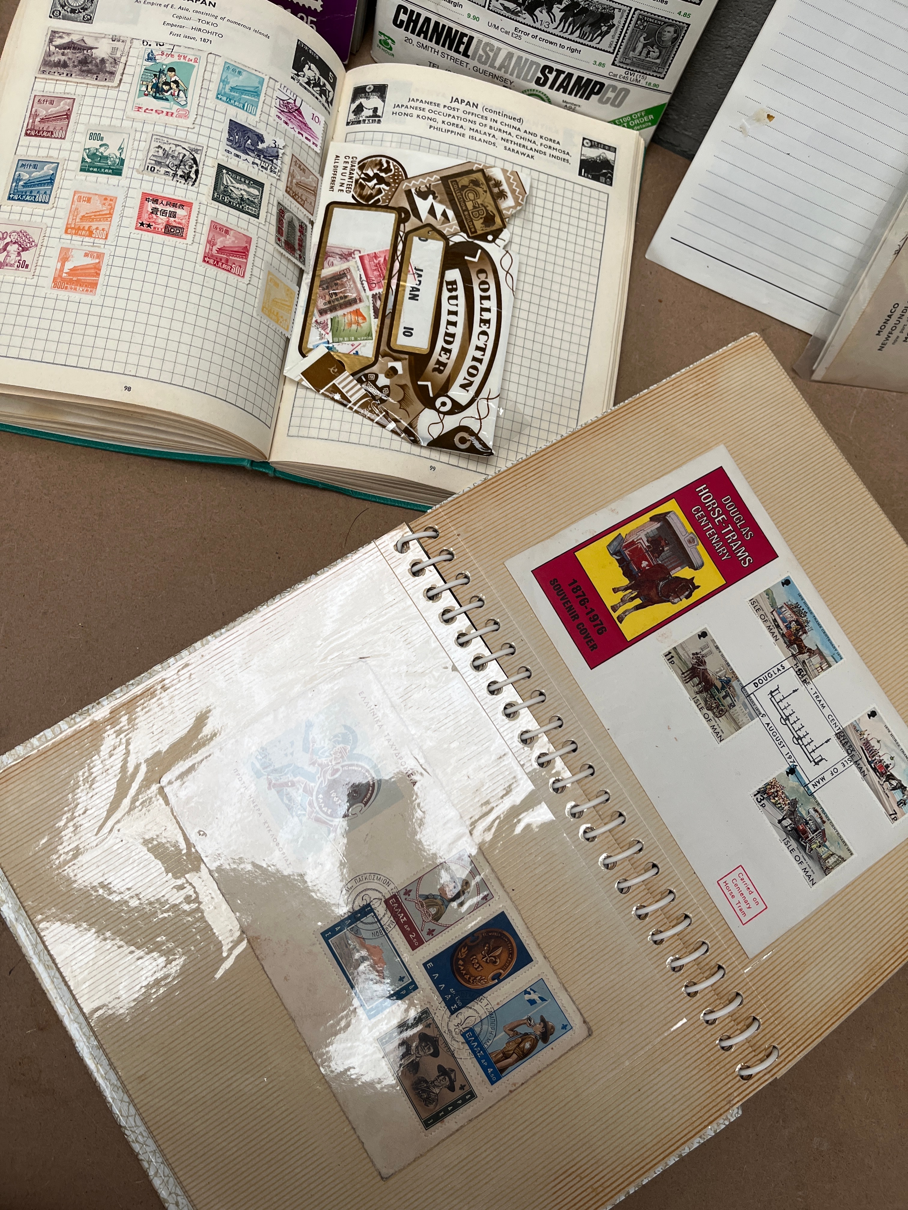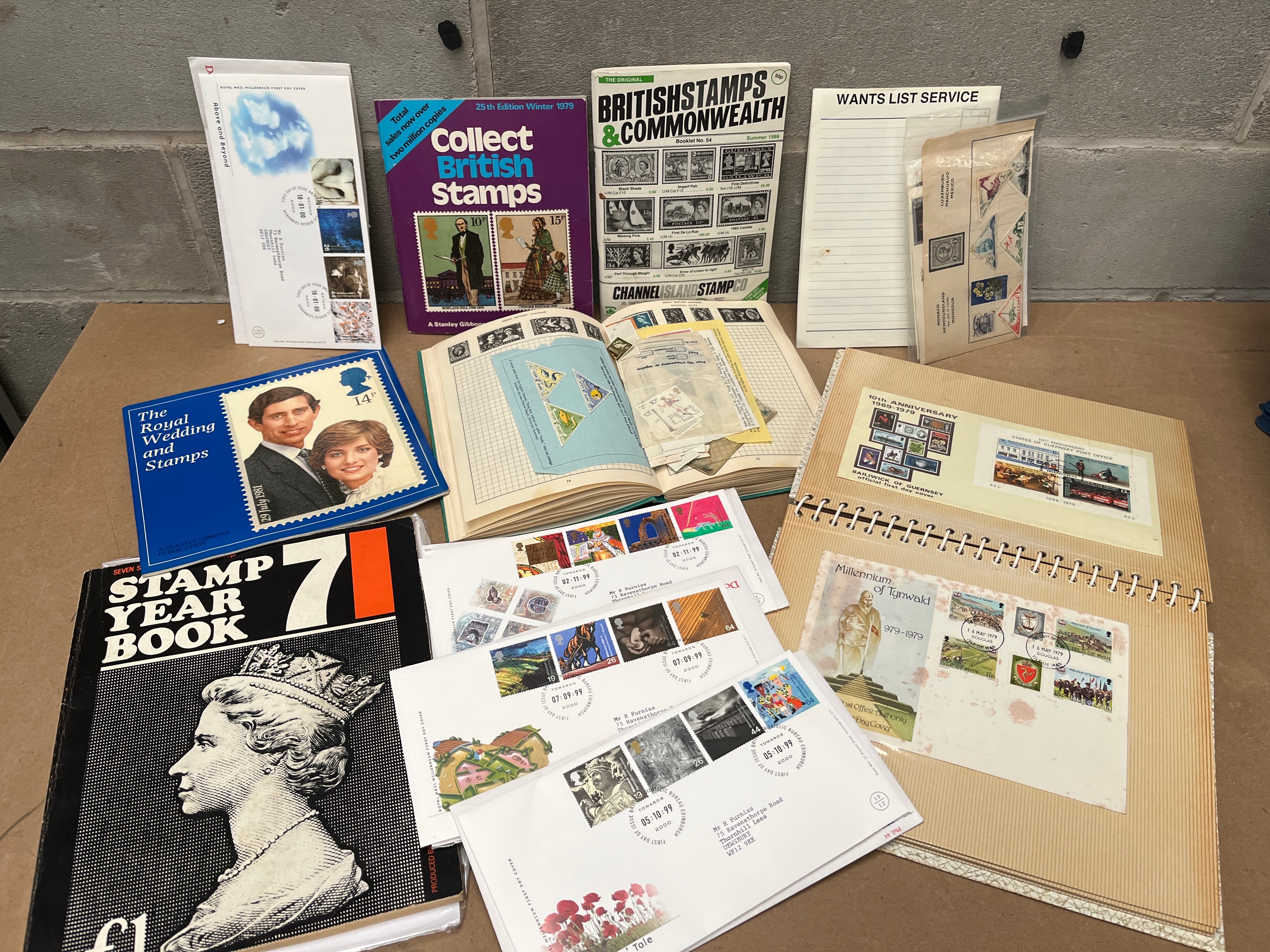 This extensive collection comprises numerous postage stamps, multiple stamp albums, stock books, First Day Covers (FDCs), and related philatelic literature. The majority of the collection dates to the late 20th century, with a strong focus on British and British Commonwealth stamps. Specific items include albums titled ‘Collect British Stamps’ and ‘BRITISH STAMPS & COMMONWEALTH,’ alongside a ‘STAMP YEAR BOOK 1979.’ First Day Covers bear dates such as ‘05.10.99,’ and a book titled ‘The Royal Wedding and Stamps’ features Prince Charles and Princess Diana. An open album section is labeled ‘JAPAN’ and contains Japanese stamps with English descriptions. Materials observed include paper, cardboard, and plastic, with some albums featuring metal spiral binding. Additional markings noted are ‘WANTS LIST SERVICE’ and ‘CHANNEL ISLAND STAMP CO.’