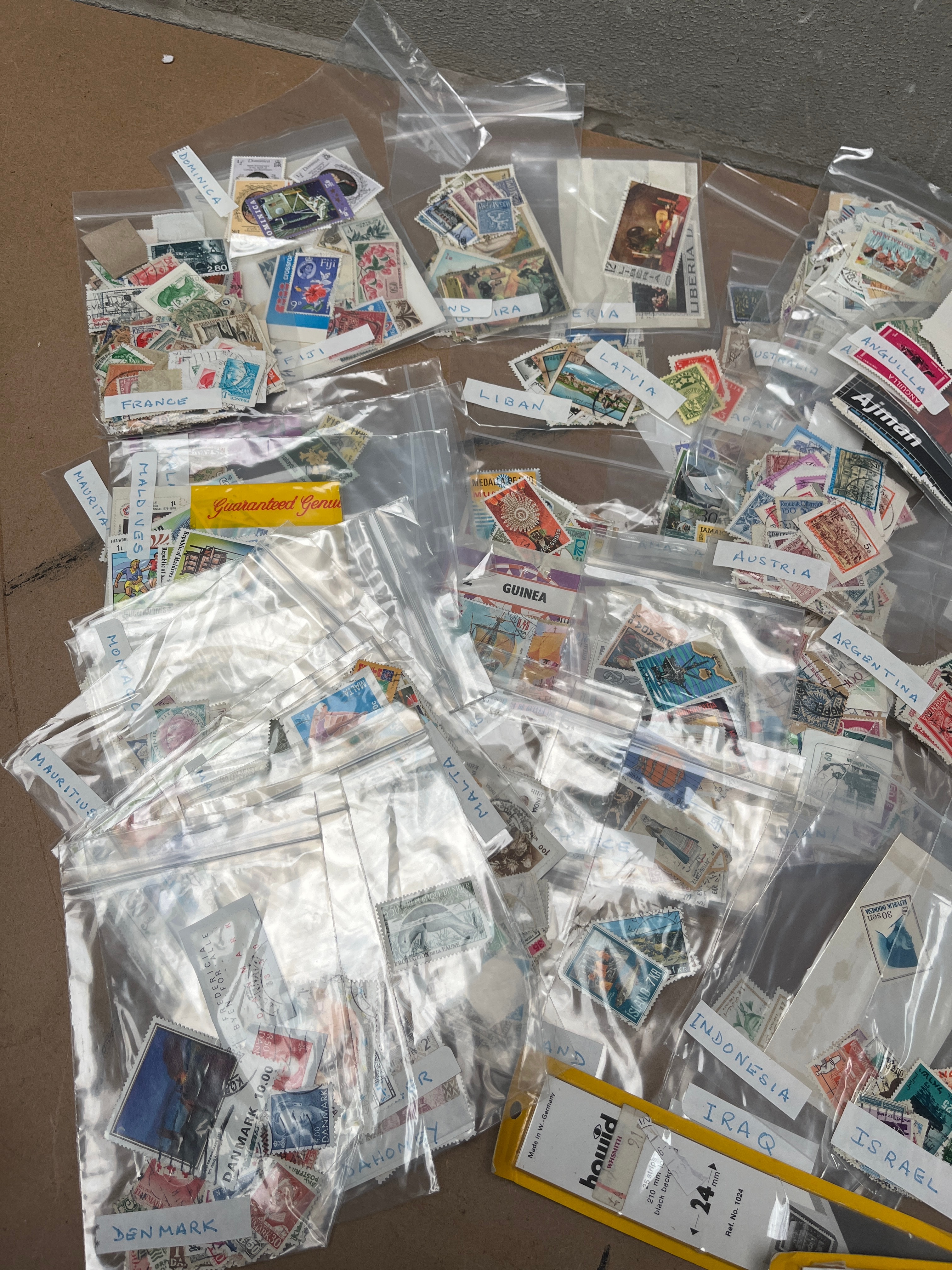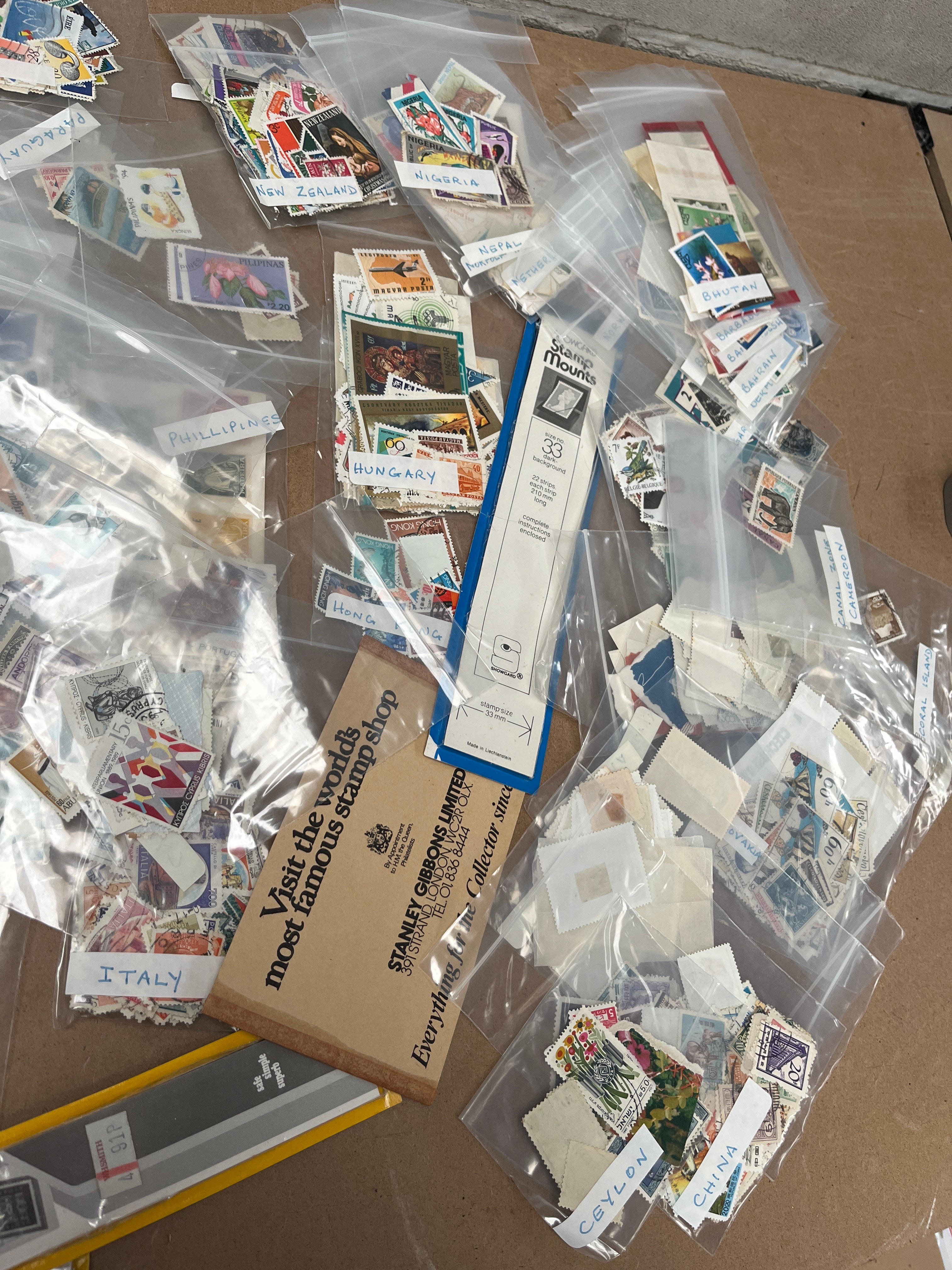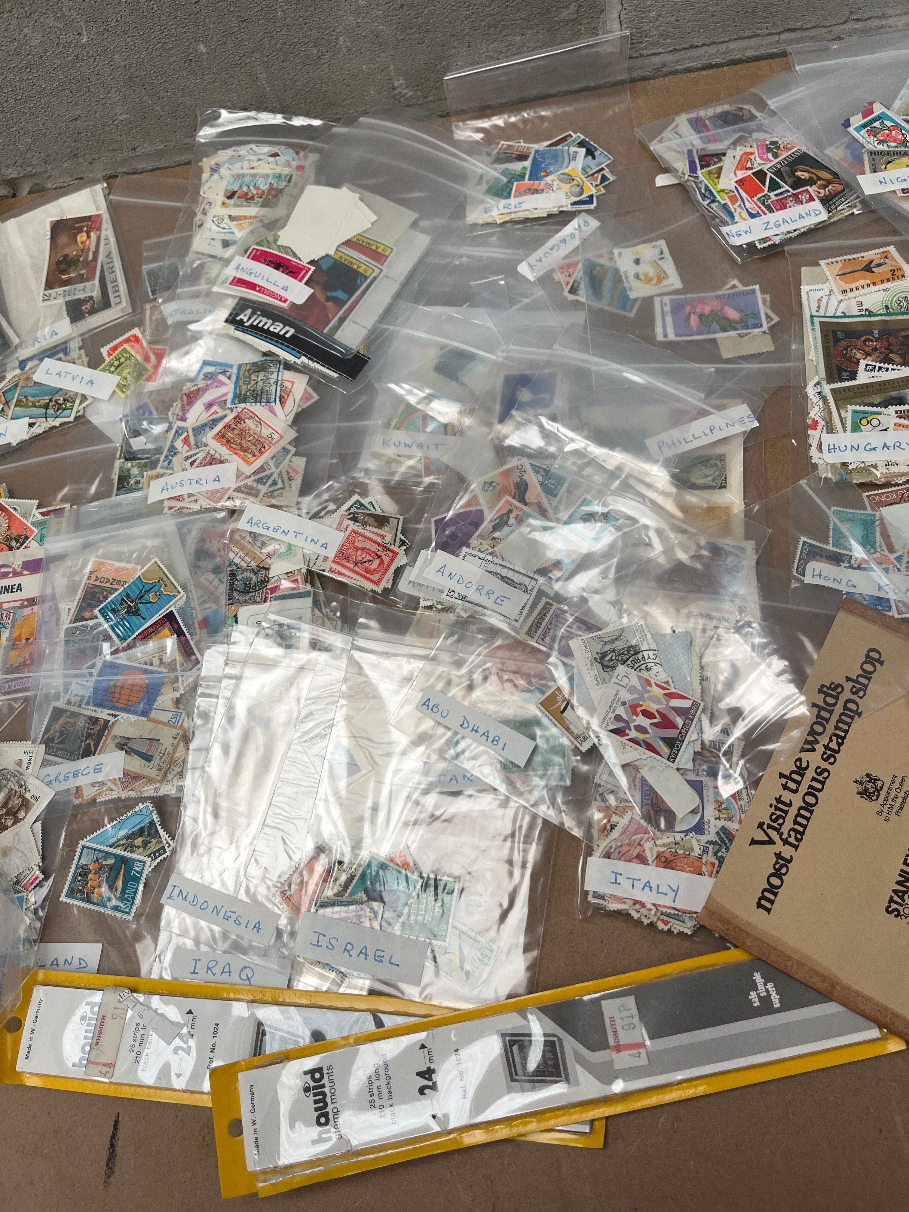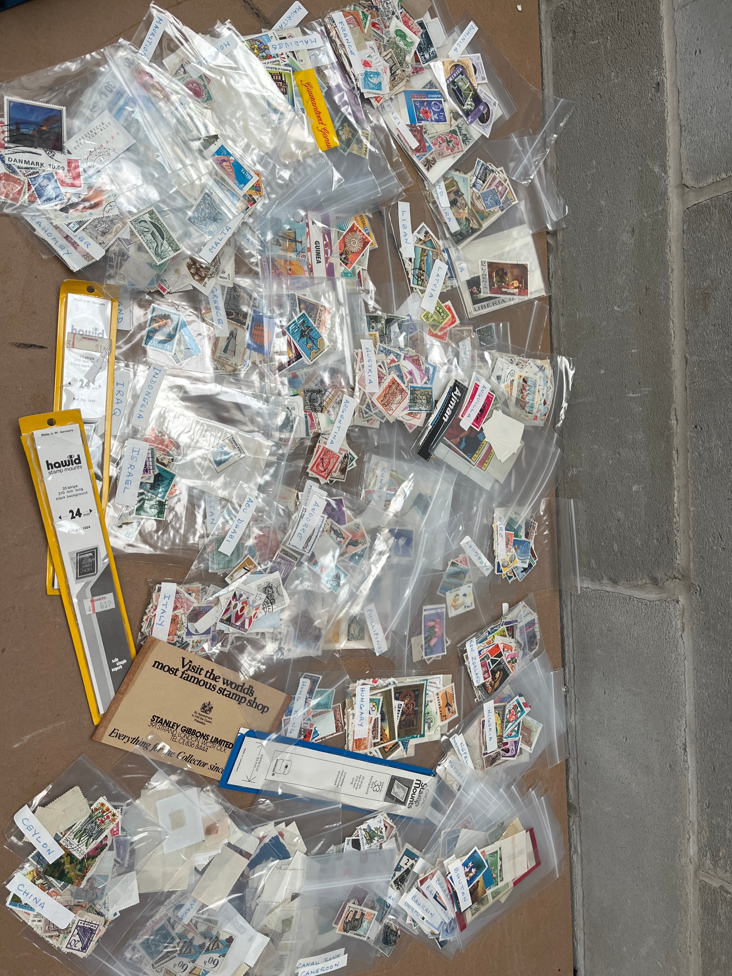A large and diverse collection of postage stamps from numerous countries, presented primarily in individual transparent plastic bags. Many bags are hand-labeled with country names including DENMARK, FRANCE, AUSTRIA, INDONESIA, IRAQ, ISRAEL, ITALY, CHINA, CEYLON, MAURITIUS, GUINEA, MALTA, NEW ZEALAND, HUNGARY, PHILIPPINES, KUWAIT, ABU DHABI, ANDORRE (Andorra), and LIBAN (Lebanon). The stamps, made of paper, represent a mixed period due to the variety of designs and styles. Also included are philatelic supplies, specifically “howid” branded “Stamp Mounts” and a cardboard advertisement from “STANLEY GIBBONS LIMITED,” identifying as “the world’s most famous stamp shop.”
