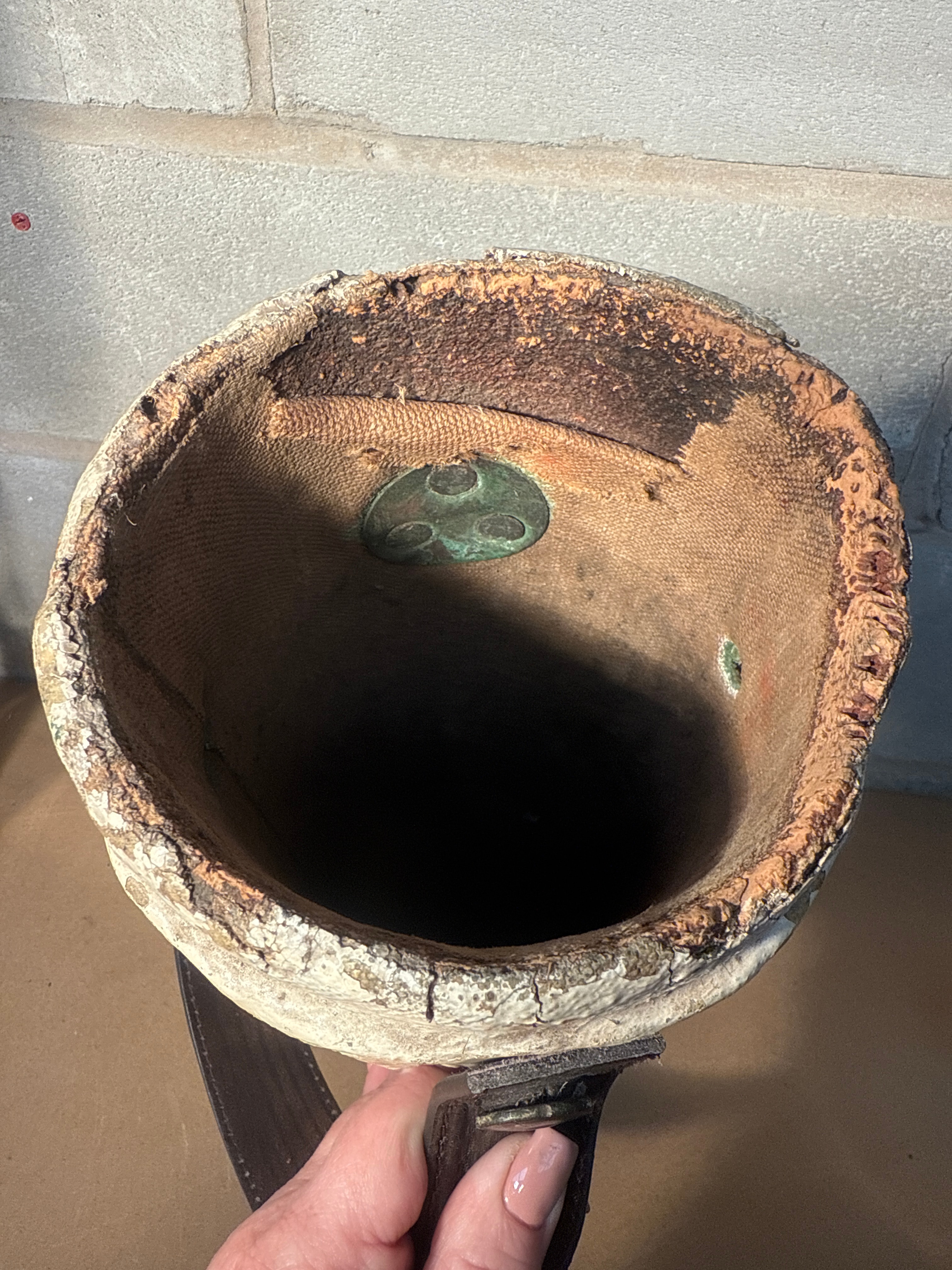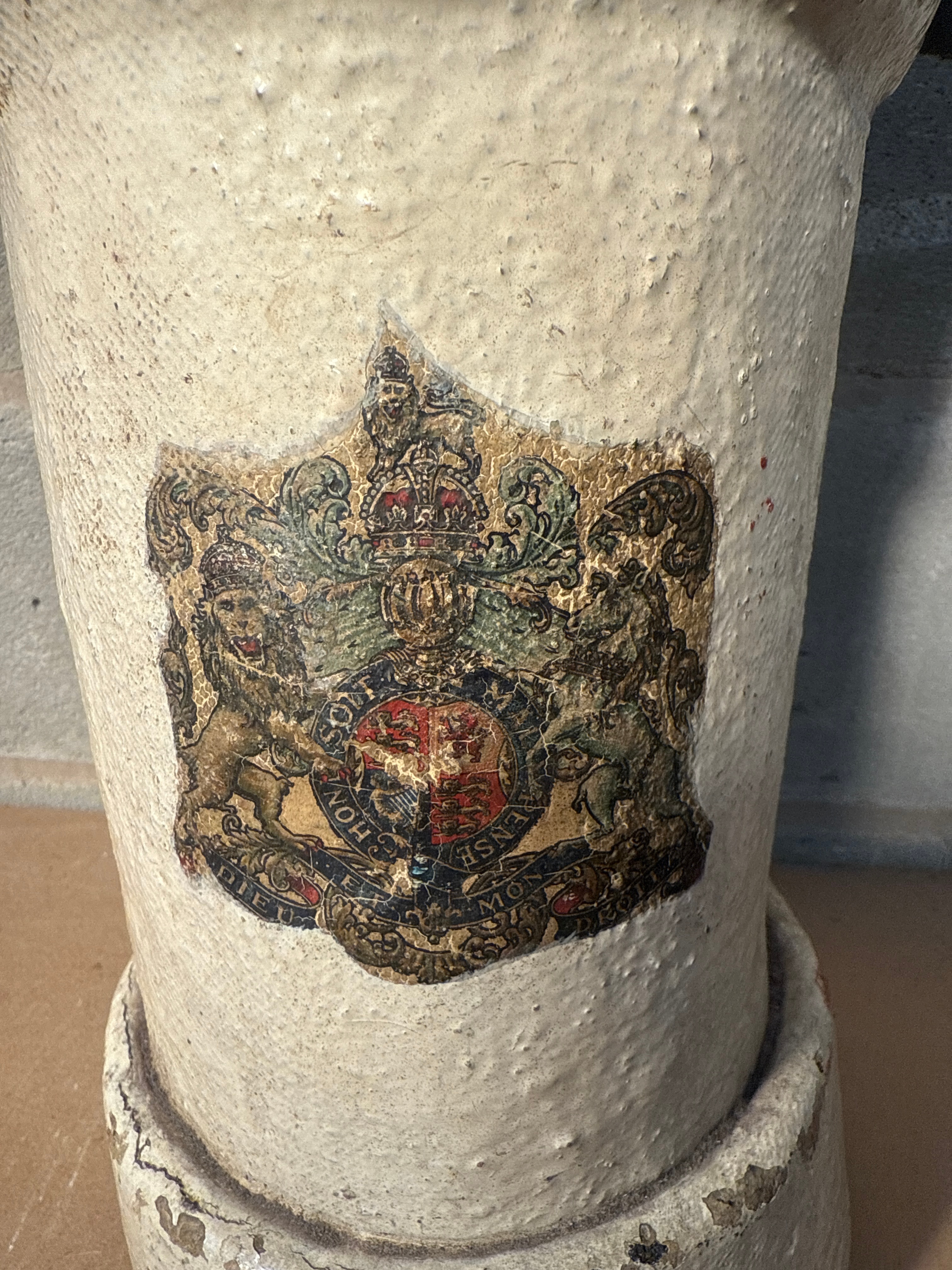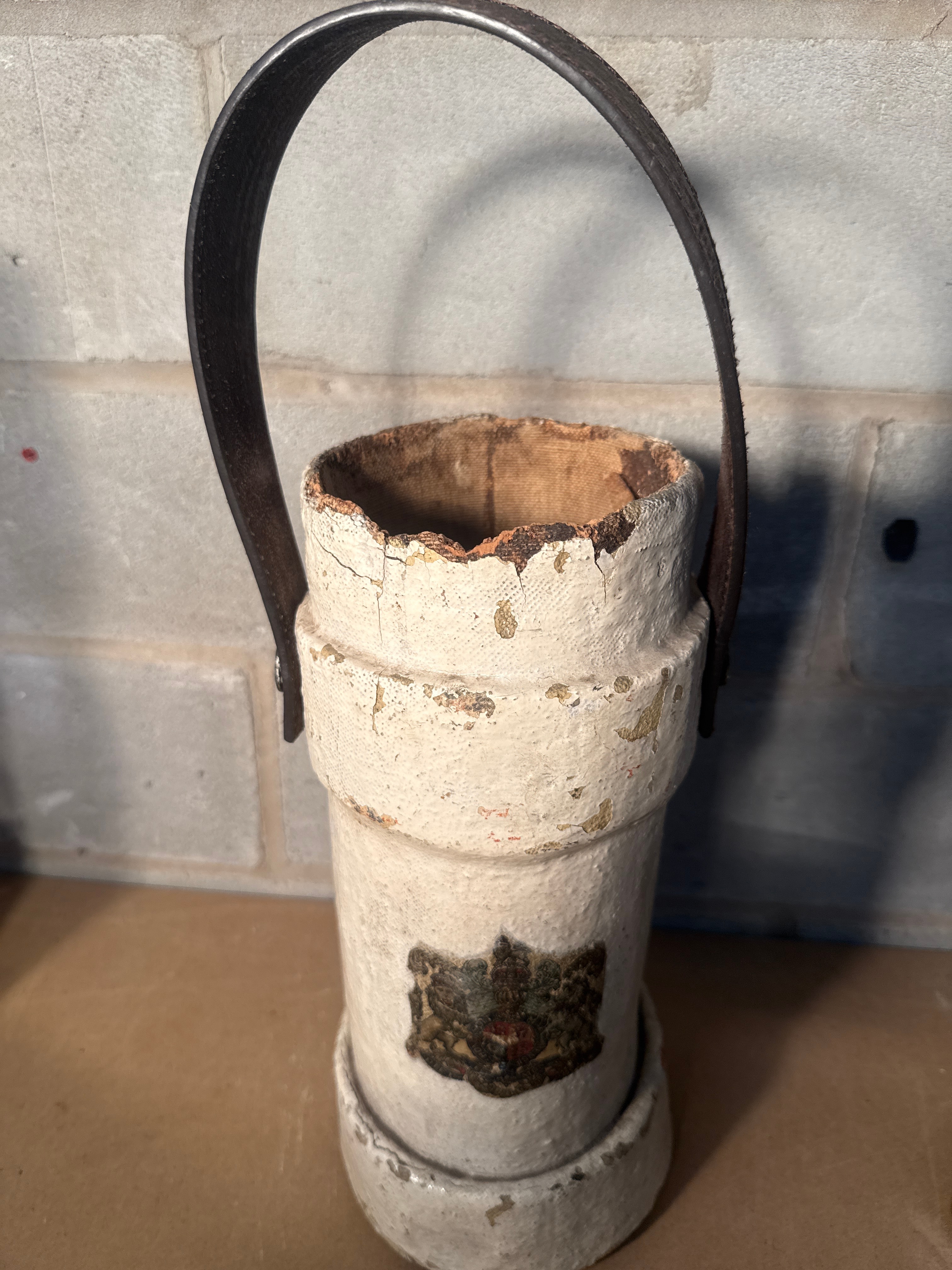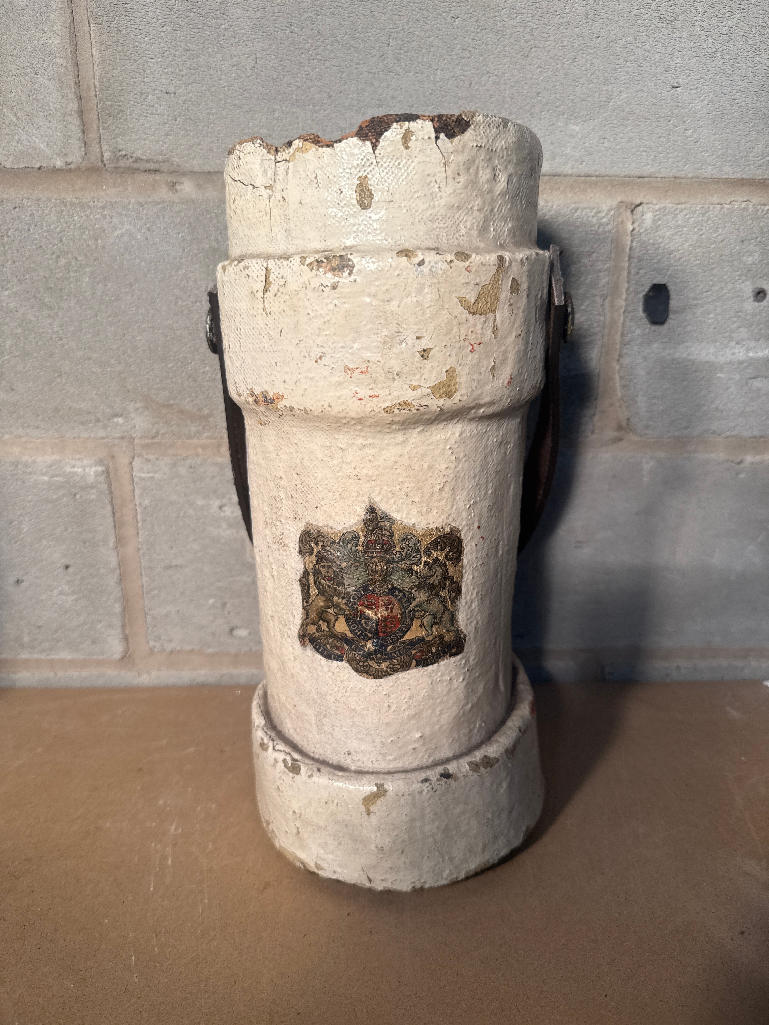 An Edwardian British Army canvas cordite carrier, of cylindrical form. Constructed from a coarse fabric, likely canvas or linen, it is coated in a thick, textured off-white paint or gesso. The interior is lined with a brownish fabric and features a riveted green metal disc at the base. A dark brown leather strap is attached for portability. Adorning the exterior is a colorful decal of the Royal Coat of Arms of the United Kingdom, clearly displaying the mottoes “DIEU ET MON DROIT” and “HONI SOIT QUI MAL Y PENSE.”