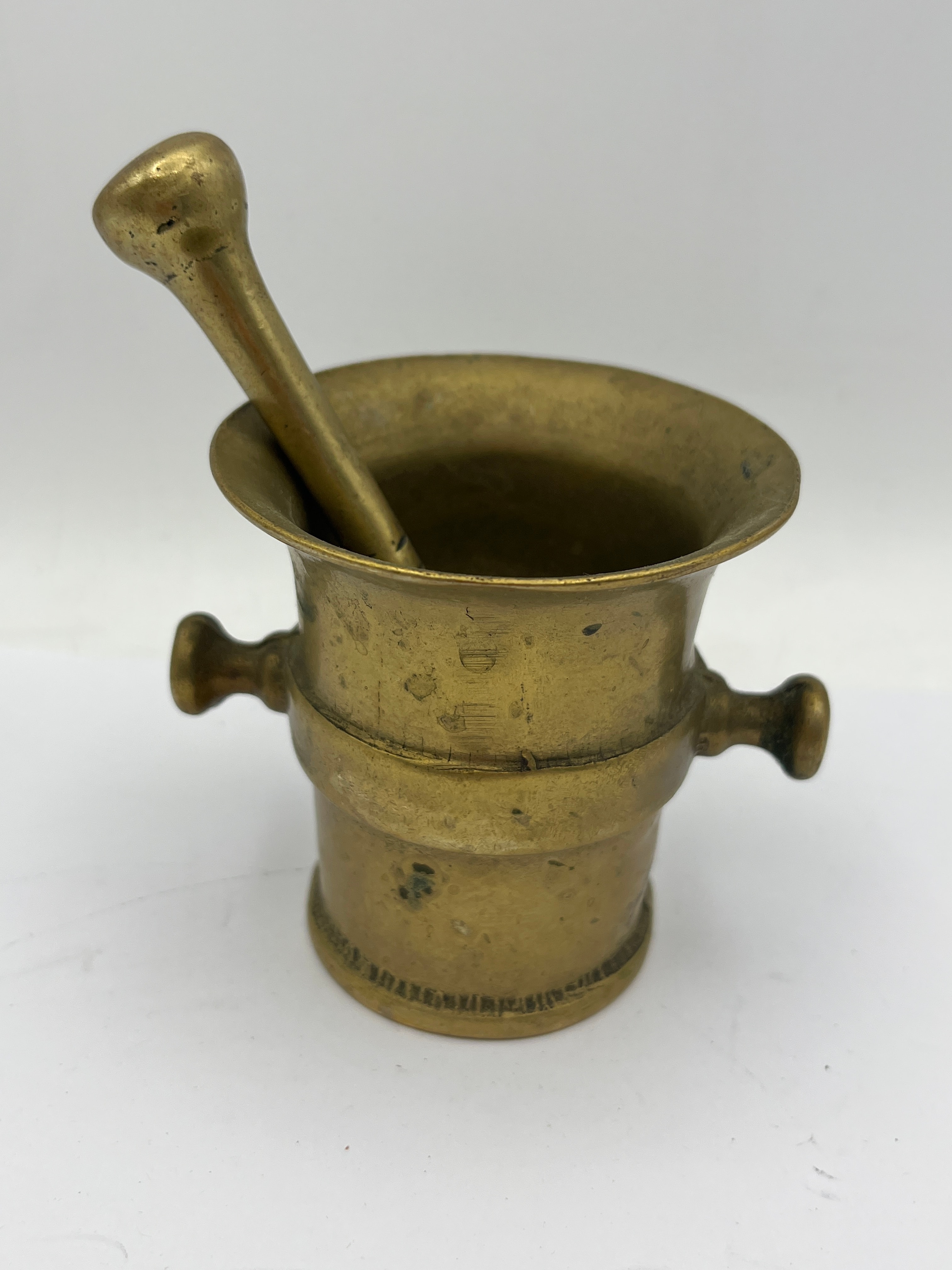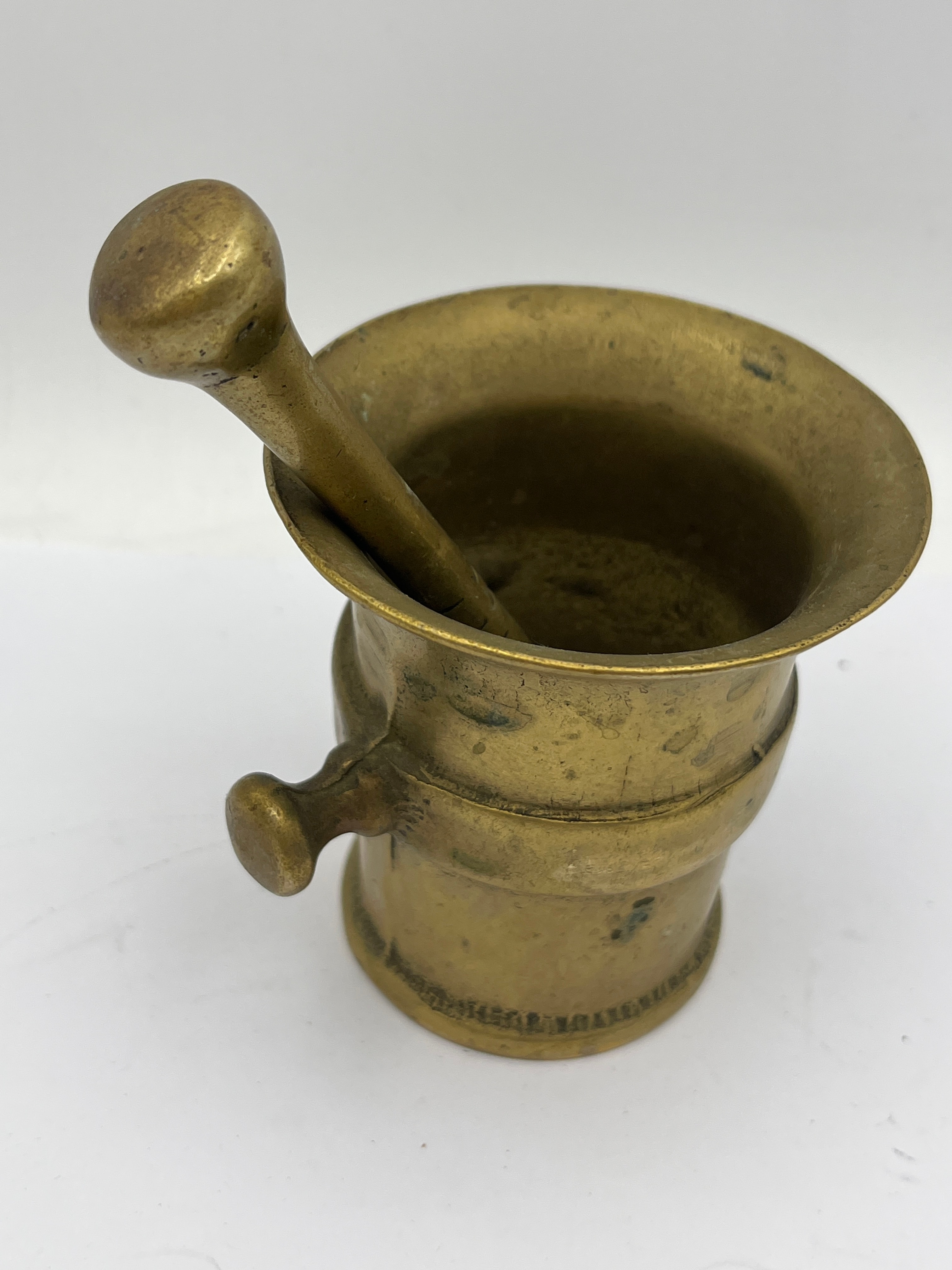 A vintage heavy brass mortar and pestle set with handles. Crafted from cast brass, the mortar features a broad, flaring rim over a cylindrical body, accented by two short, stub-like handles and subtle molded decorative bands. The accompanying pestle is a solid, club-shaped piece with a rounded striking end. No discernible text, hallmarks, or manufacturer’s markings are visible.
