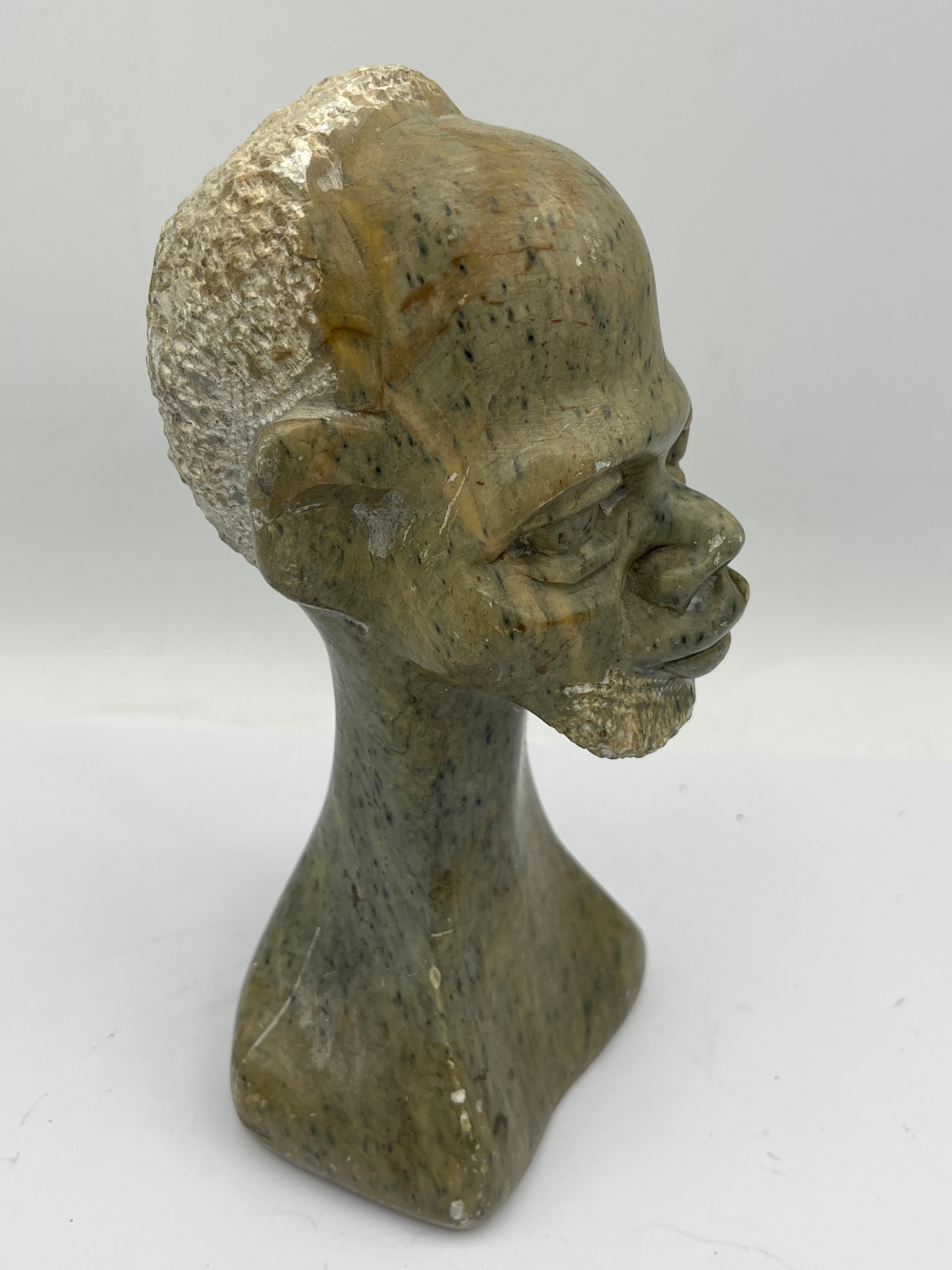 An African hand-carved stone bust sculpture depicting a human head with a stylized, naturalistic interpretation characteristic of African folk or tribal art. Carved from a mottled greenish-grey stone, likely soapstone or steatite, it features an expressive face with textured hair and a beard. A yellow sticker with the number “L 36193” is affixed to the front of the base.