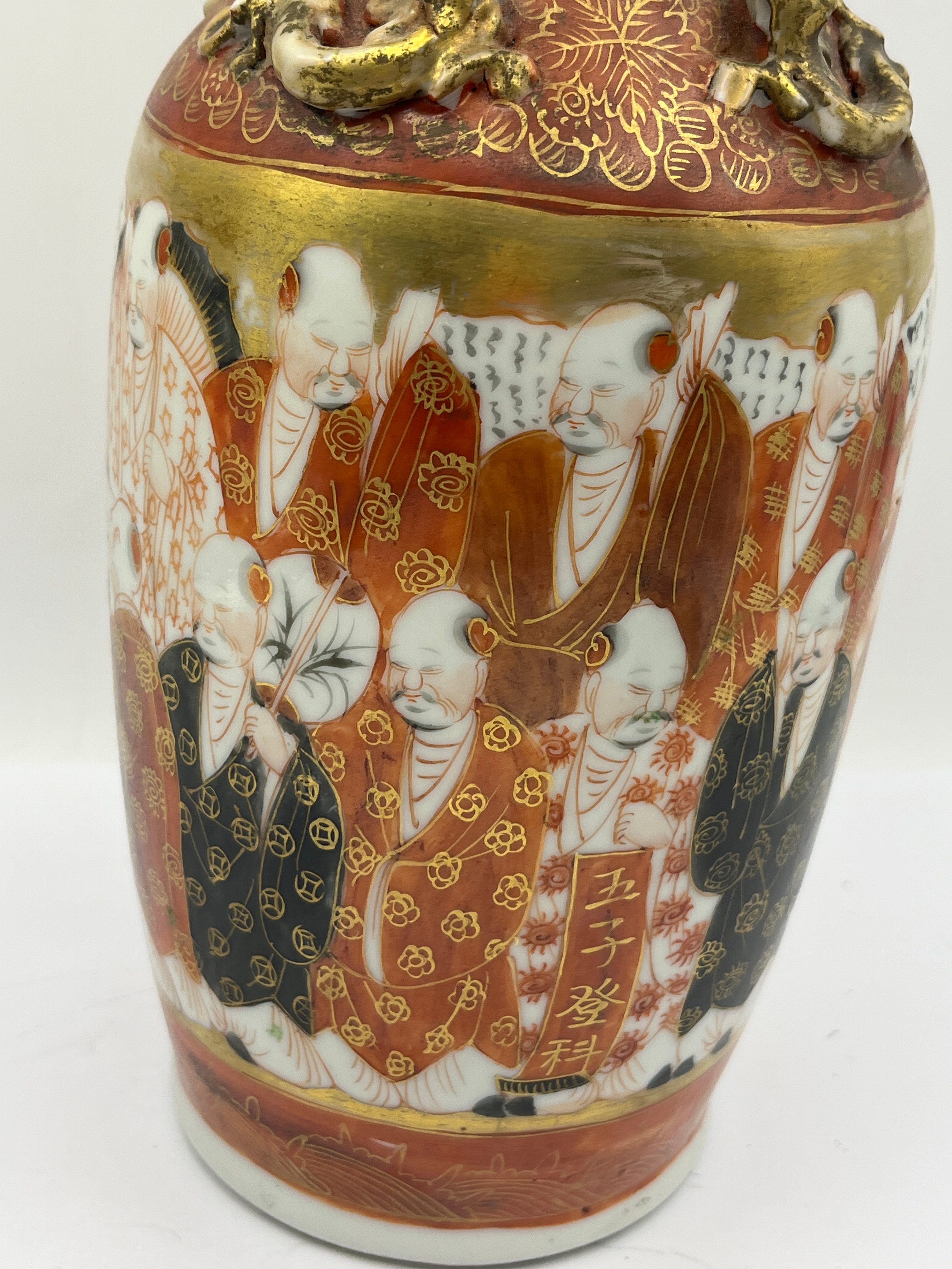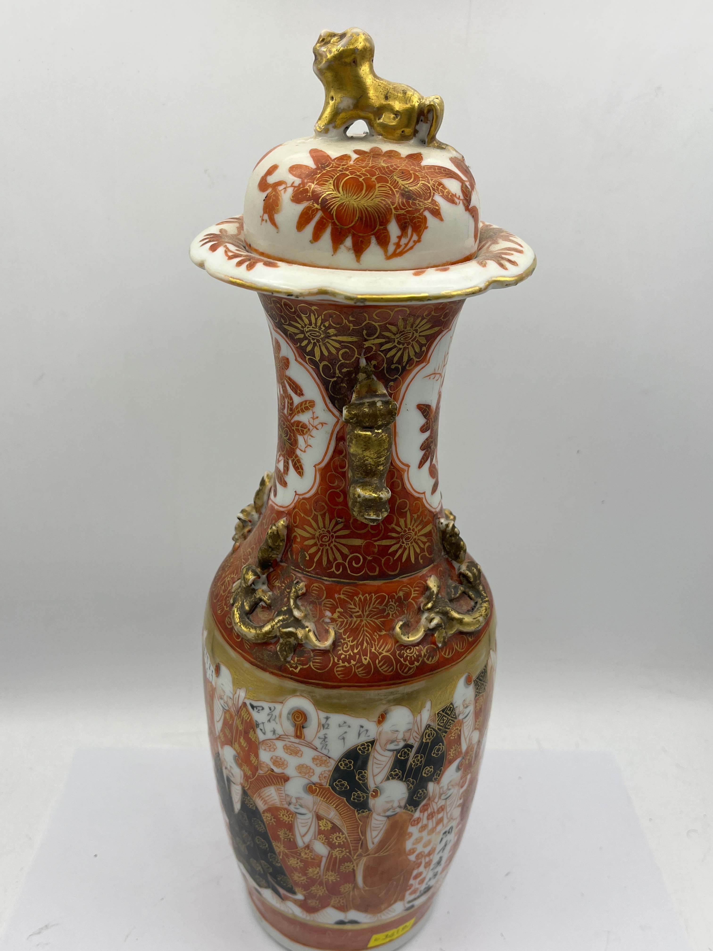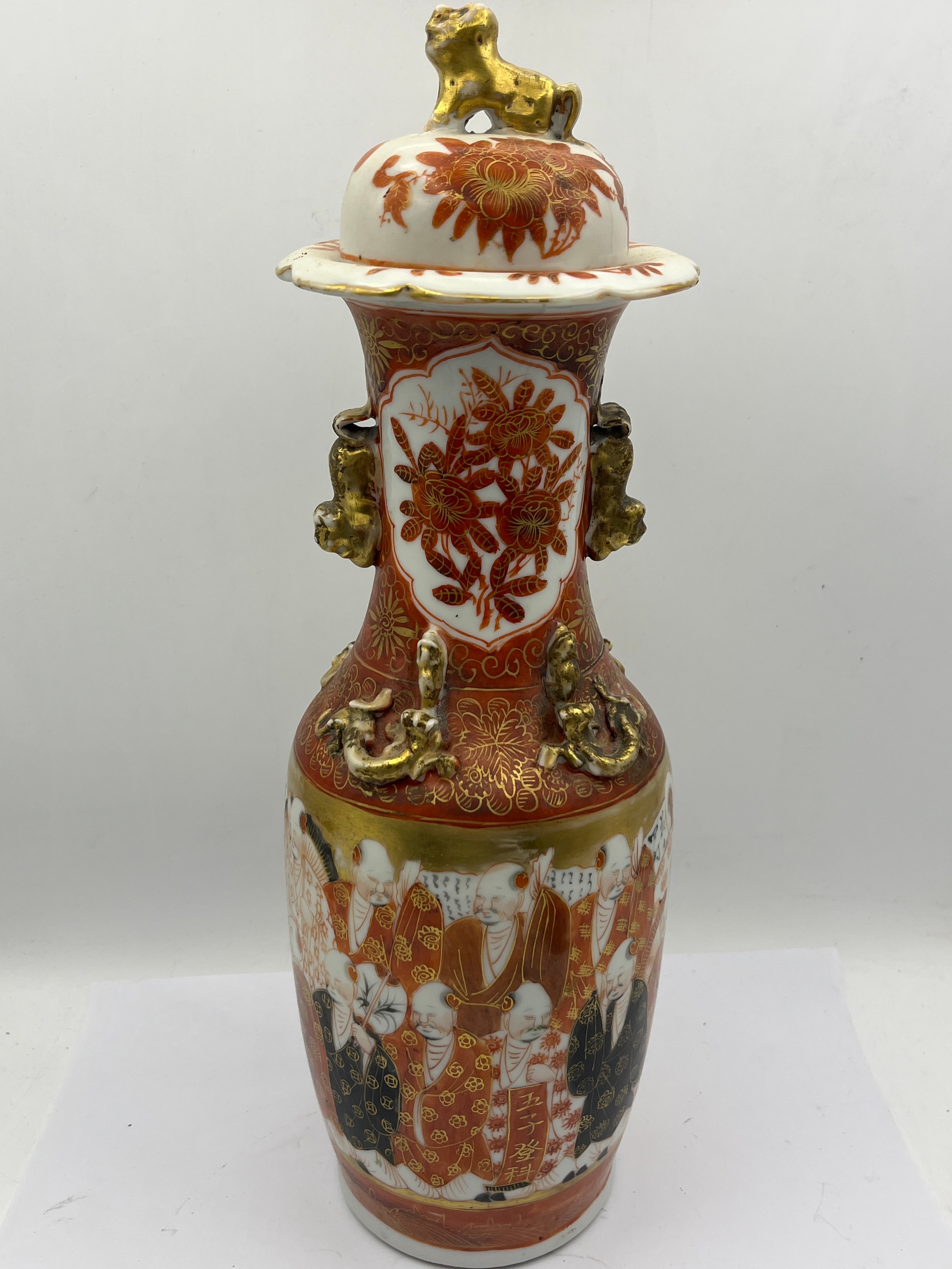 A Japanese Satsuma lidded vase. The baluster-form body and domed lid are topped with a gilded, stylized foo dog finial. It is elaborately decorated with a vibrant palette predominantly of rich red, extensive gilding, and white reserves displaying intricate floral and foliate motifs on the lid and neck. The shoulders are adorned with two pairs of gilded dragon-like handles or lugs. The main body features a detailed figural scene depicting numerous robed figures on a white ground, accented with black, red, and gold patterns. Visible text within this scene reads “五百羅漢,” which translates to “Five Hundred Arhats” or “Five Hundred Rakan,” suggesting a Japanese cultural context.