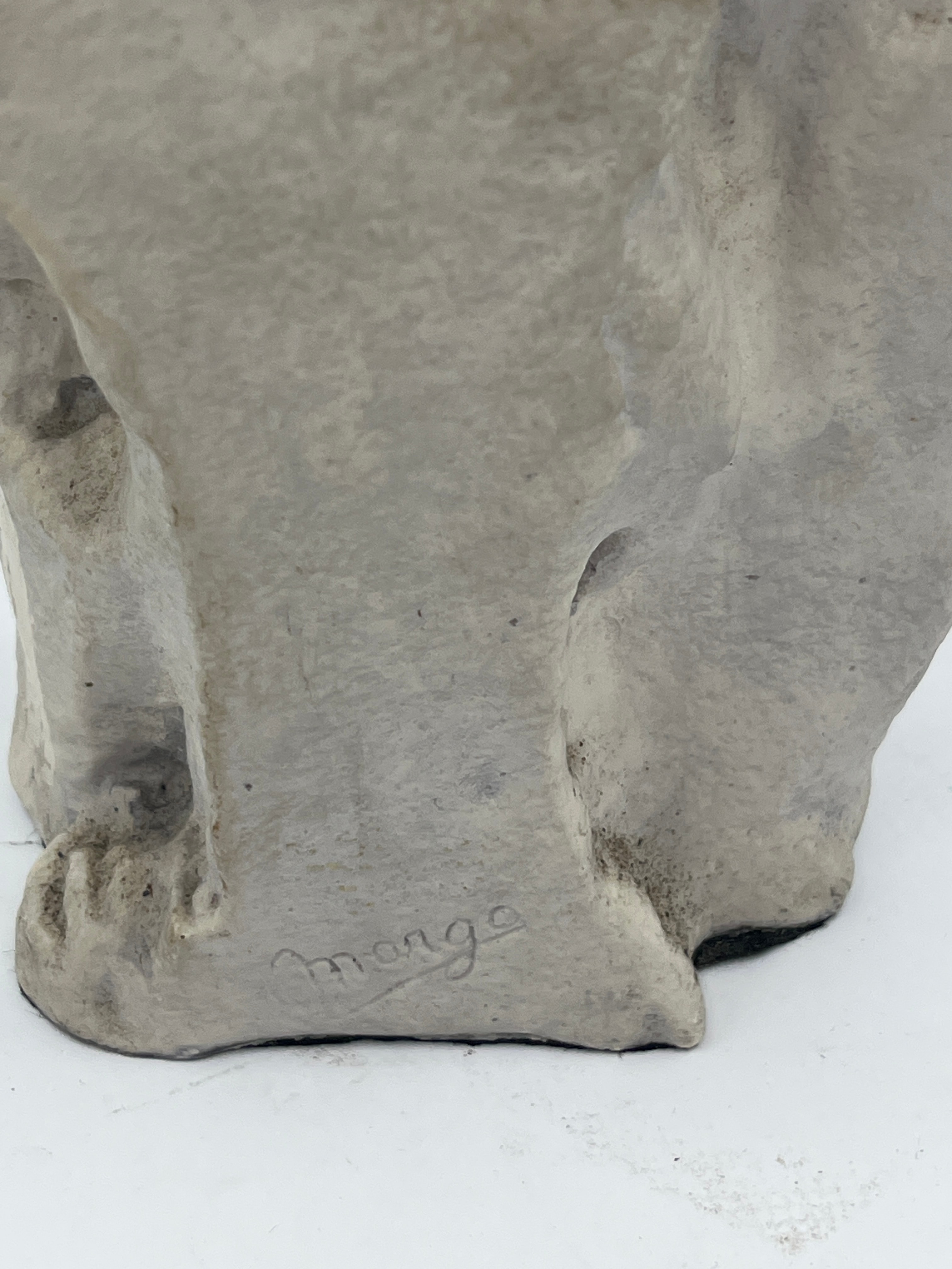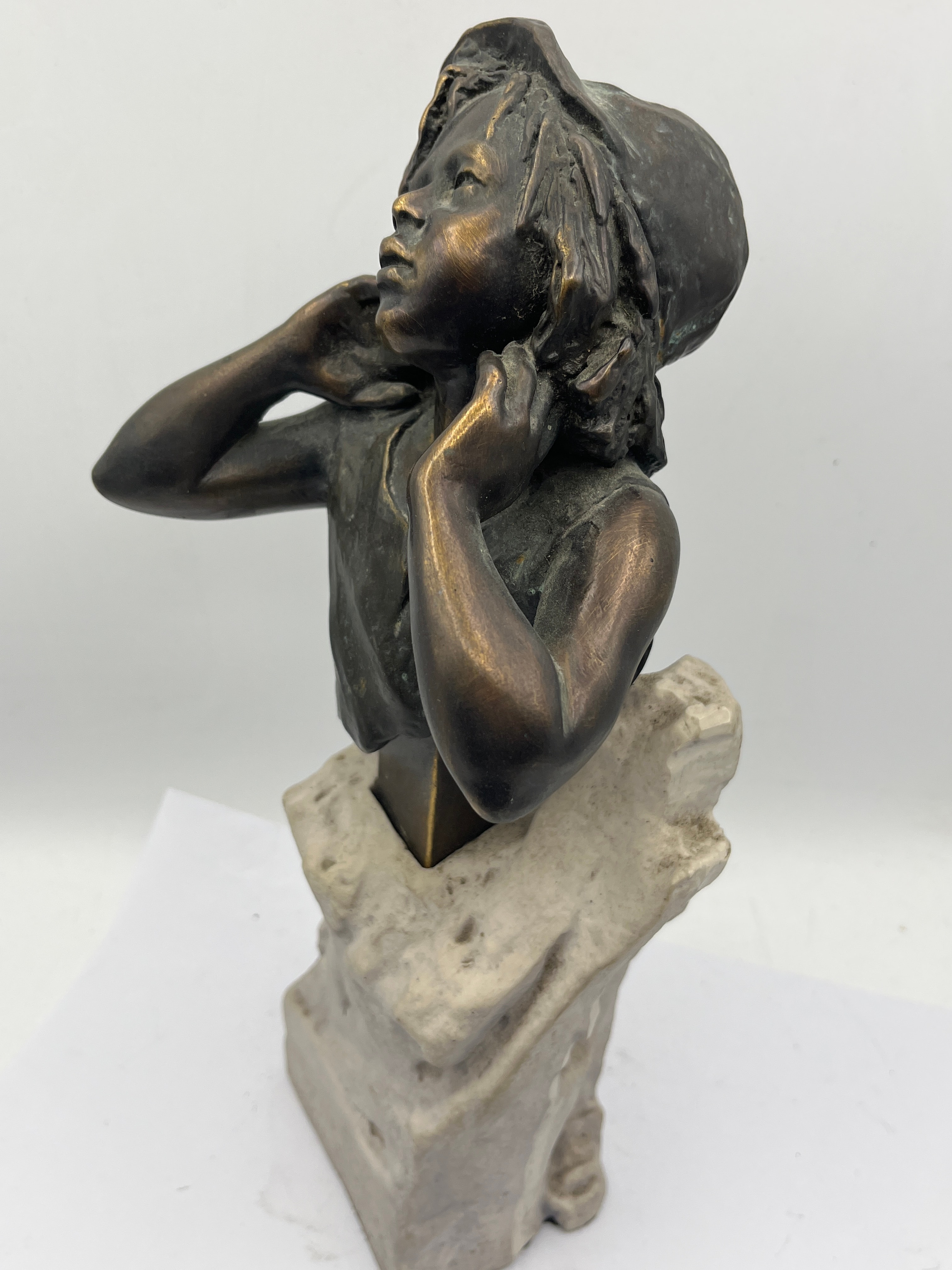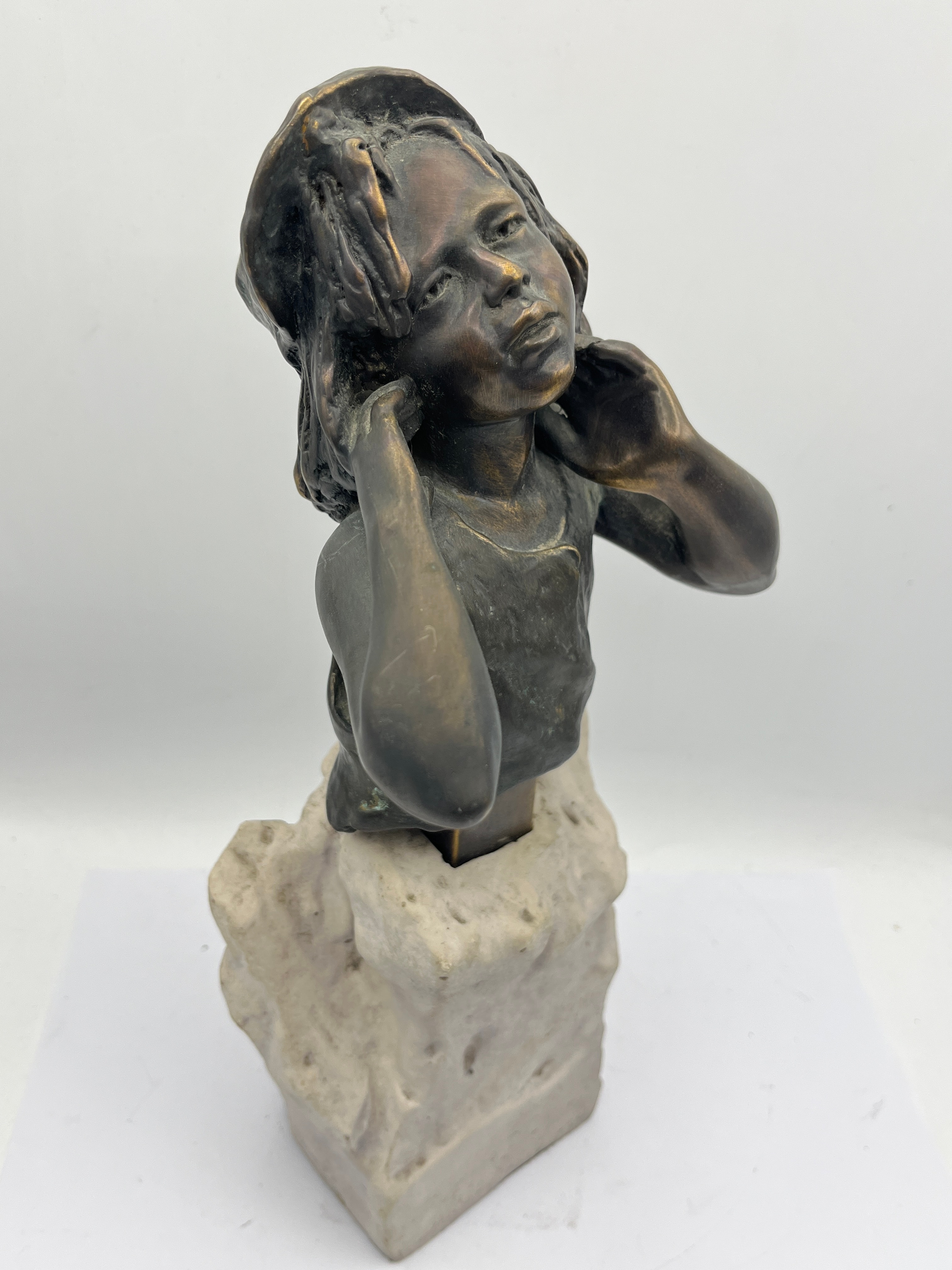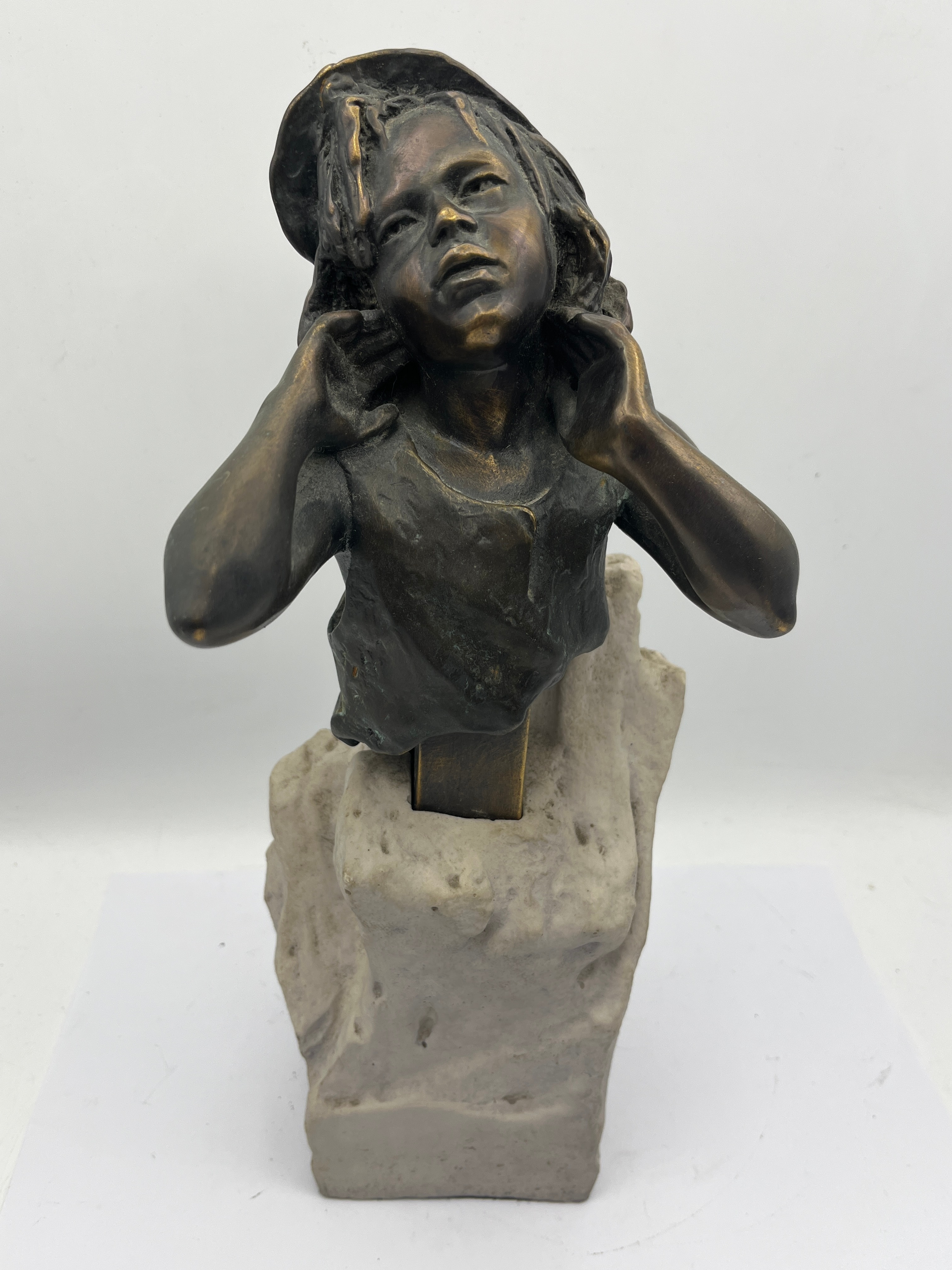 A figurative bronze bust of a young girl, depicted wearing a hat with her hands resting near her ears, mounted on a rough-hewn, light-colored stone base. The bronze exhibits a dark patination with subtle metallic highlights. A signature, ‘Marga,’ is visibly incised in script on the side of the stone base.