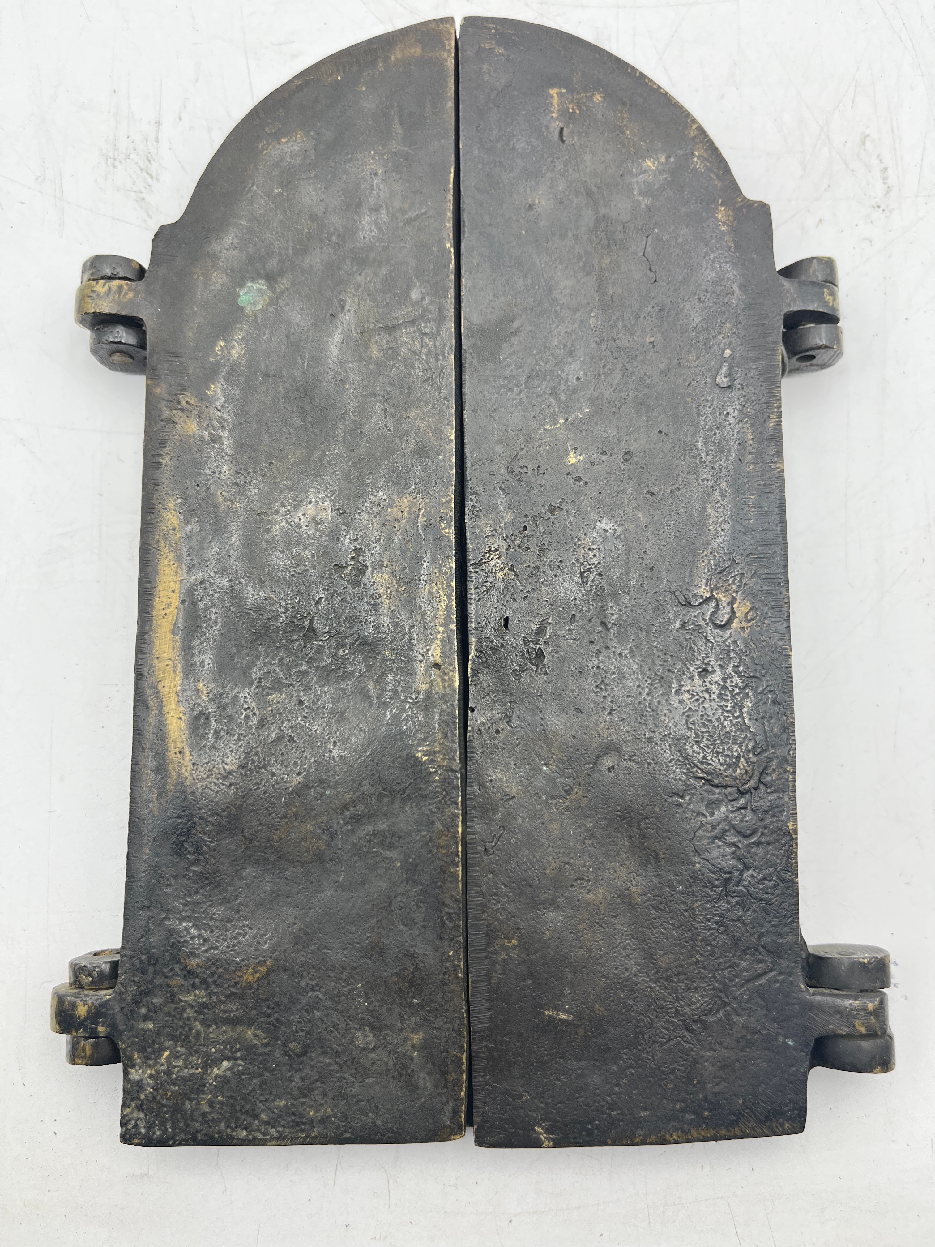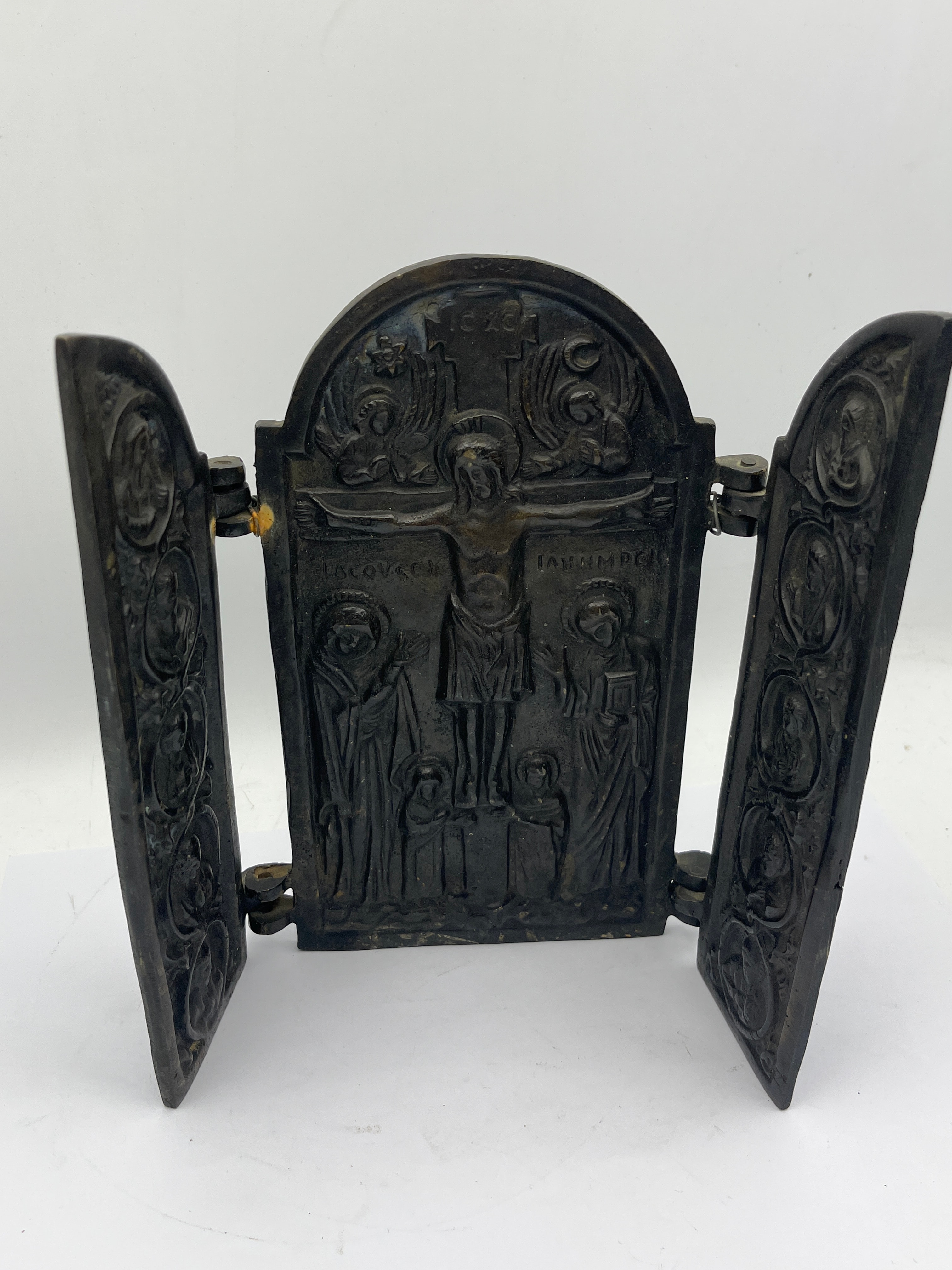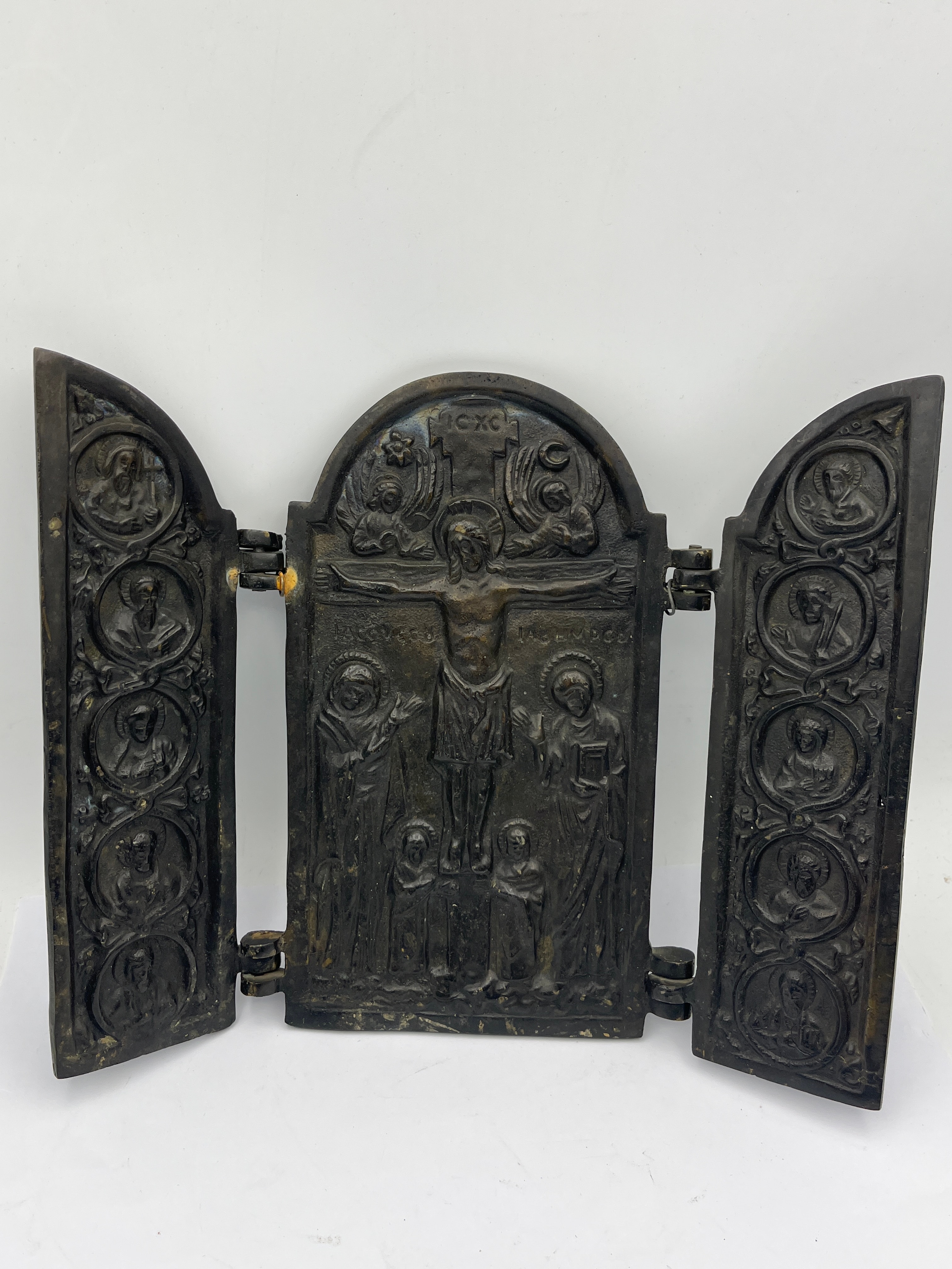 A Russian Orthodox cast bronze triptych, late 19th century, depicting the Crucifixion. This hinged, three-panel devotional triptych features a central panel with an arched top, showing Christ on the cross, flanked by the Virgin Mary to the left and Saint John to the right. Above Christ’s head, the Cyrillic abbreviation “IC XC” (Jesus Christ) is visible, and the right figure is identified by “ІѠАННЪ” (John) in Cyrillic script. The inscription for the left figure is less distinct. The side panels feature smaller, roundel-framed busts of saints or religious figures.