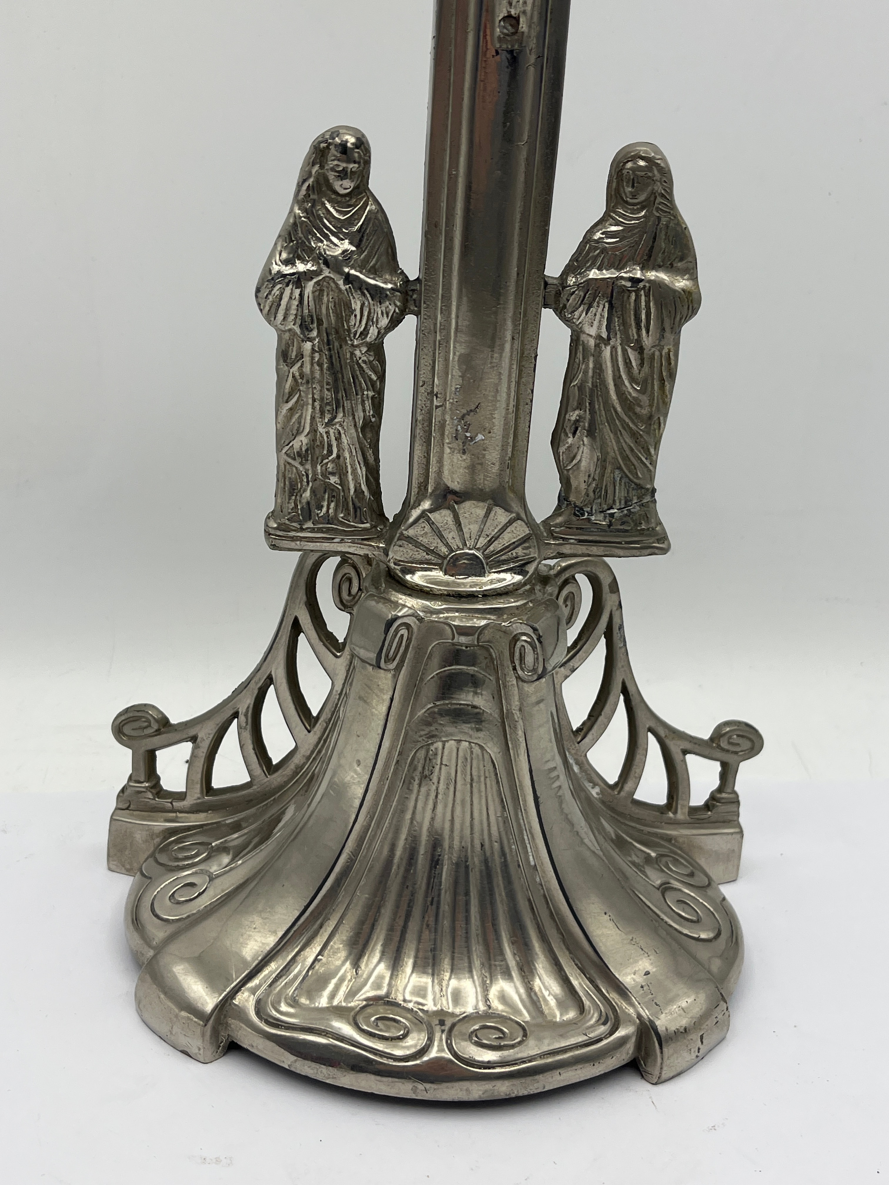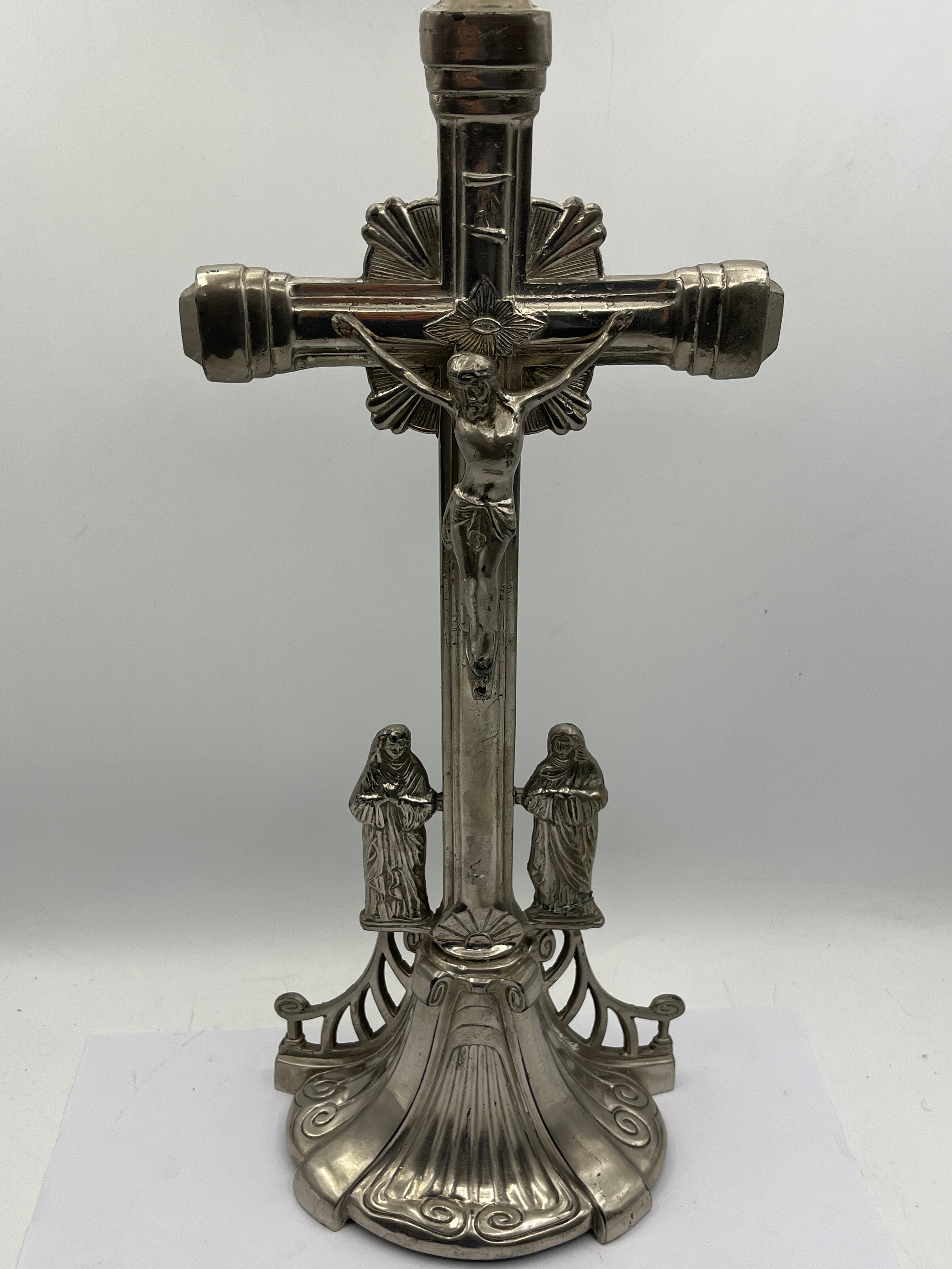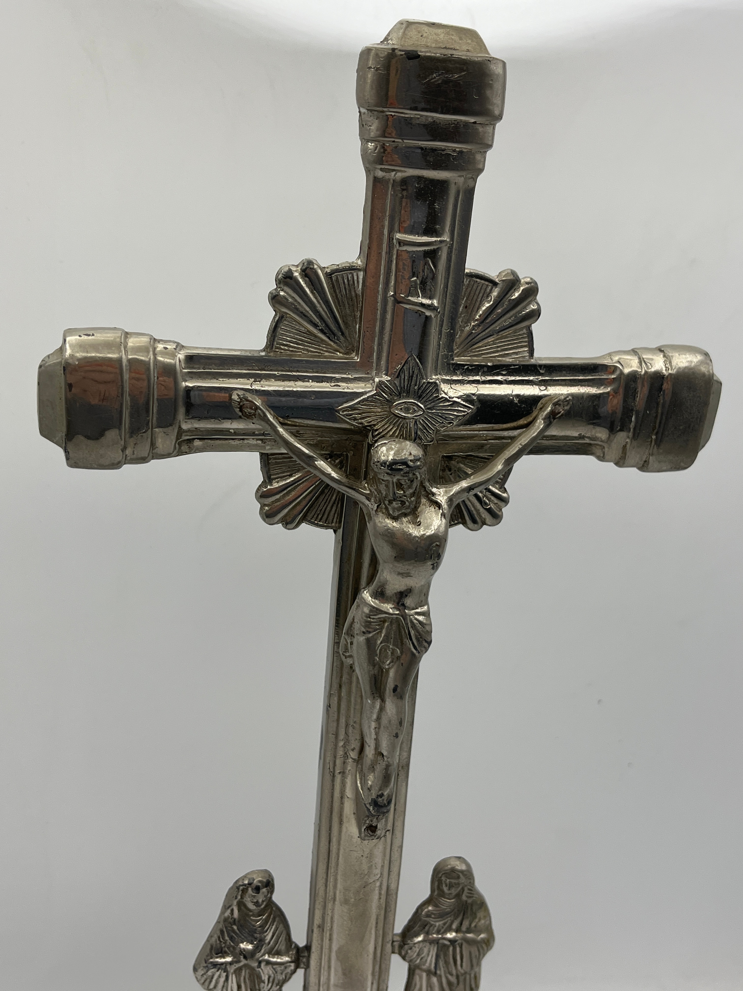 A standing metal crucifix featuring a detailed corpus of Christ, depicted with a radiant sunburst behind his head. The cross is mounted on a decorative, flared pedestal base, flanked by two robed figures, likely the Virgin Mary and St. John. The item appears to be constructed from a silver-toned metal, possibly plated. The overall style suggests a religious devotional object, potentially from the late 19th or early 20th century.