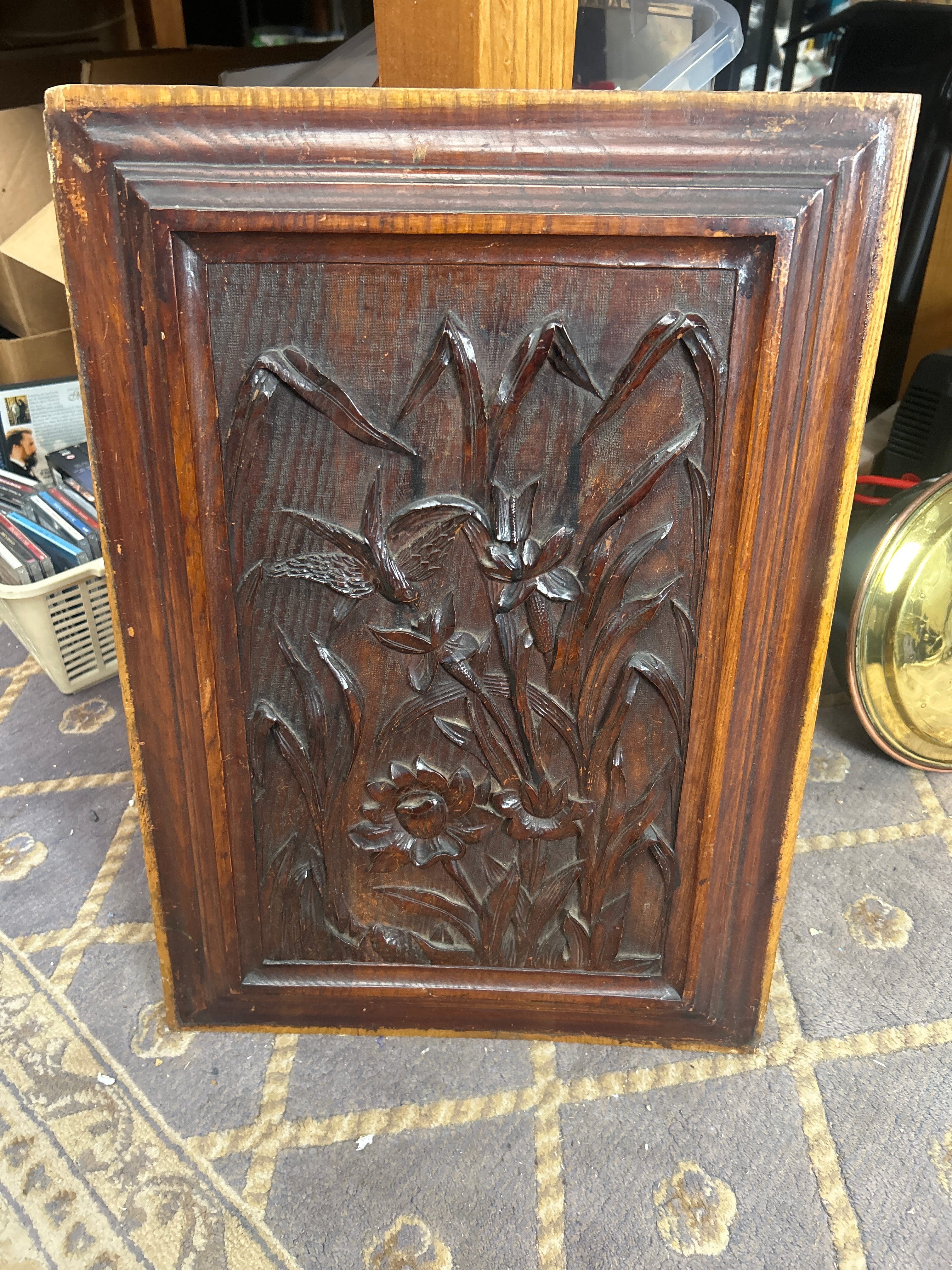 A rectangular hand carved wood panel, likely an architectural or furniture element, featuring a deep naturalistic relief carving. The central scene depicts a bird, resembling a hummingbird, engaged with an assortment of blooming flowers, identifiable as irises or lilies, and a sunflower-like bloom, surrounded by complementary foliage. The panel is encased within a multi-tiered, molded frame, all constructed from a dark reddish-brown stained wood. There are no visible texts, signatures, or maker’s marks.