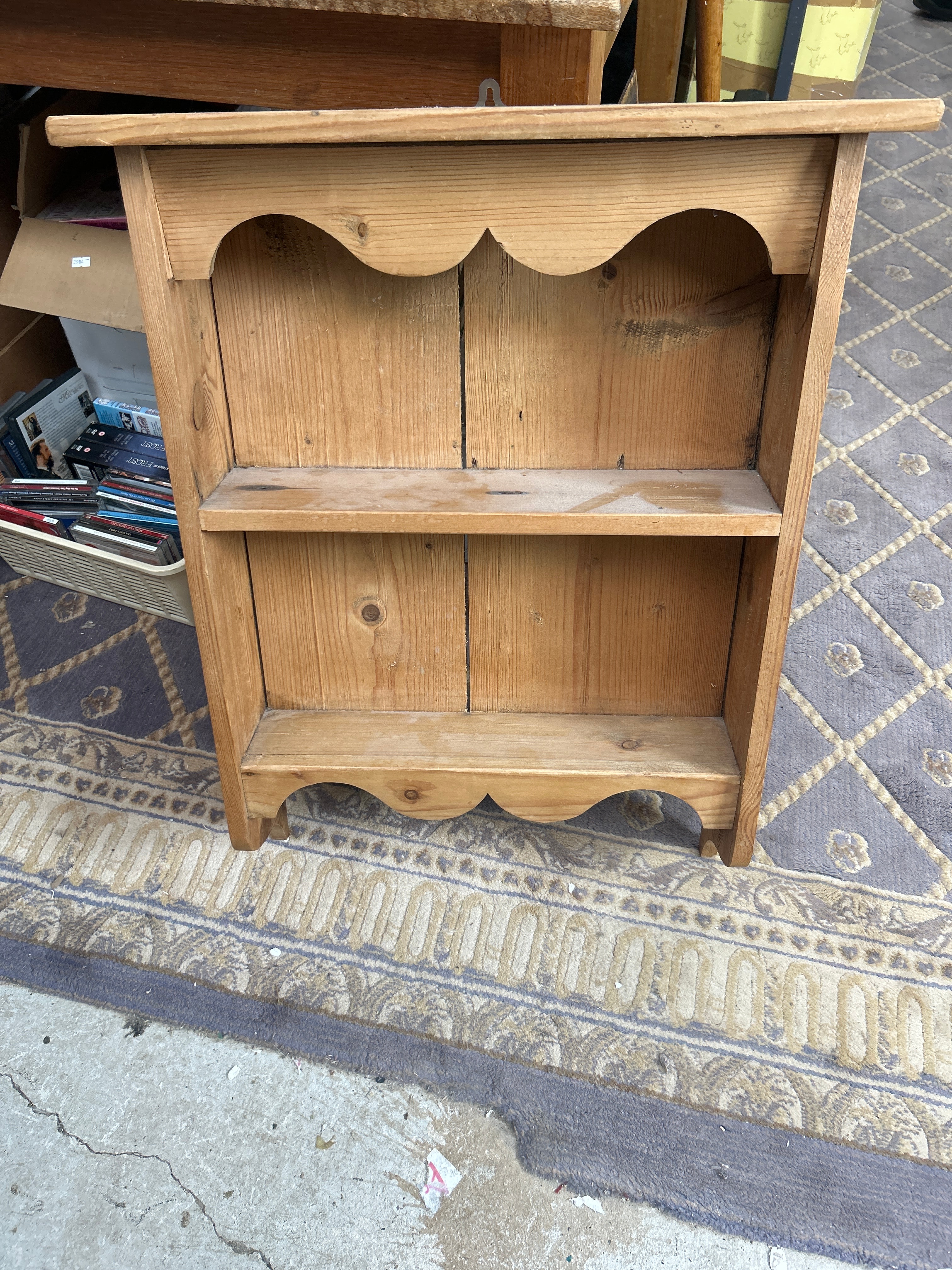 A small, two-tiered wooden shelving unit, exhibiting a rustic or country style, consistent with early 20th-century farmhouse aesthetics. It is constructed from a light-colored softwood, likely pine, featuring a natural or lightly finished surface that highlights the wood grain and knots. Decorative scalloped edges are present on the top front apron and along the bottom base. The unit includes two fixed shelves, with the top shelf appearing shallower than the bottom. A single metal keyhole hanger is visible on the underside of the top shelf, indicating its potential for wall mounting.