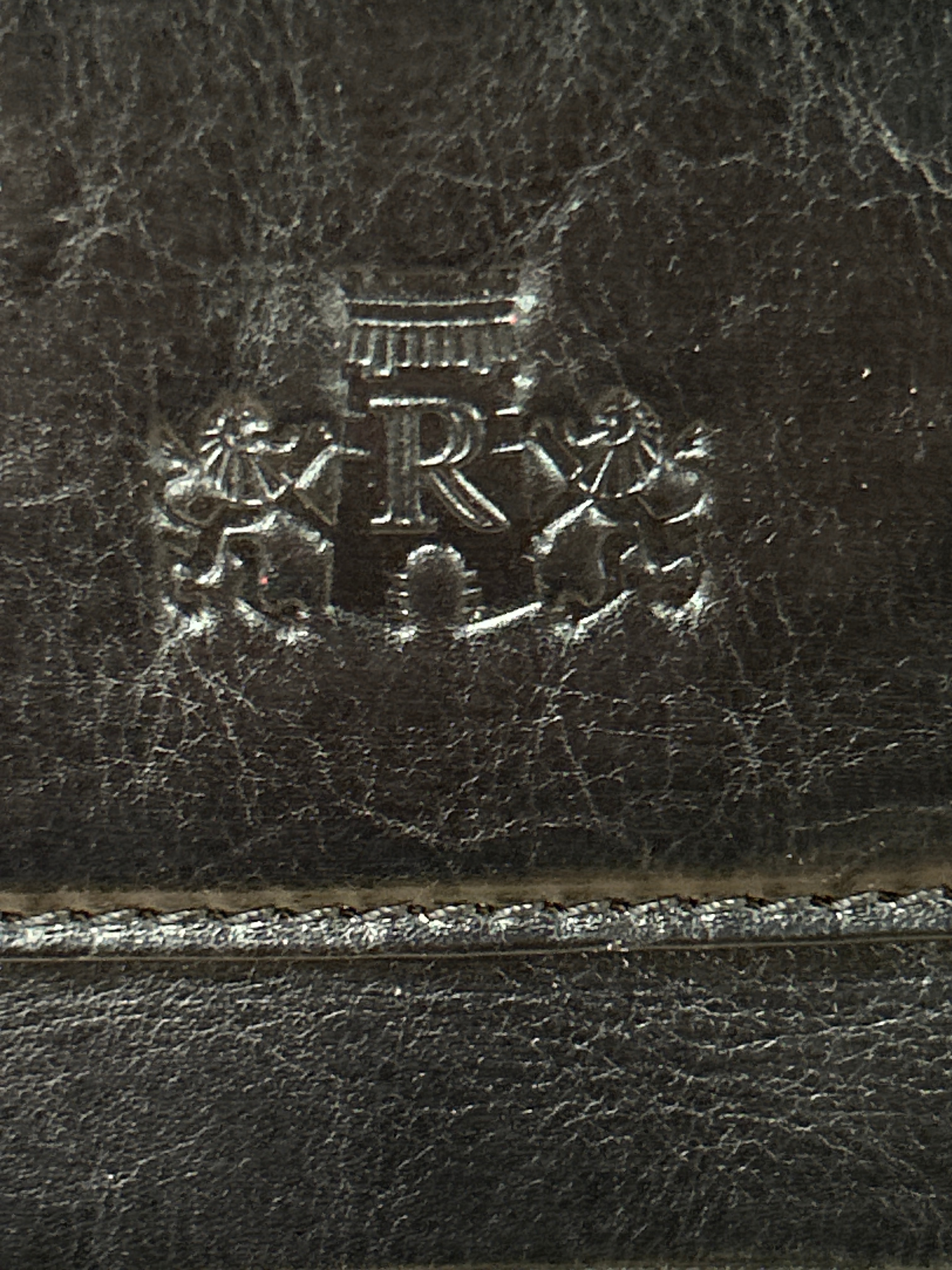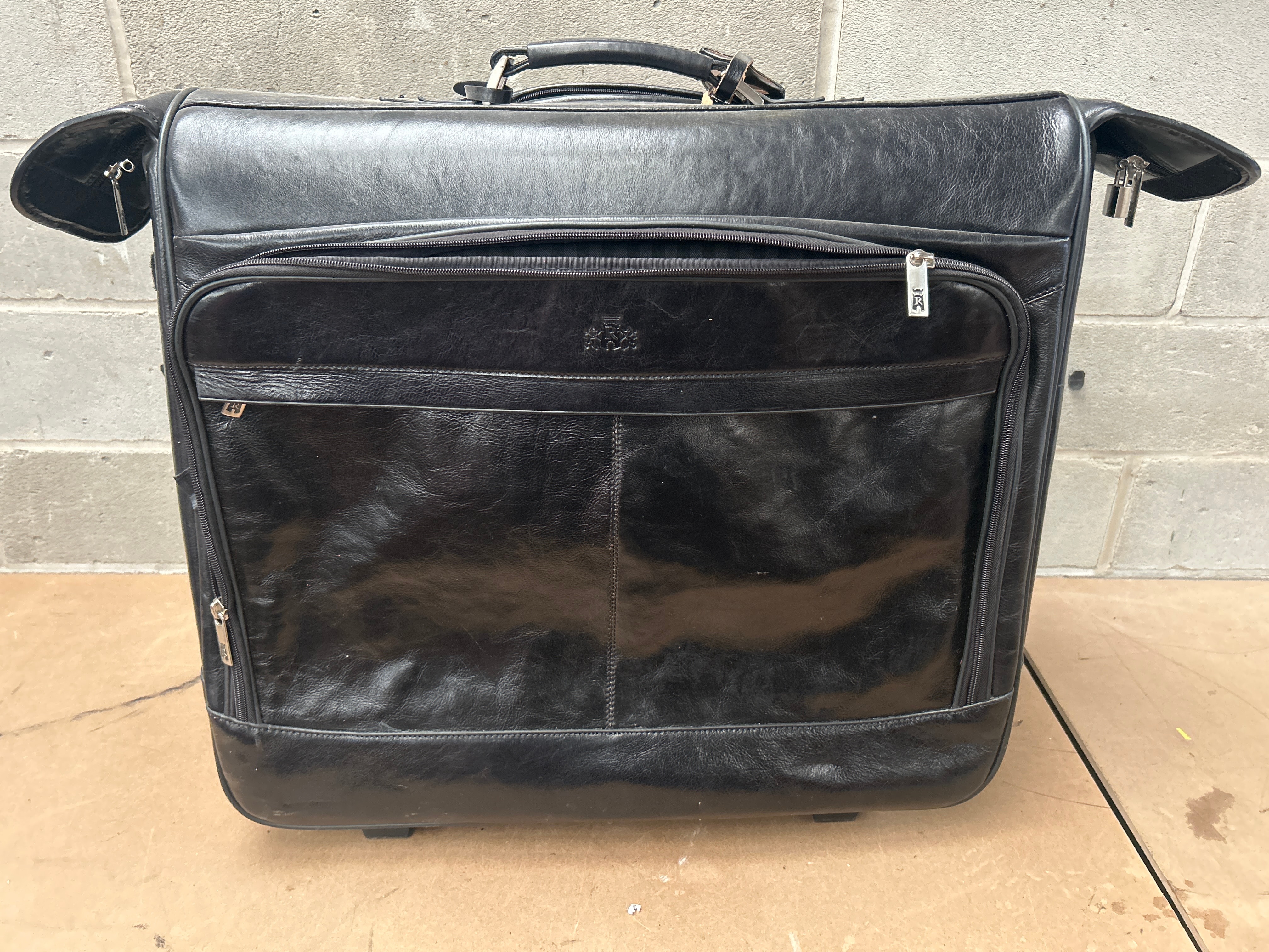 A Time Resistance ‘The Big Sleep’ leather travel suit garment bag. Crafted from black grained leather, designed as a rolling travel bag or business case. It features a top handle, multiple zippered compartments including a large front pocket, and is equipped with wheels at the base. The material exhibits a grained texture with typical creasing, and the hardware is silver-tone metal. A debossed crest-like emblem on the front pocket prominently displays a capital ‘R’ flanked by two rampant heraldic beasts, surmounted by a turreted element, consistent with the Time Resistance brand. The ‘R’ emblem is also visible on at least one zipper pull, while another zipper pull is marked ‘TSA’ with a keyhole symbol, indicating an integrated lock system.