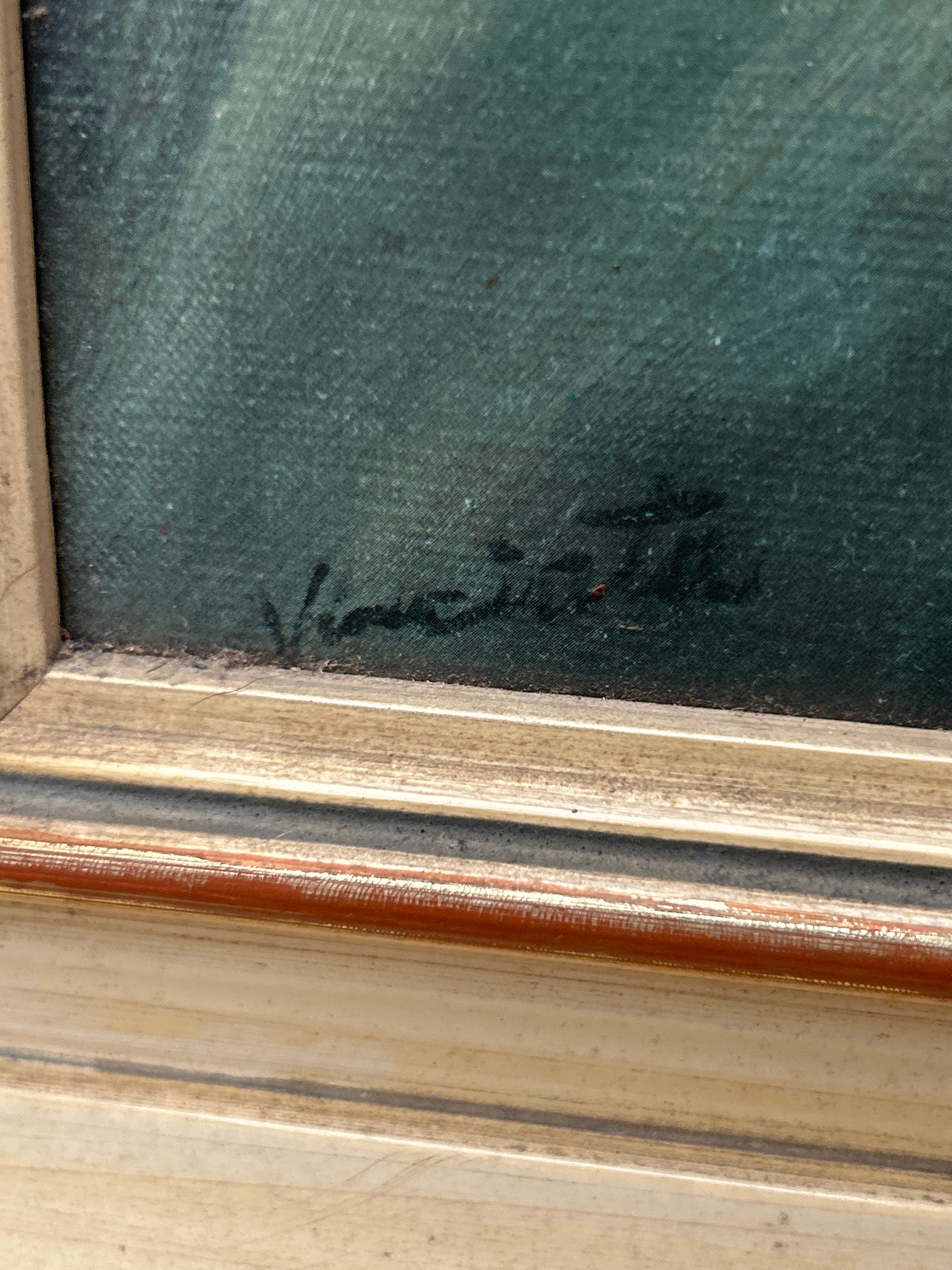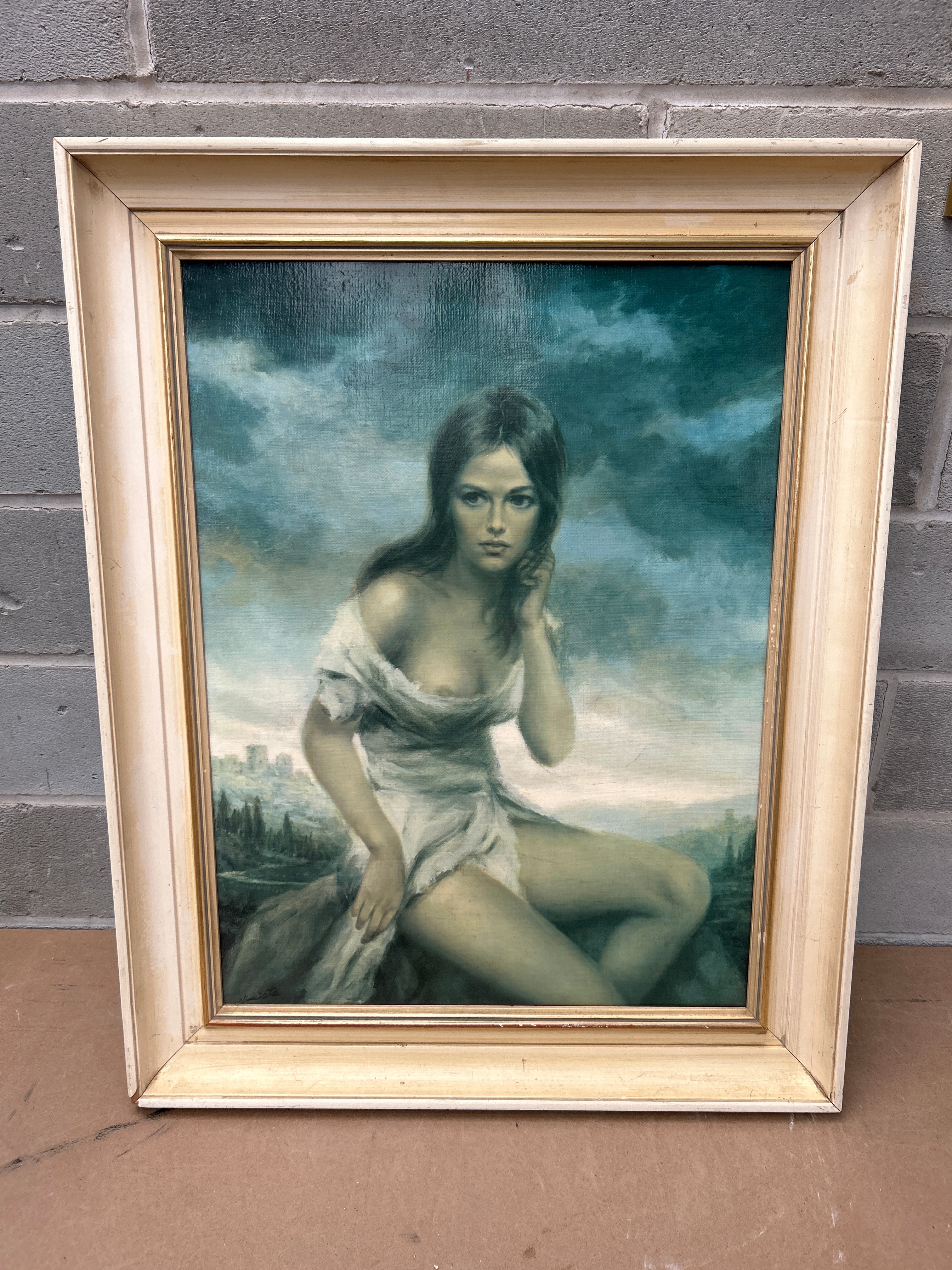 A ‘Broken Silence’ print on canvas by Joseph Wallace King, known as Vinciata, depicting a seated woman in a flowing white garment against a dramatic cloudy blue-green sky and a distant, subdued landscape with architectural elements. The artwork exhibits a realistic, somewhat romanticized style, suggestive of mid-20th century portraiture. A visible signature, appearing to read ‘Vinciata’, is located in the lower left corner of the canvas.