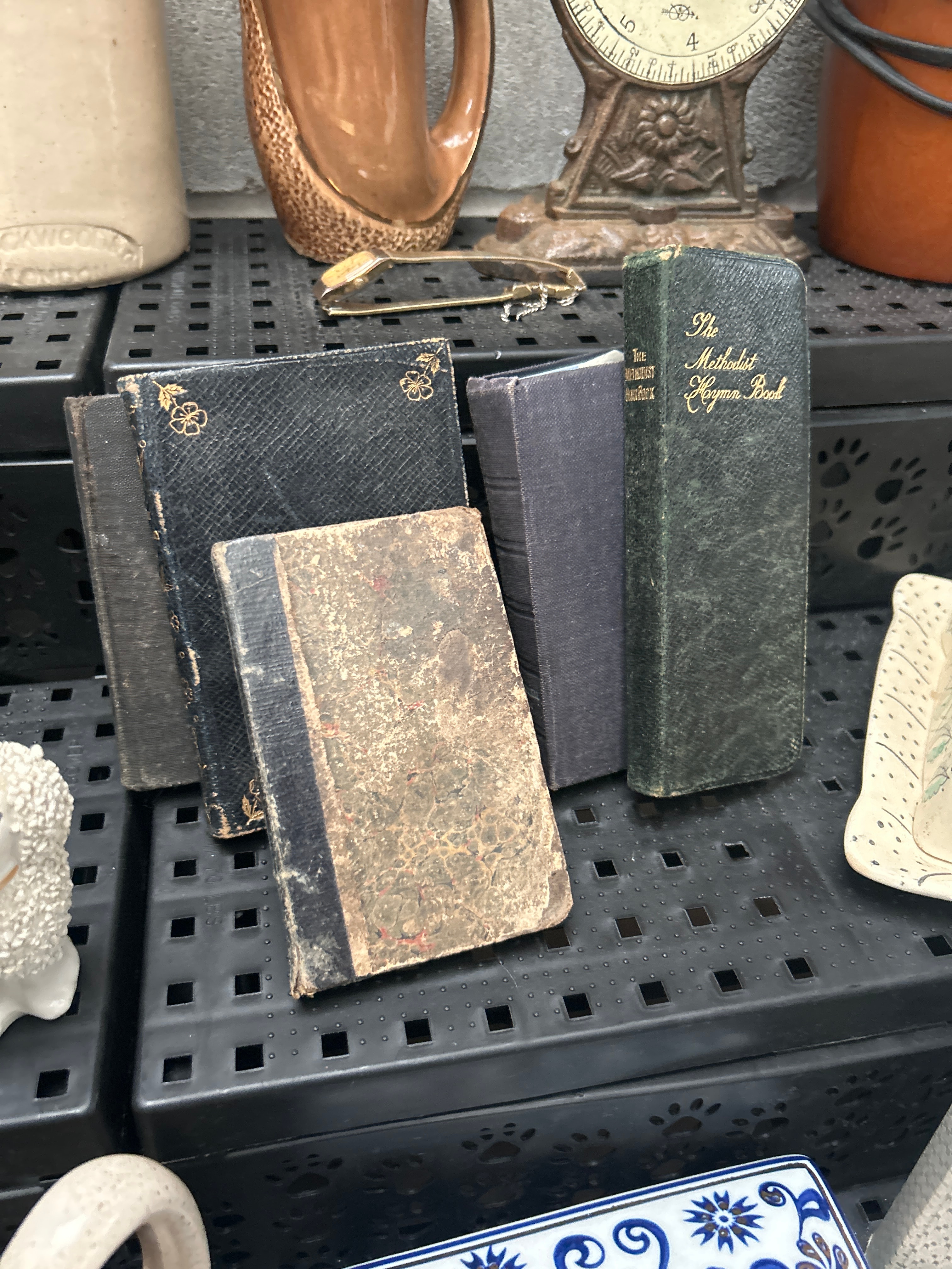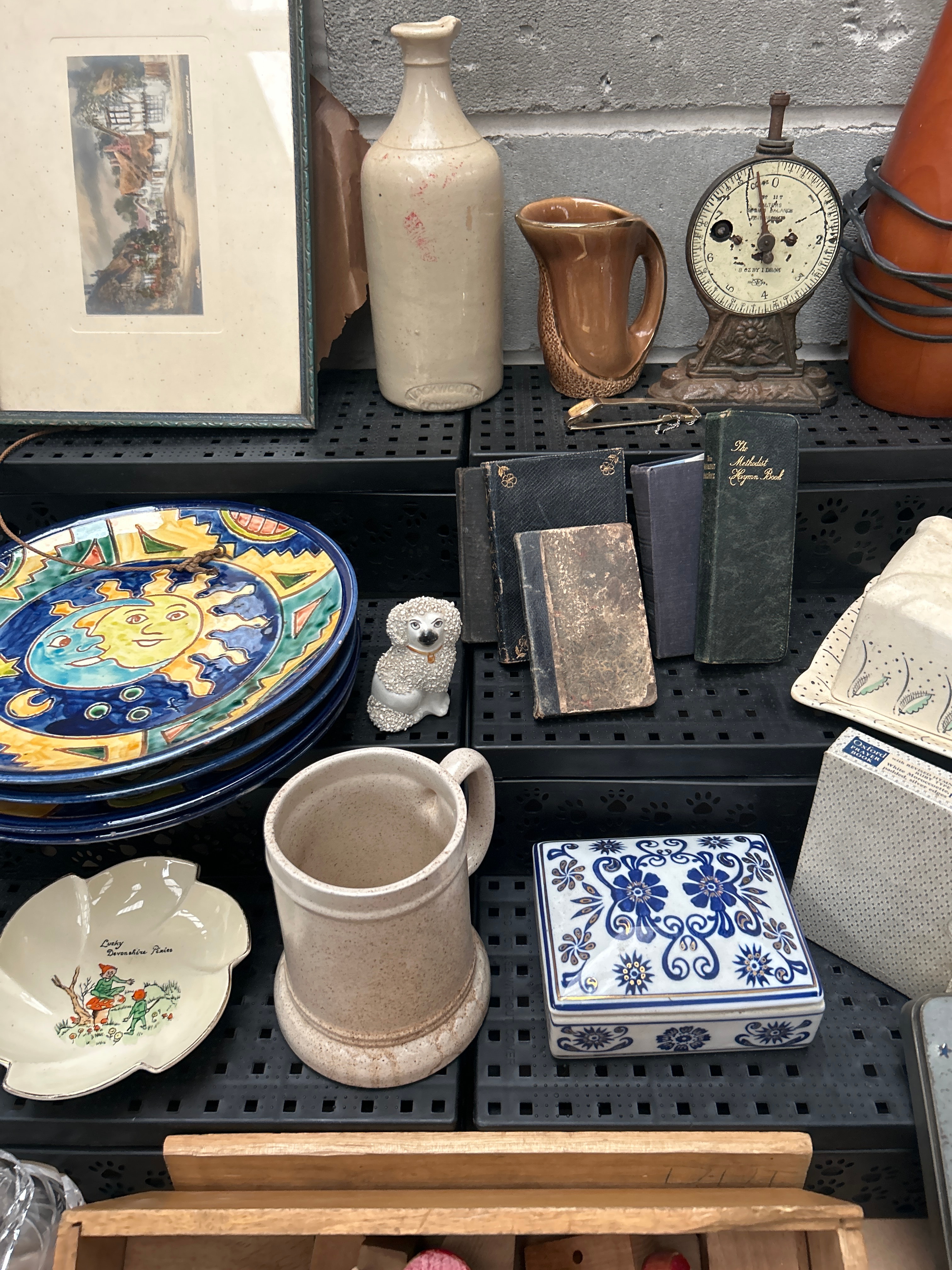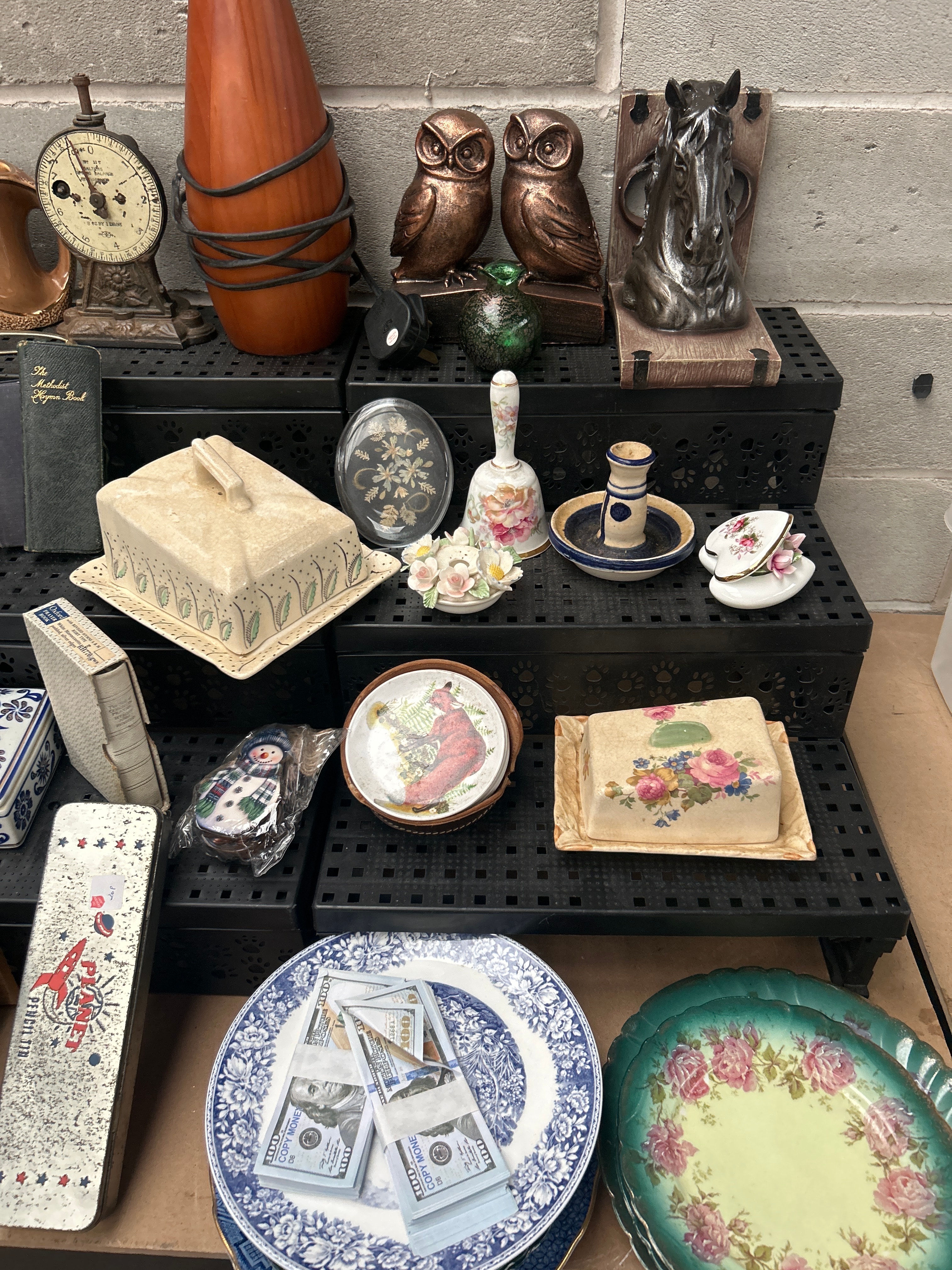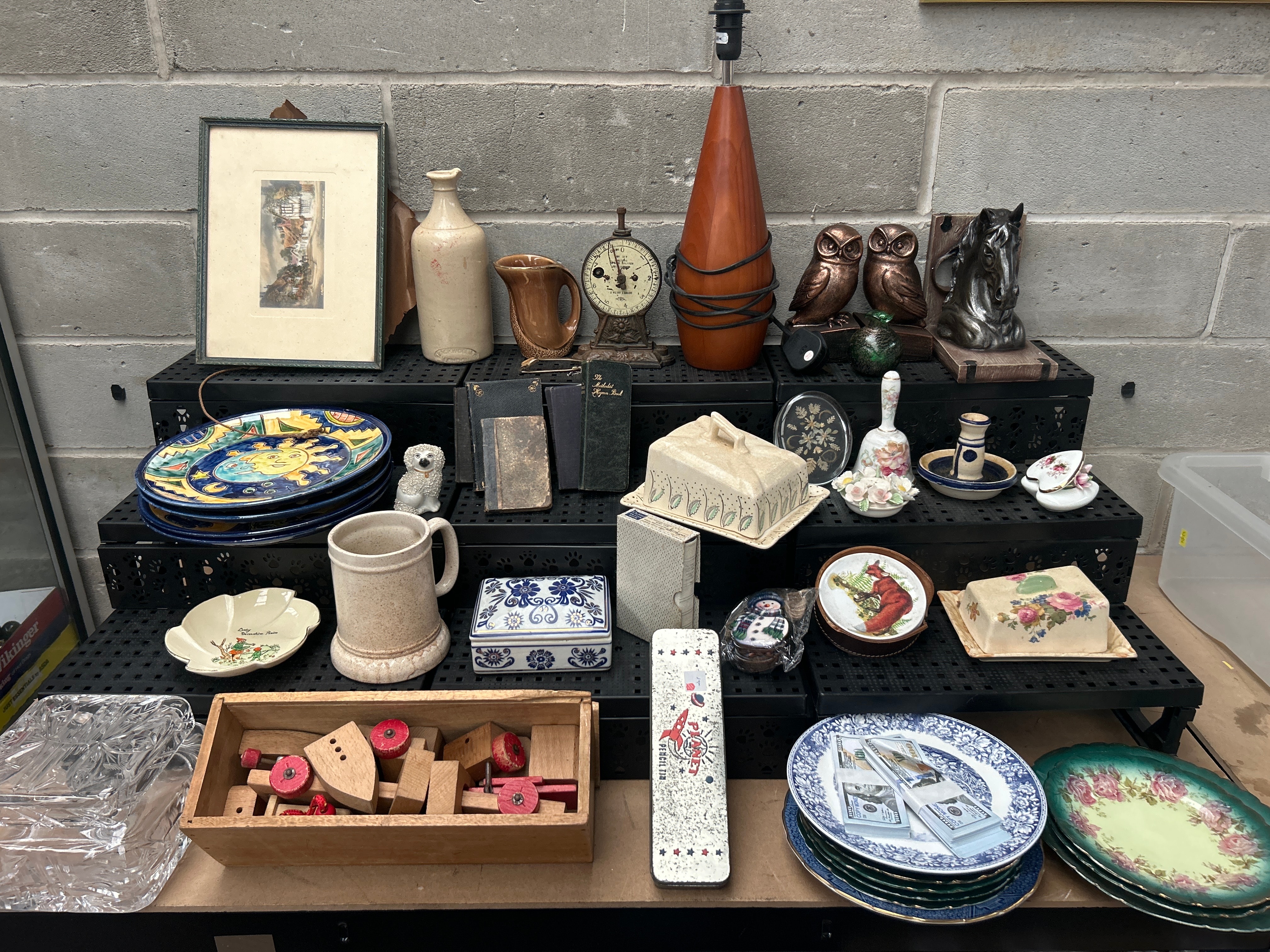 A diverse collection of vintage and decorative household articles, comprising over thirty items. The collection includes a small framed print, a plain stoneware bottle, various ceramic jugs and mugs (some decorated with a folk art sun face design, others with blue floral motifs or plain stoneware texture), and a vintage metal ‘Imperial’ kitchen scale marked ‘Patent Applied For.’ Also present are a modern-style conical lamp base, a pair of metallic owl figurines, and a horse head sculpture. A group of aged bound books, including ‘The Methodist Hymn Book,’ sits alongside decorative ceramic pieces such as a covered butter dish with painted flowers and a small bell. Additional items include a ‘BICYCLE’ branded rectangular tin, a wooden box filled with red and natural wooden toy blocks, a scalloped ceramic dish labeled ‘Colonial America Platter,’ a small decorative plate featuring a cardinal, a group of stacked ceramic plates with a distinct hundred-dollar bill pattern, and a large oval platter adorned with a rose pattern. The collection presents a mix of materials including ceramic, metal, wood, glass, and paper.