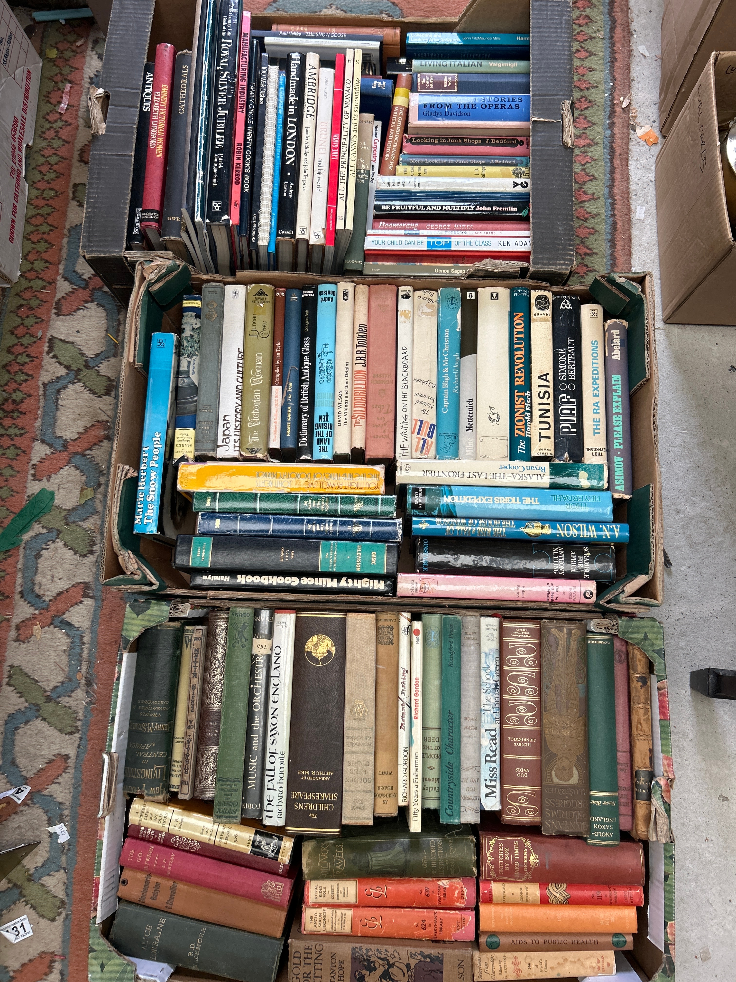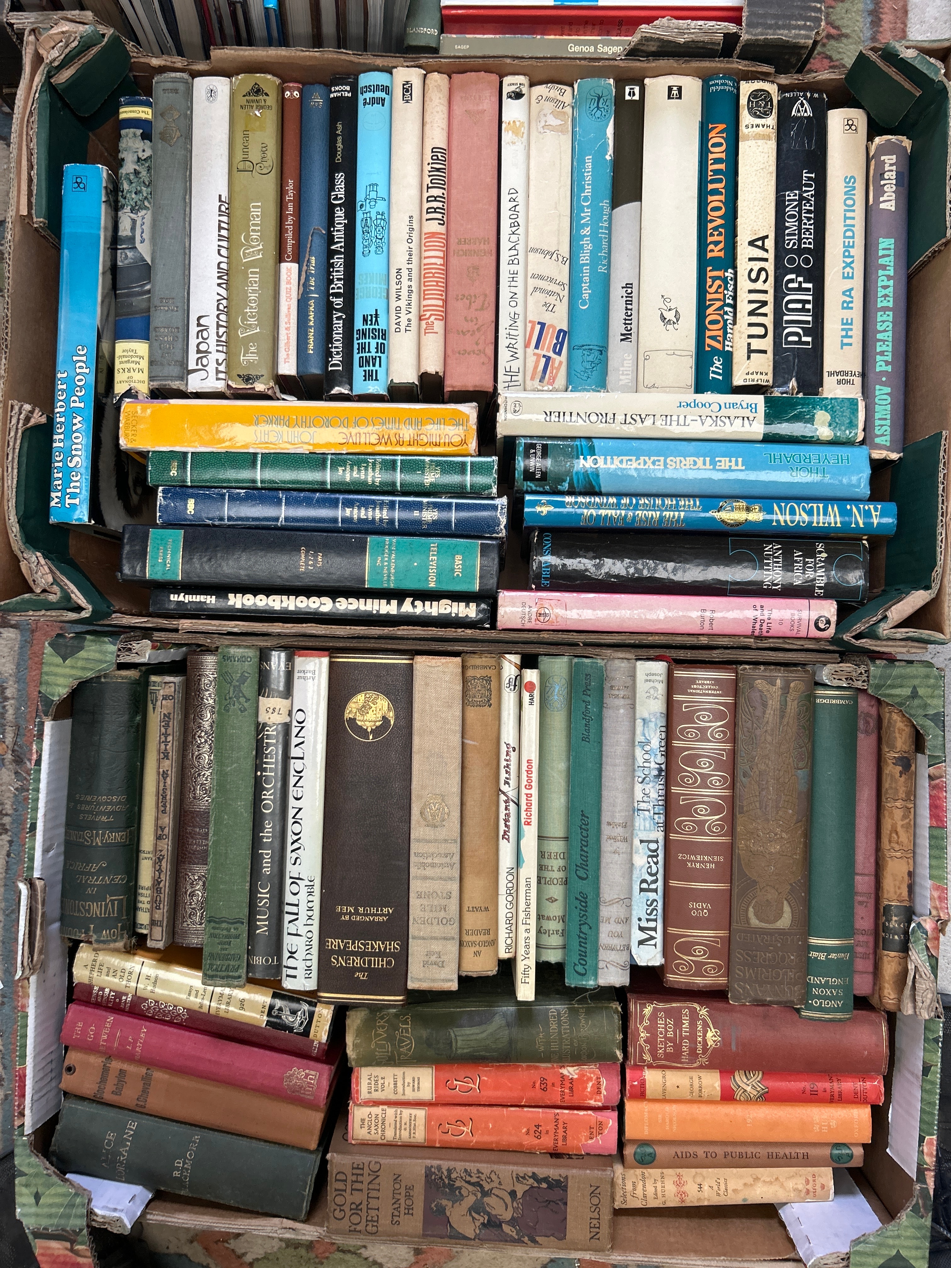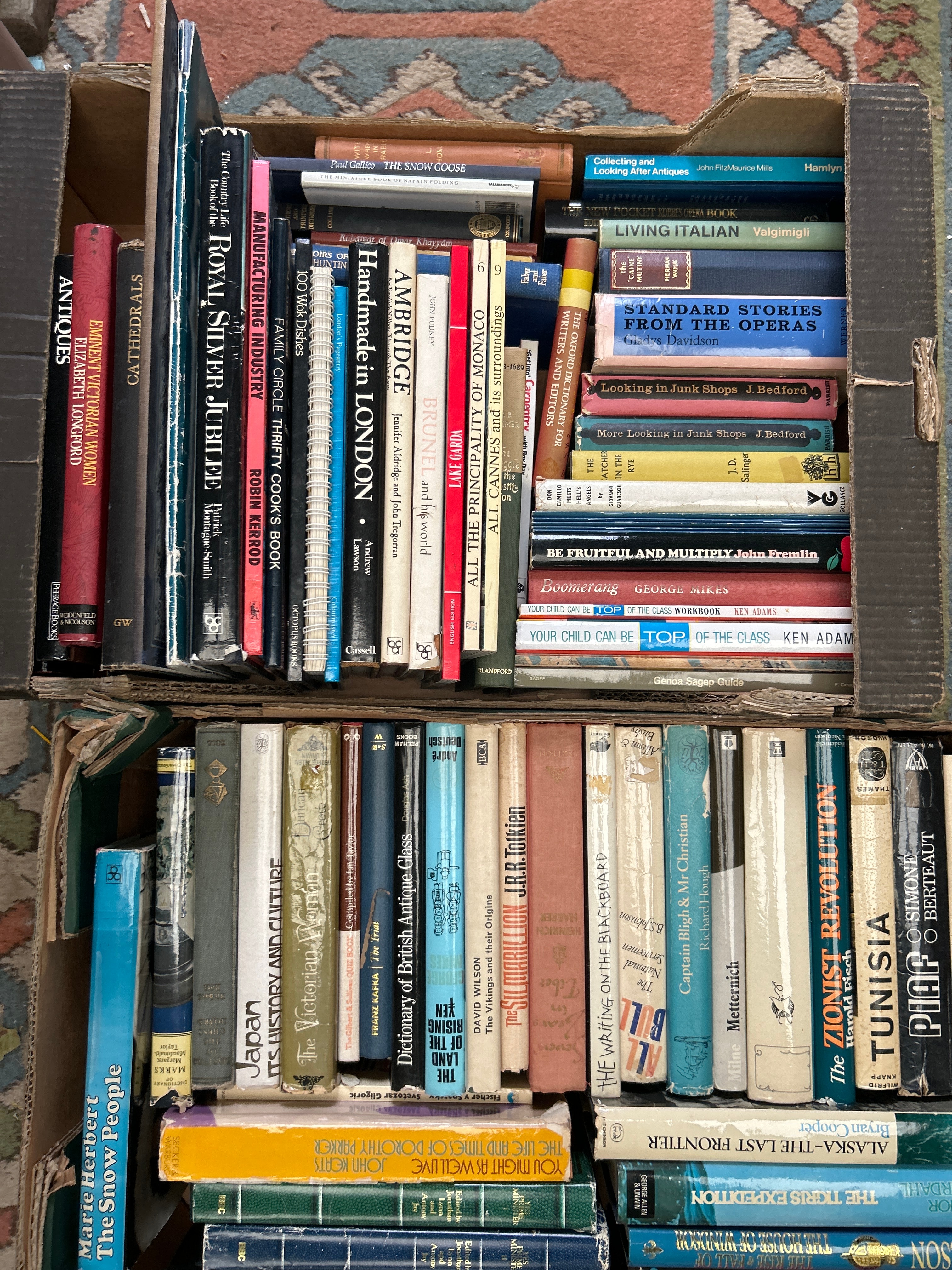 A collection of Irish interest books, presented in four cardboard boxes. This diverse collection spans a wide range of subjects including history, biography, travel, art, language, literature, reference, and general interest. Publications primarily date from the mid-20th century through the early 21st century, exemplified by titles such as ‘Royal Silver Jubilee’ (1977). The lot comprises mostly hardcover editions with cloth or paper-covered boards, alongside some softcovers. The text is predominantly in English, with several visible French titles including ‘Trois les Operas’ and ‘Le mystère des origines’, as well as some Italian language books.