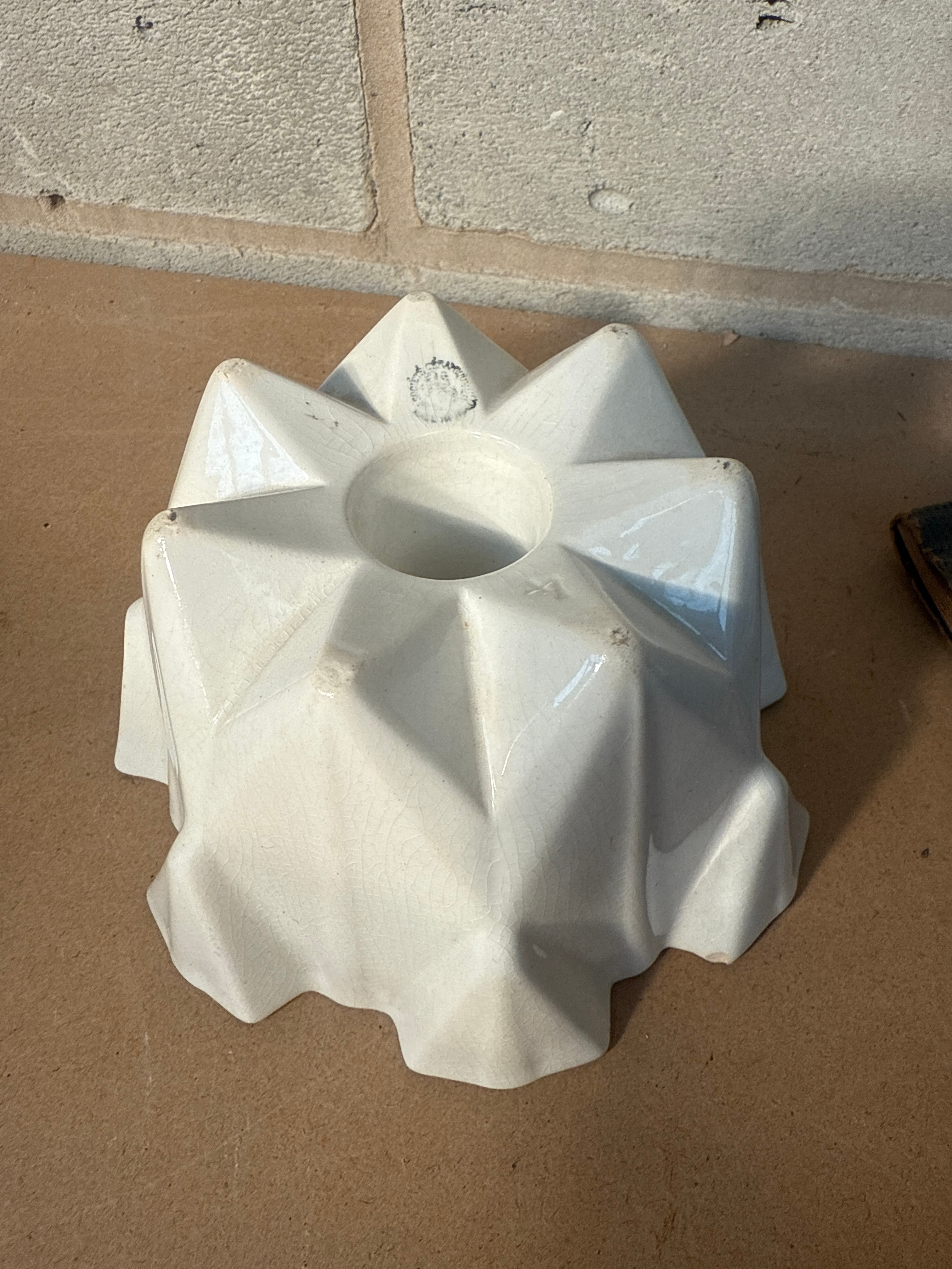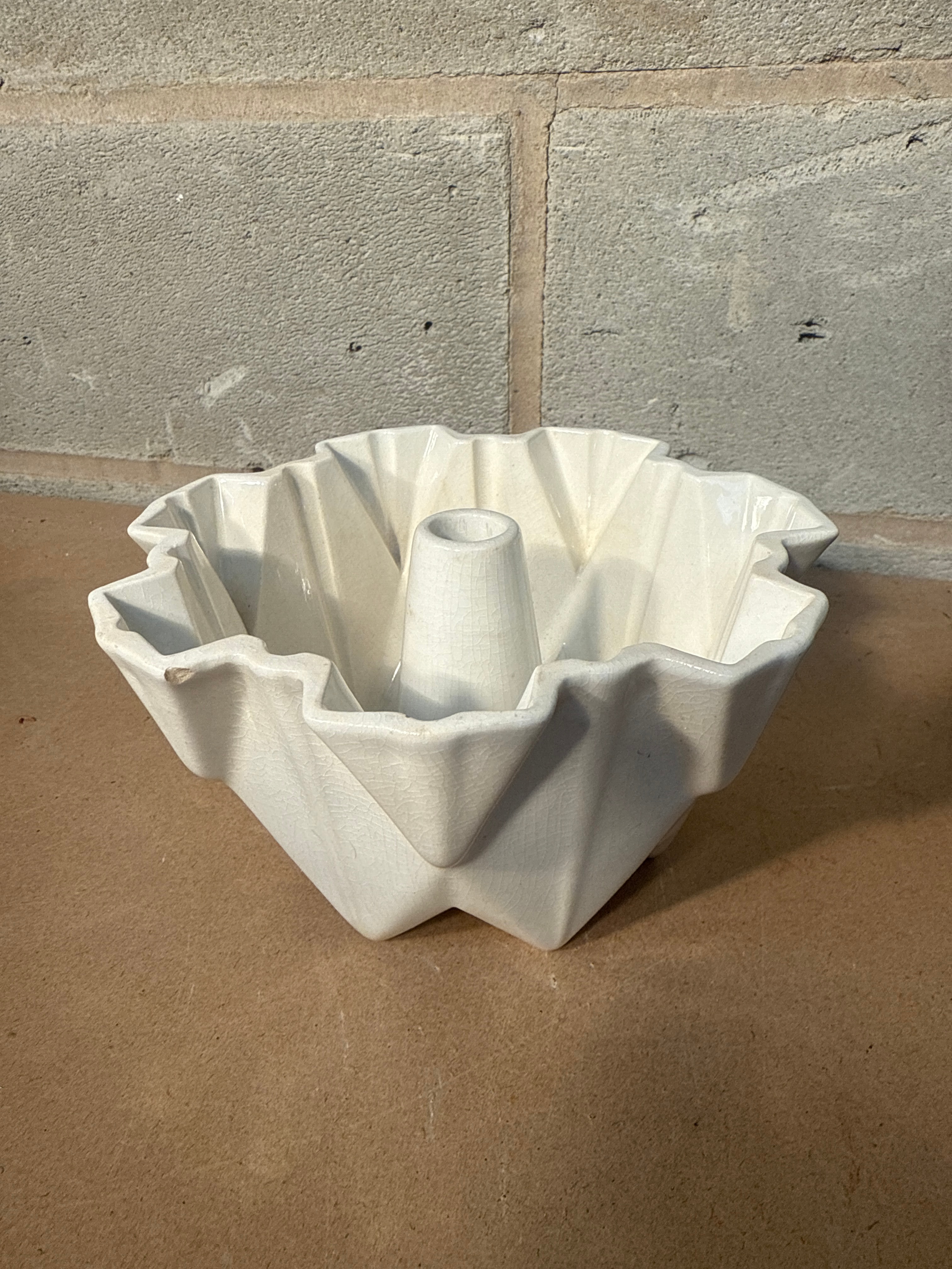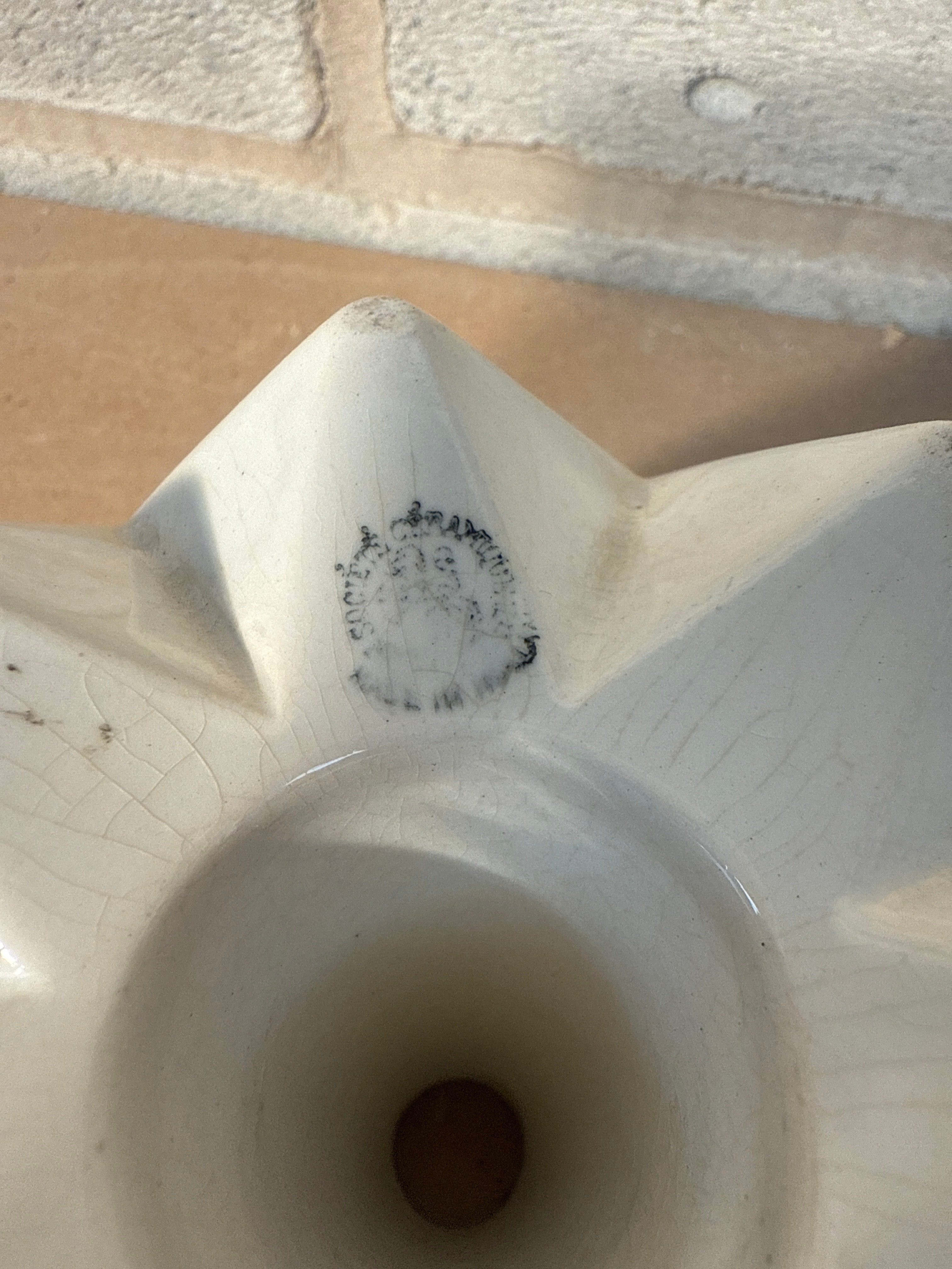 A white glazed ceramic food mold, characterized by a distinct geometric, star-like shape with fluted sides and a central conical core. The inverted base features a faint, circular manufacturer’s mark with an indistinguishable crest or crown motif and illegible text.