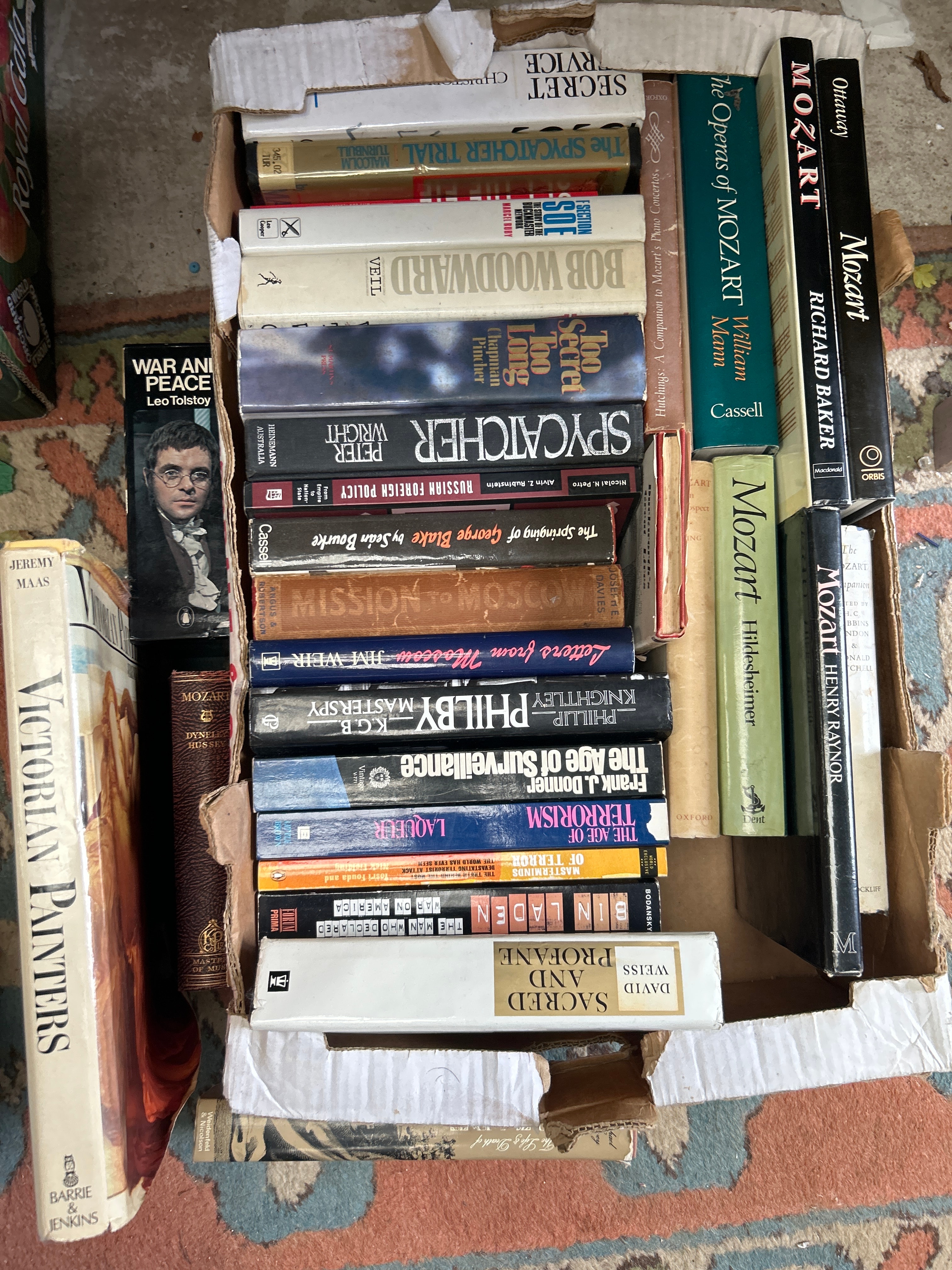 This collection comprises numerous predominantly English-language books, primarily hardcover and paperback editions, stored haphazardly within a utilitarian cardboard box. The visible titles suggest a mix of non-fiction, including espionage (e.g., “The Spycatcher Trial,” “Spycatcher,” “Philby K.G.B.”), political history (“Russian Foreign Policy,” “Mission to Moscow,” “Letters from Moscow”), current affairs/terrorism (“The Age of Terrorism,” “Masterminds of Terror,” “Bin Laden”), and biographies (multiple “Mozart” titles by various authors, “War and Peace” by Leo Tolstoy, “Victorian Painters” by Jeremy Maas, “Bob Woodward Veil”). One “Mozart” book by Dynley Hussey (Oxford) features a textured, possibly faux leather, binding.