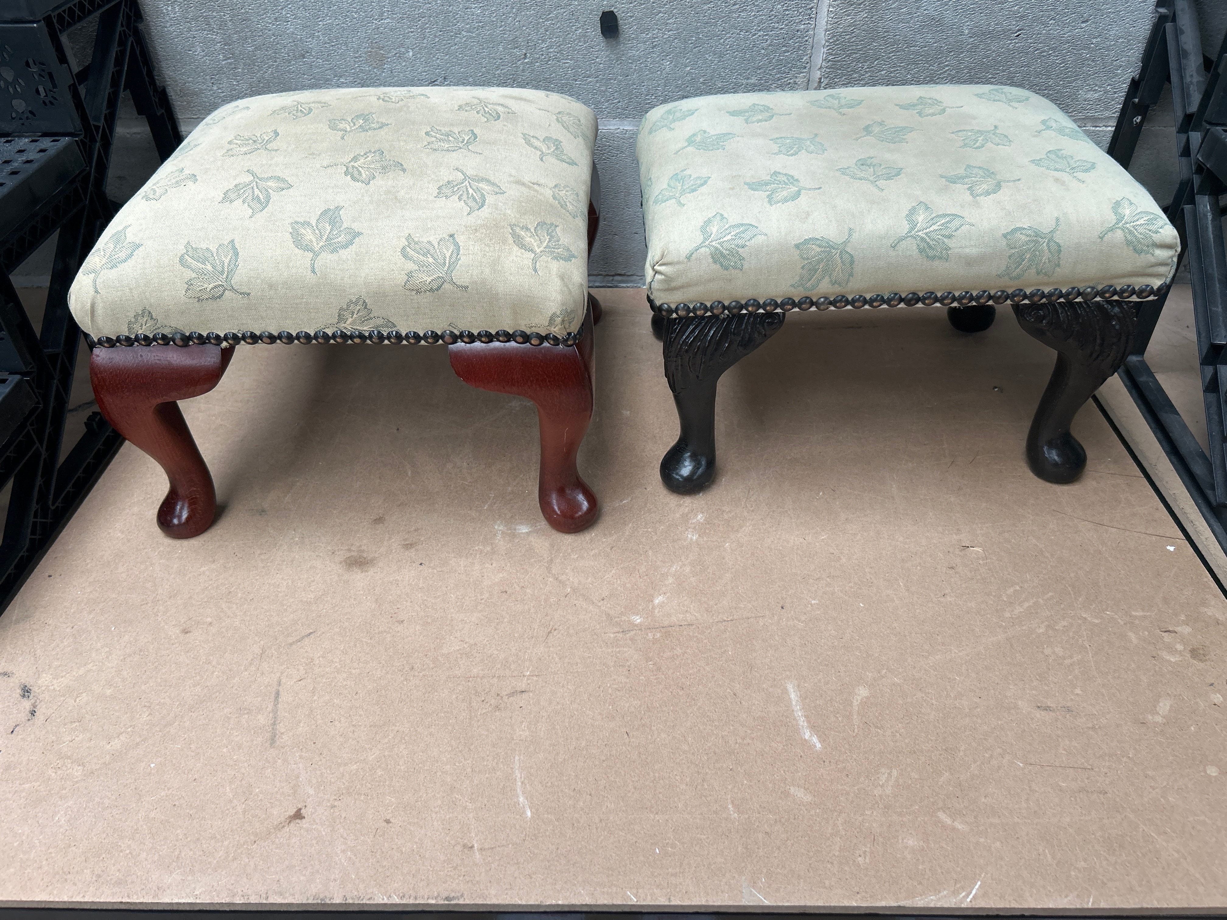 A pair of upholstered footstools, each featuring cabriole legs and a cream-colored fabric top patterned with light green/teal leaves. The upholstery on both pieces is trimmed with decorative metal studs along the lower edge. One footstool has a polished reddish-brown wooden finish on its legs, consistent with mahogany, which terminate in a pad foot. Its companion piece exhibits a darker, possibly ebonized, polished wood finish on its cabriole legs, also with pad feet, and displays subtle carved detail at the top of the legs. No visible text or markings are present.