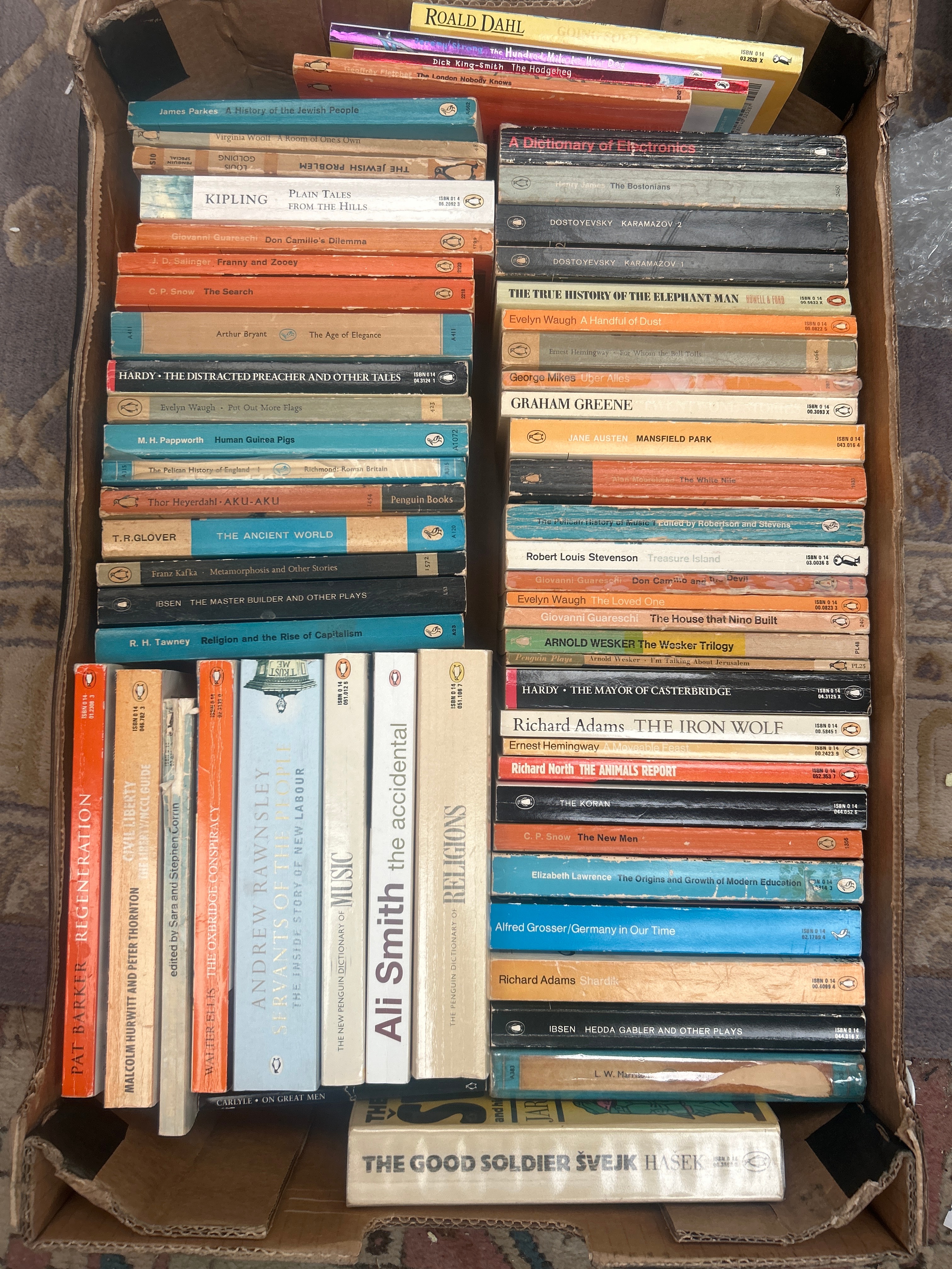 A substantial collection of primarily paperback books, predominantly 20th-century editions. Many are identifiable as Penguin Books, featuring their distinctive logo and characteristic color-coded spines. The collection includes a diverse range of authors and genres, with visible titles by Roald Dahl, Rudyard Kipling (‘Plain Tales from the Hills’), Fyodor Dostoevsky (‘Karamazov’), J.D. Salinger (‘Franny and Zooey’), Franz Kafka (‘Metamorphosis’), Henrik Ibsen (‘The Master Builder’), Ernest Hemingway, Jane Austen (‘Mansfield Park’), Graham Greene, and Richard Adams. Non-fiction titles include ‘A Dictionary of Electronics,’ ‘A History of the Jewish People,’ ‘The Koran,’ and ‘The Good Soldier Švejk.’ Another notable title is ‘George Mikes Uber Alles.’ Many spines display ISBNs and publisher series information. The entire collection is housed in a worn cardboard box.