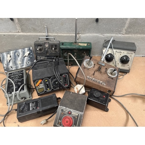 This lot comprises a collection of approximately ten vintage electronic control units, power supplies, and radio transmitters, primarily for hobbyist applications such as model railways or radio-controlled models, dating likely from the mid to late 20th century. The items are constructed from various materials including plastic, painted metal, and brushed aluminum, featuring numerous dials, switches, and antenna. Visible brand names and markings include “MacGregor 358 Jr Series,” “HORNBY H POWER CONTROL UNIT A.C. ONLY LTD.,” “900 Power Control,” “Duette,” “FUTABA” (with accompanying Japanese text “マルチコントローラー” translating to “Multi Controller”), “ACDOMS,” and “Stabo.” All units include various attached power cords and plugs.