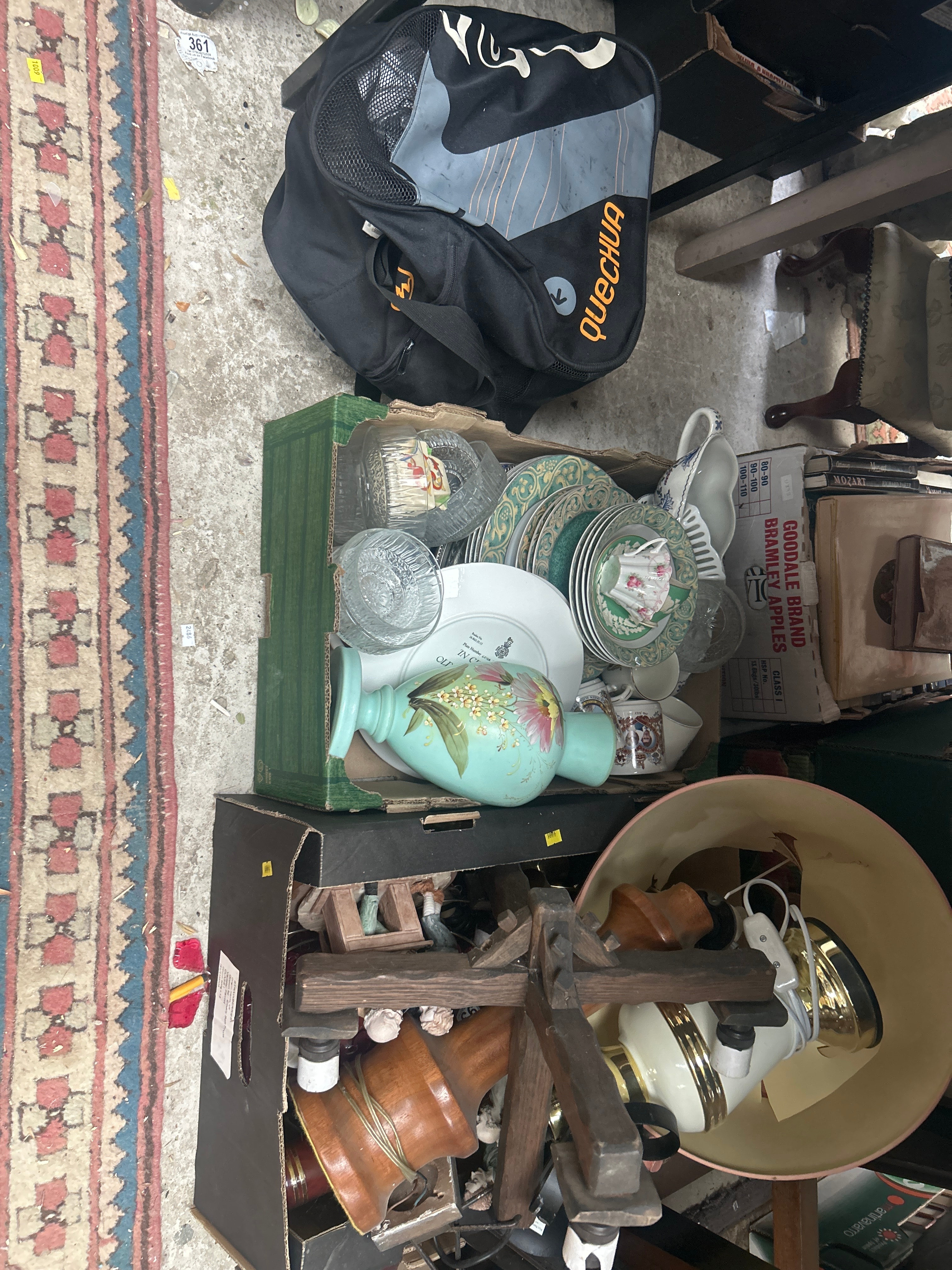 This lot comprises a varied collection of household items. It includes a black “QUECHUA” brand synthetic fabric backpack and an oriental-style rug featuring geometric patterns in red, beige, and blue. Also present are two cardboard boxes. The green box contains assorted ceramic and glass tableware, specifically a group of plates with green and yellow vine patterns, a light blue ceramic vase with hand-painted pink and yellow floral motifs, clear pressed glass bowls, and a white ceramic jug with blue floral decoration. The black box holds miscellaneous items, including components of at least two table lamps with turned wooden and ceramic bases (one white with gold banding), alongside a light-colored lampshade. A stack of books, prominently featuring “MOZART” titles, and a partially visible box marked “GOODDALE BRAND BRAMLEY APPLES” are also part of the lot. An auction tag from “Prestige Auctioneers” with the number “361” is affixed near the rug.