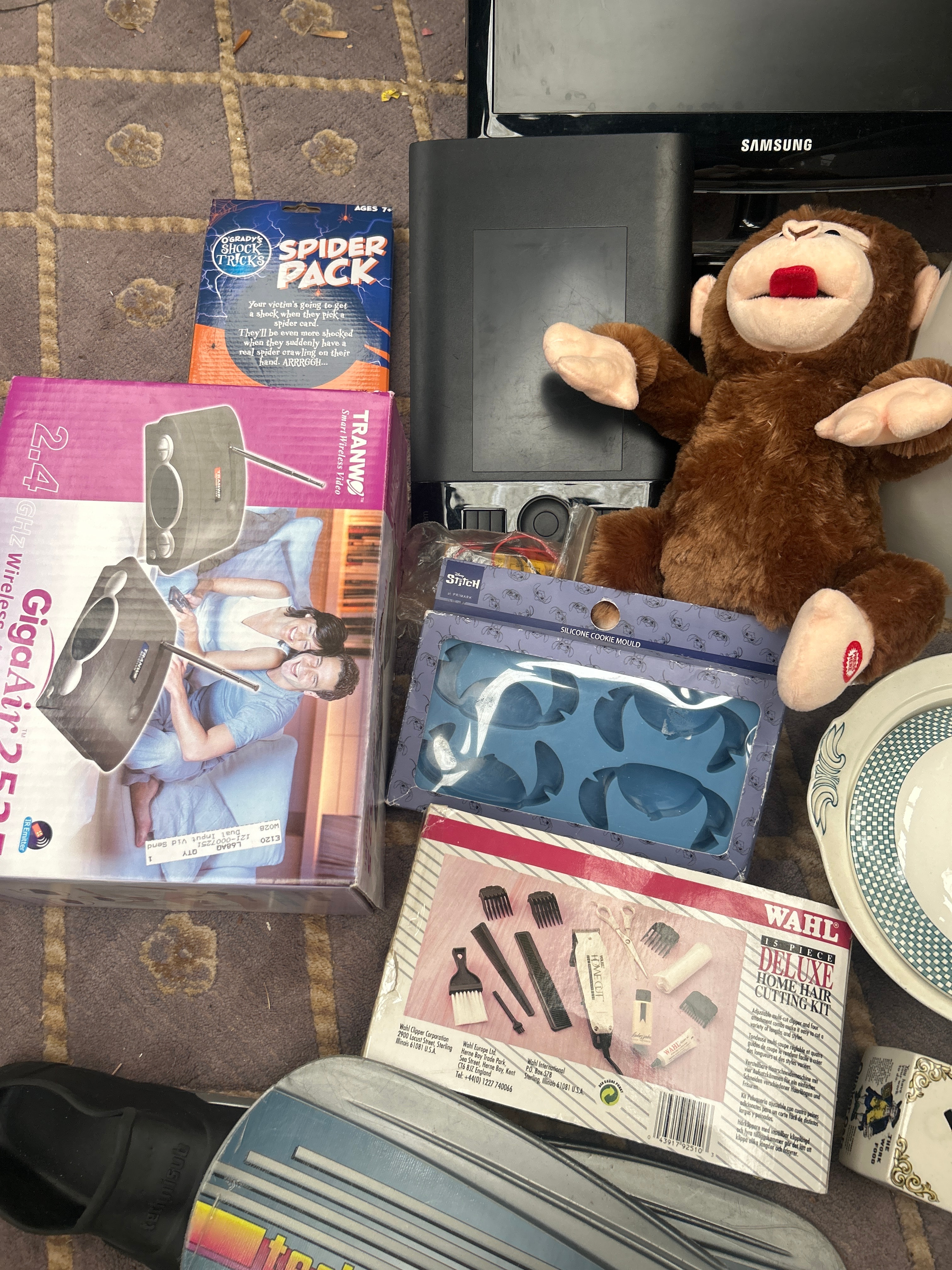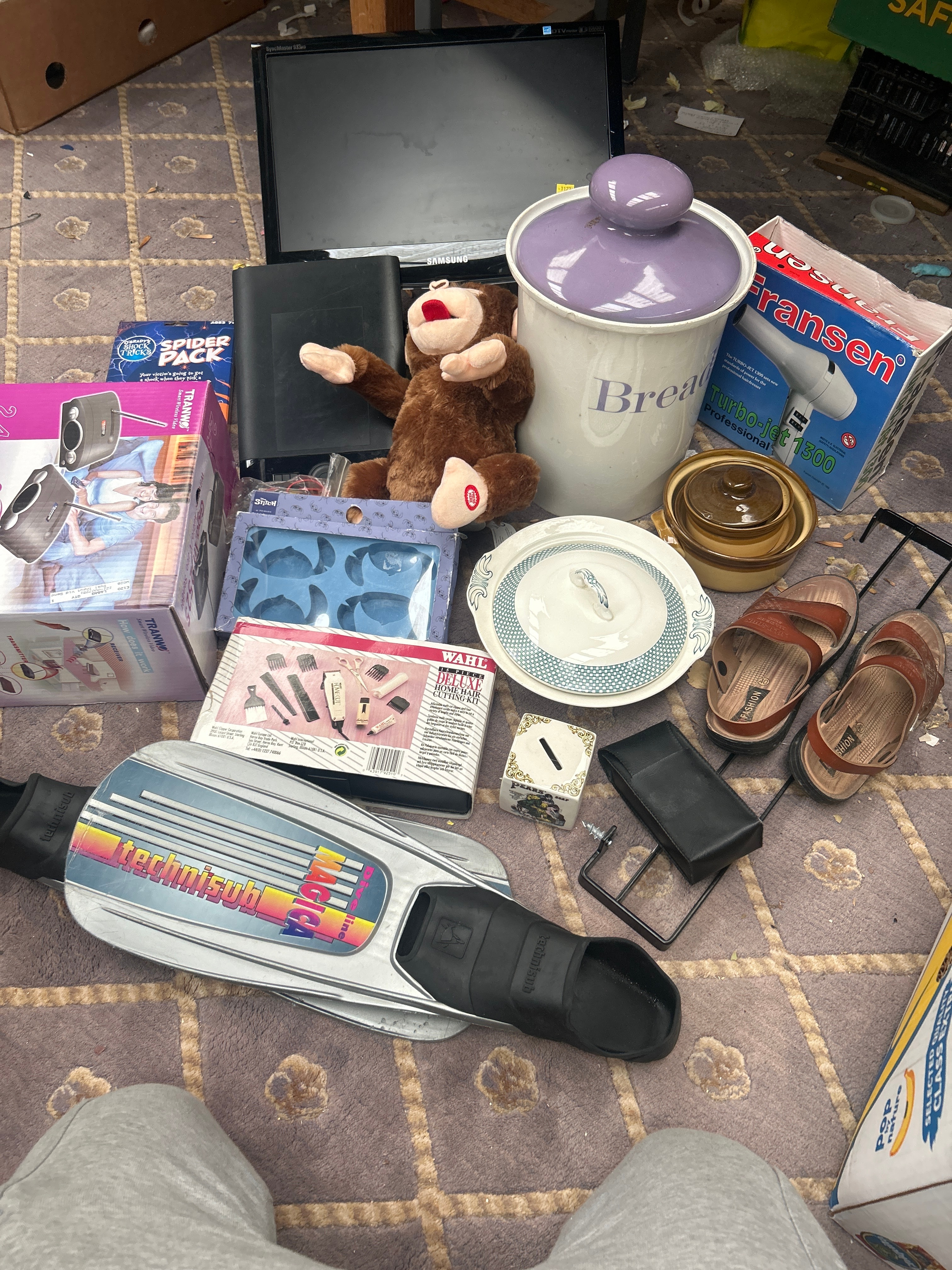 A pair of Technisub diving fins, black and silver with multi-colored accents, forming part of a diverse collection. The lot also includes a black Samsung flat-screen monitor, a large cream-colored ceramic “Bread” canister with a purple lid, and a brown plush monkey toy. Further items comprise a stack of white ceramic plates with blue patterns, a pair of brown open-toed sandals, a black wallet, two brown ceramic bowls, and a small decorative box. Several items are presented in their original packaging, including a pink-boxed “Trainwo GiggAir TM 2.4 Wireless Multimedia Speakers” set, a blue-boxed “Silicone Cookie Mould,” a “Spider Pack” card game, a “WAHL DELUXE HOME HAIR CUT KIT,” and a “Transen Professional 1500” hairdryer.