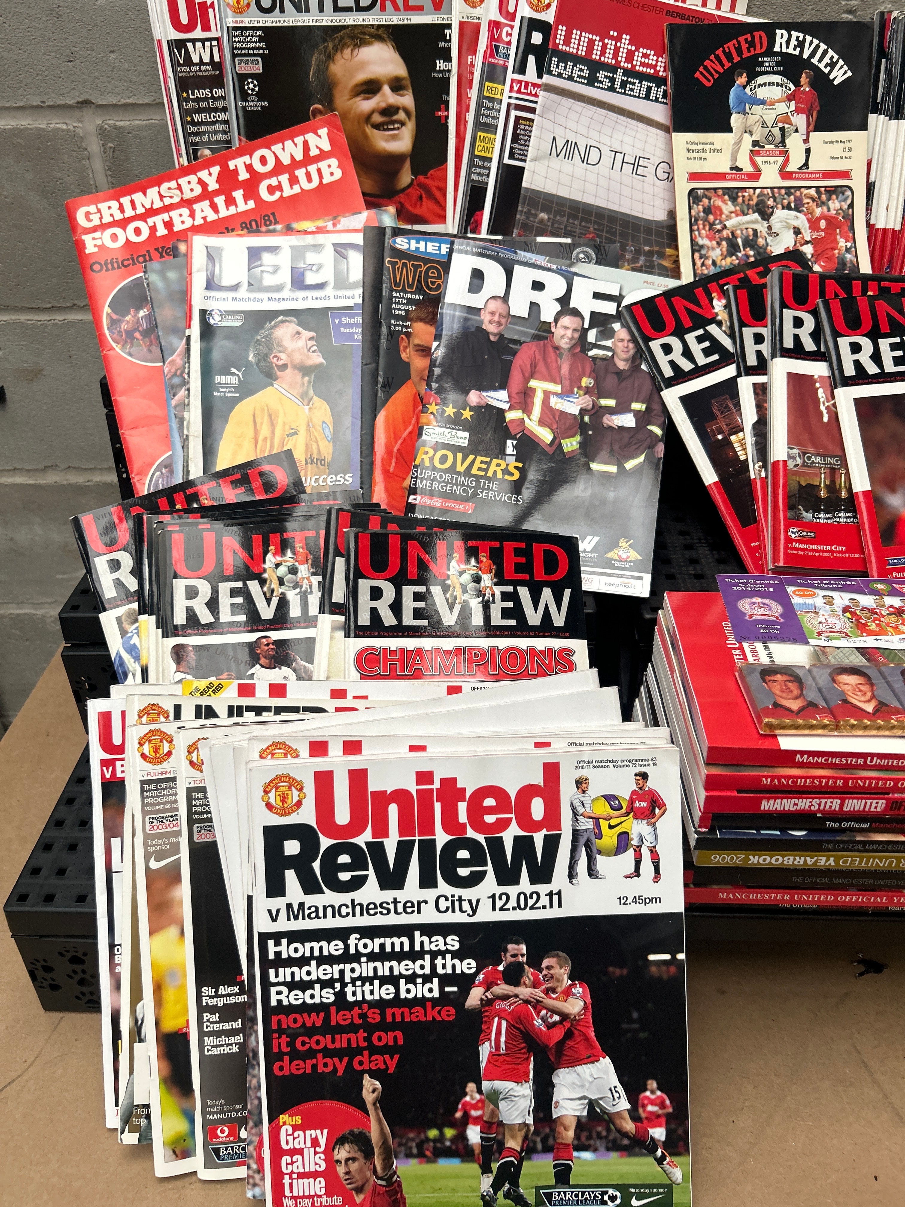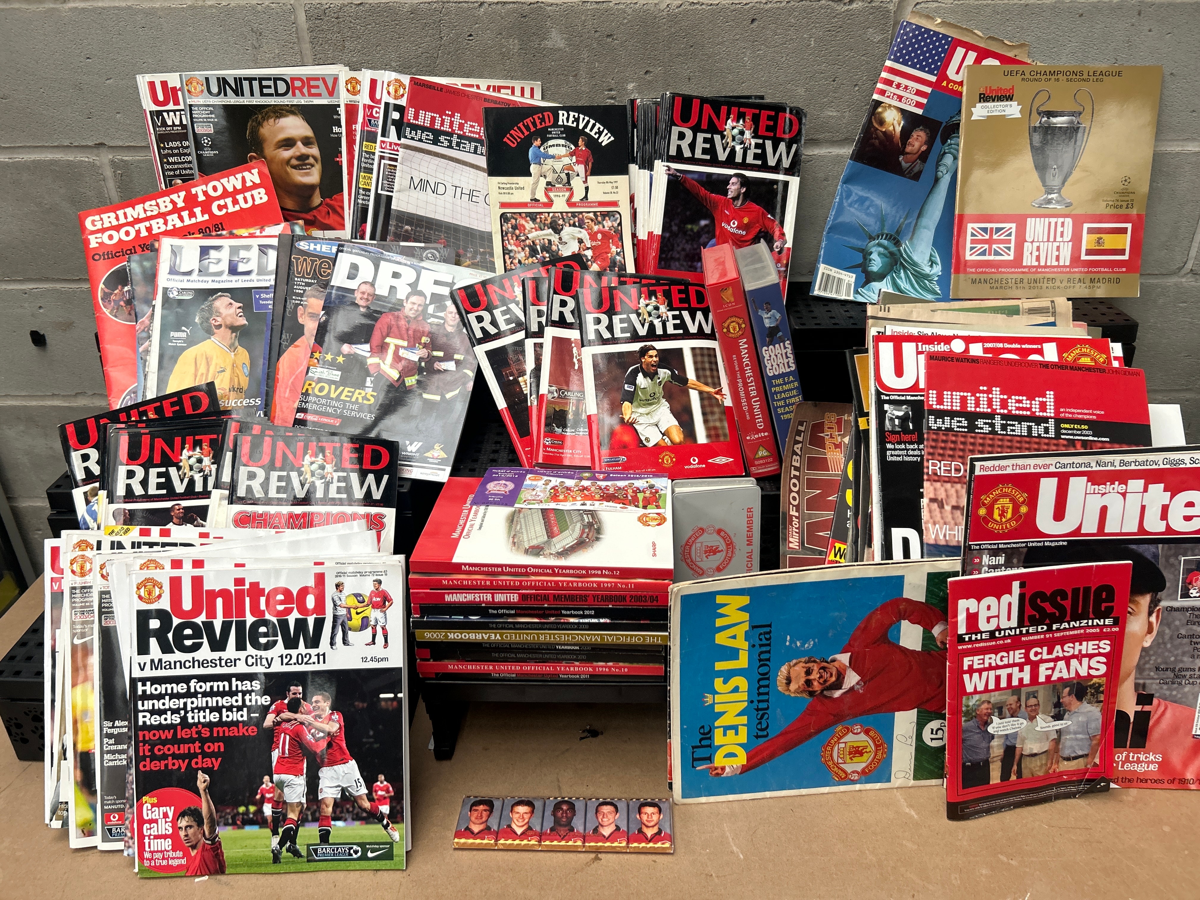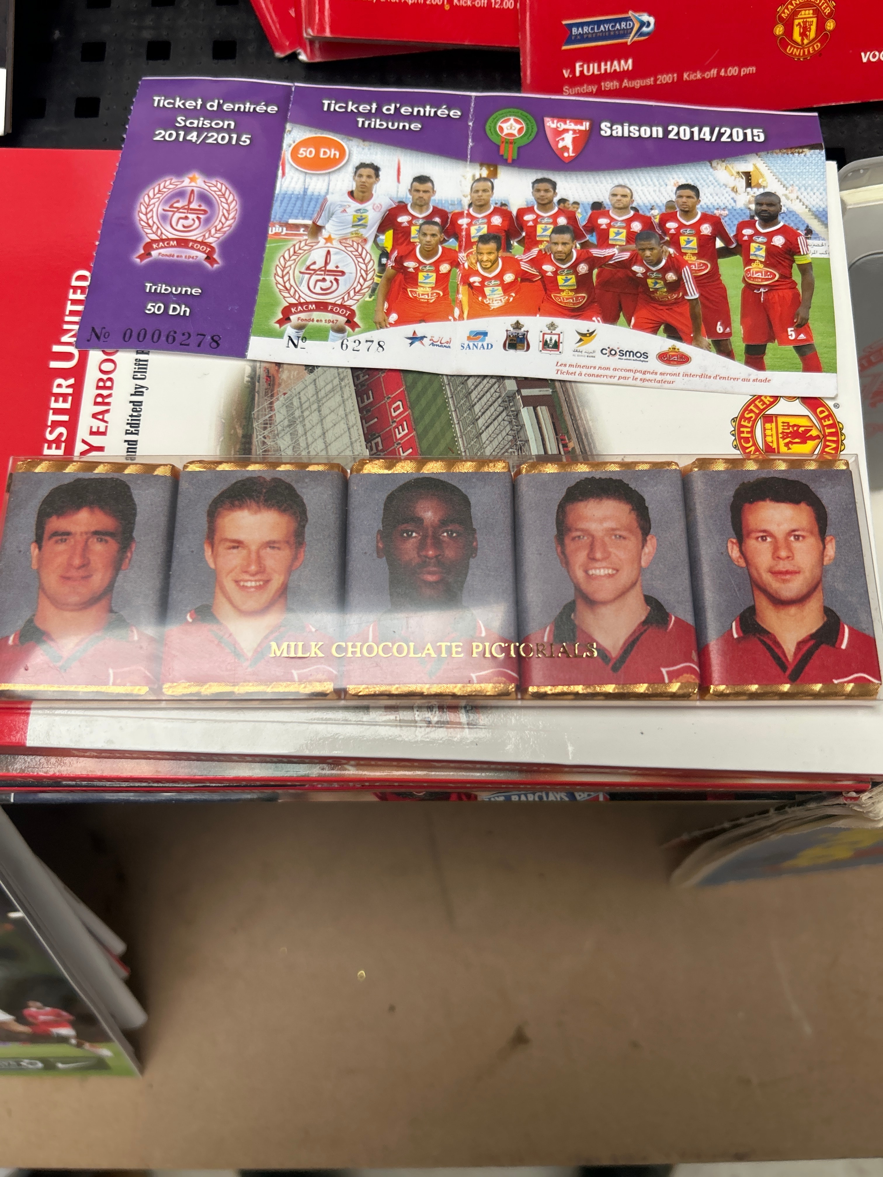 A substantial collection of Manchester United and other football memorabilia, predominantly centered around Manchester United Football Club. The collection comprises numerous “United Review” magazines, many bearing dates ranging from the early 2000s to the 2010s (e.g., a visible date of 12.02.11), and several “Manchester United Official Yearbooks,” including 2000/2001 and 2014/2015 editions. Also present are other related Manchester United publications such as “red issue THE UNITED FANZINE,” alongside additional football publications including “GRIMSBY TOWN FOOTBALL CLUB Official Yearbooks” and a book titled “THE DENIS LAW testimonial.” Non-publication items include a replica of the “UEFA CHAMPIONS LEAGUE” trophy, a “Saison 2014/2015” football match “Ticket d’entrée” for the “Tribune” priced at “50 Dh” from the Moroccan “Wydad Athletic Club,” and a multi-pack of “MILK CHOCOLATE PICTORIALS” depicting five distinct Manchester United players. The primary materials are paper and card for the publications, with some plastic/metal elements for the trophy and composite packaging for the chocolate bars.