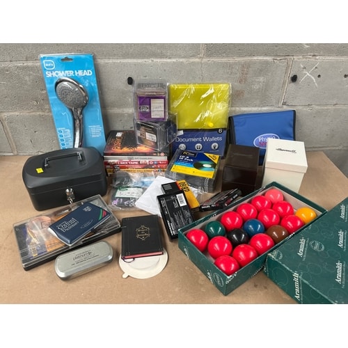 A set of Aramith snooker/pool balls, presented in their original green boxes. This lot further comprises a diverse collection of modern consumer goods, primarily constructed from plastic, metal, paper, and fabric. Key items include a new, packaged shower head; a black, locking storage case; an Oxford Dictionary and other books; a stack of contemporary DVDs, including titles such as ‘The Descent’ and ‘Sex Tape’; various stationery items including ‘Document Wallets’ and ‘PC-CD’ media; a ‘Physio’ branded blue fabric bag; and small gift or storage boxes, one partially visible with ‘Brannells’ text.