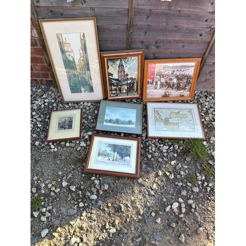 This lot comprises a collection of seven framed items, including six prints or artworks and one historical map, all presented in various wooden frames. The collection exhibits diverse styles and likely spans mixed periods. Specific items include a tall vertical architectural print depicting a narrow street scene, a smaller print of a church (potentially a color etching in the style of Ernst Geissendorfer’s “Rothenburg Clock Tower”), a sepia-toned photographic print portraying a crowded urban scene, a small black and white architectural etching or drawing, and two watercolor-style landscape prints, one featuring a riverine vista and the other a tree-lined avenue. A prominent item within the collection is a framed historical map of the Mediterranean region, clearly inscribed with “MARE MEDITERRANEUM”.