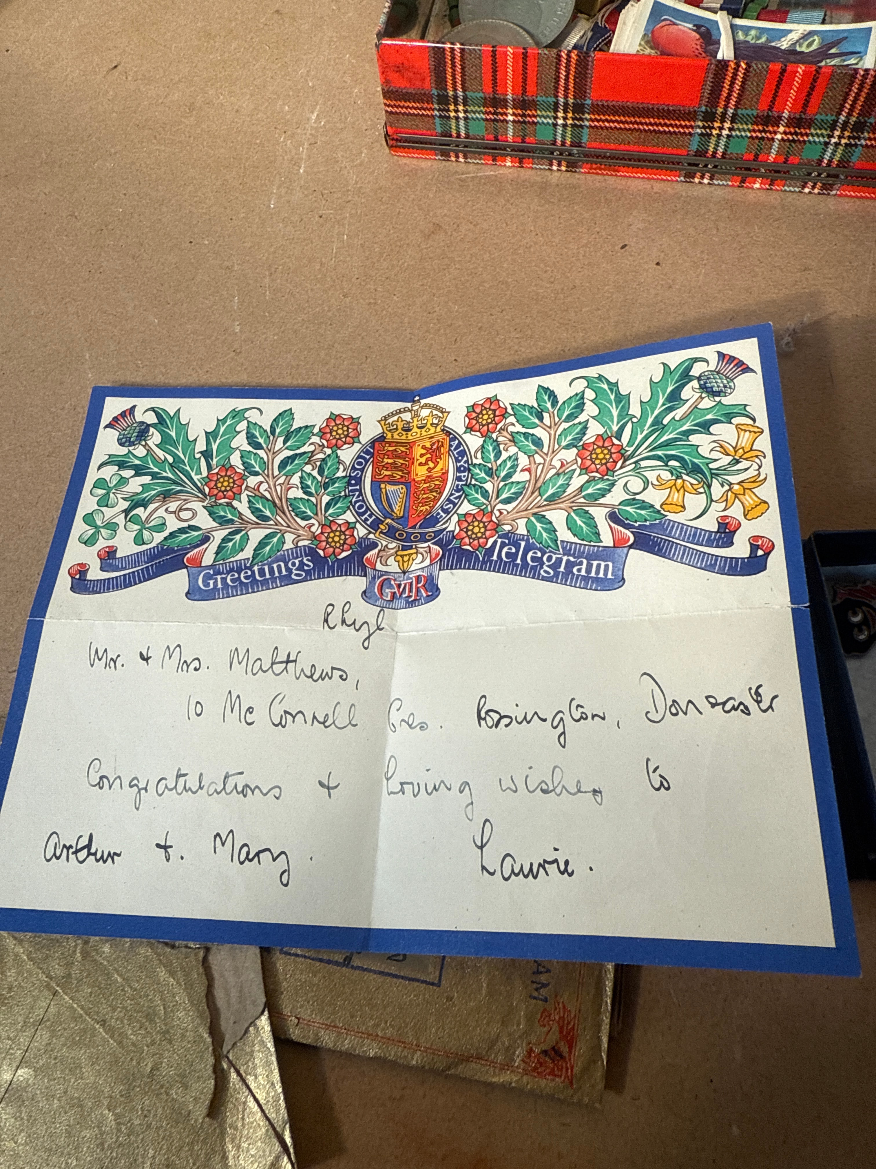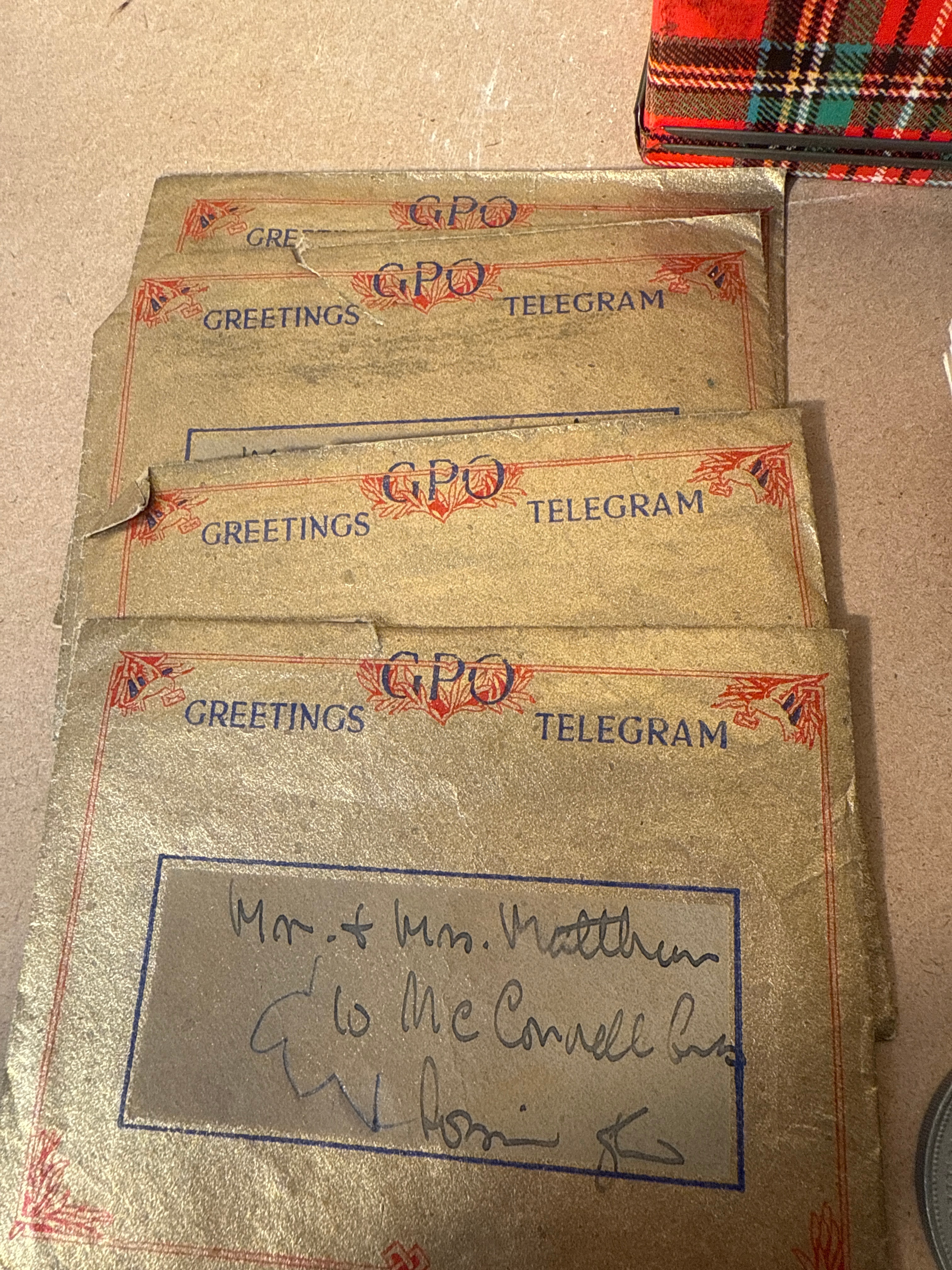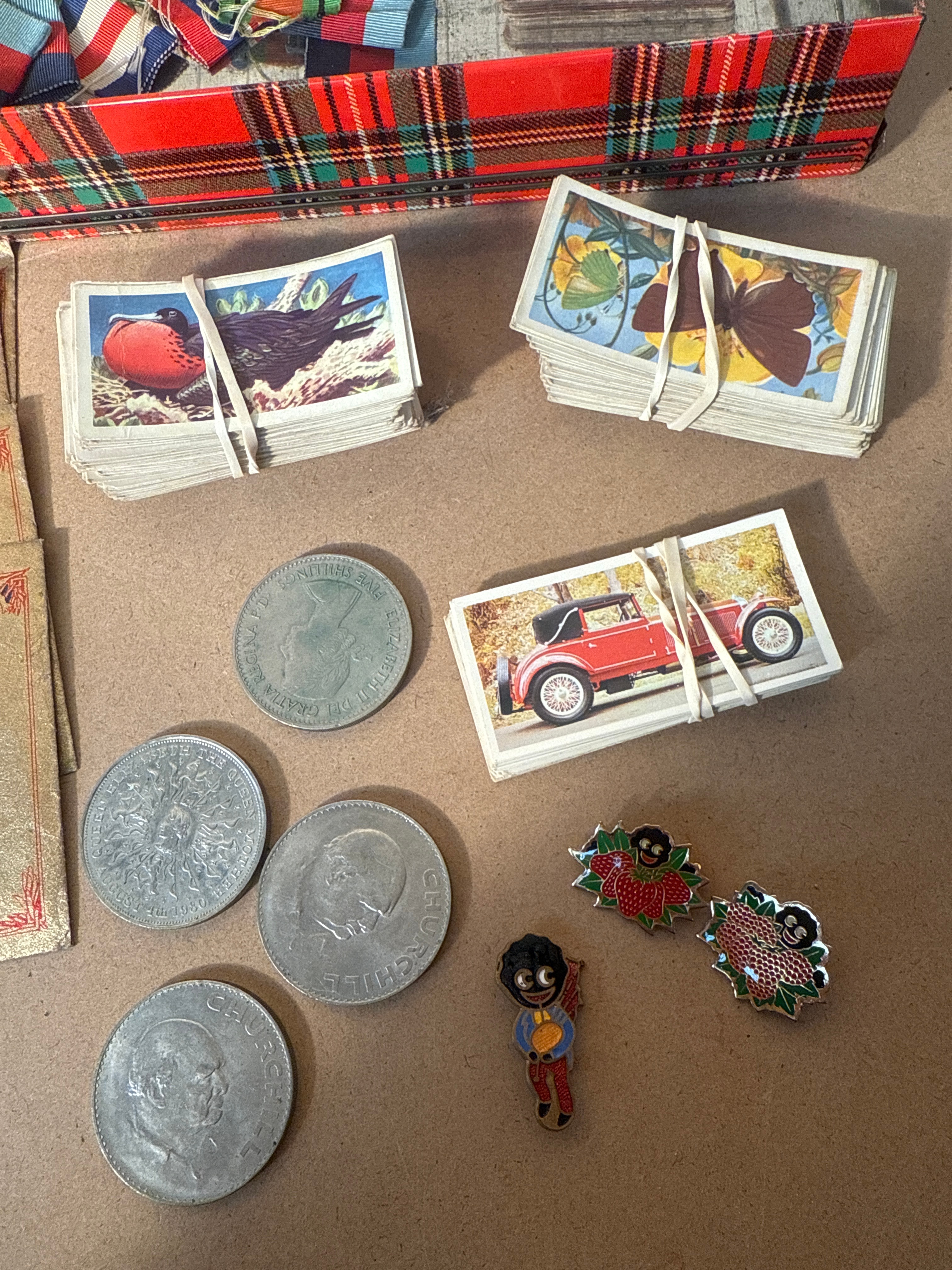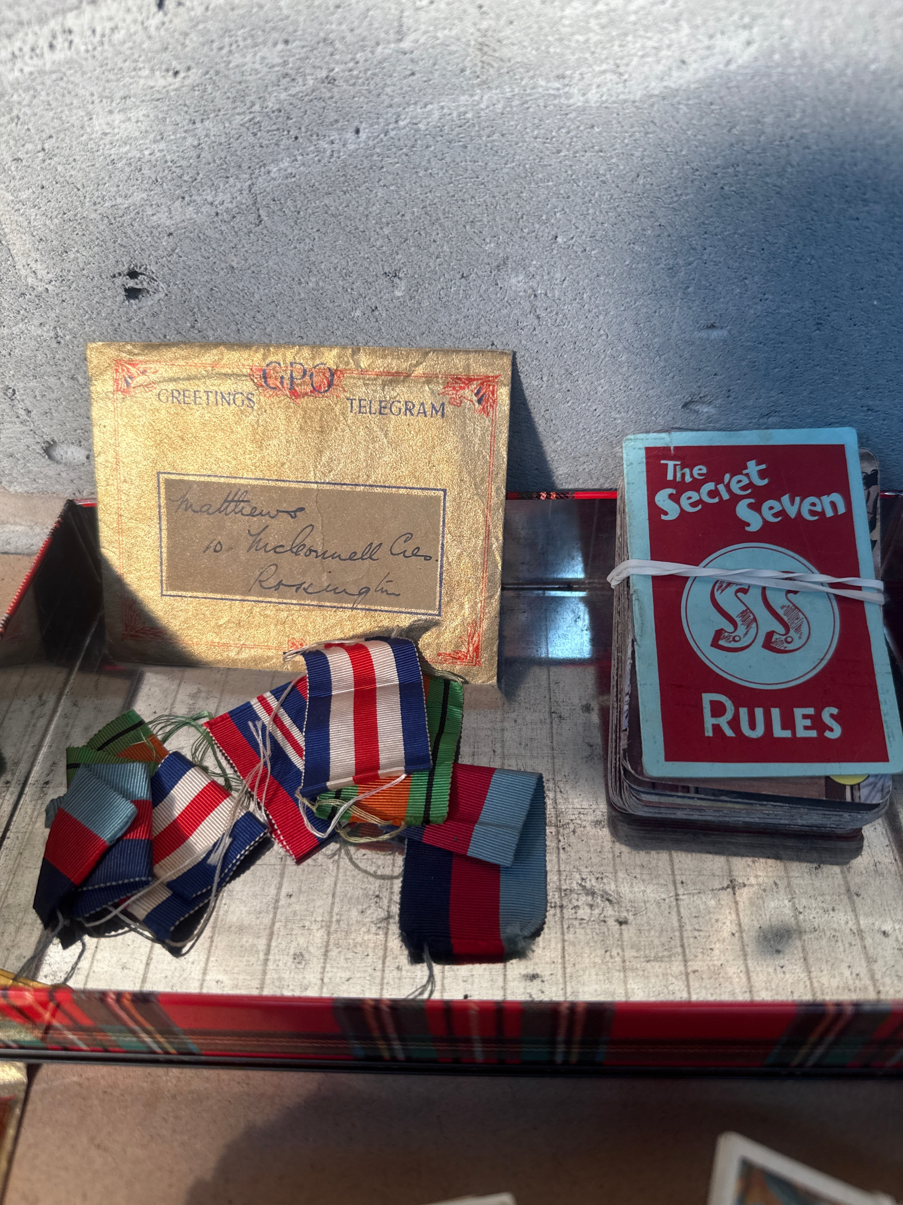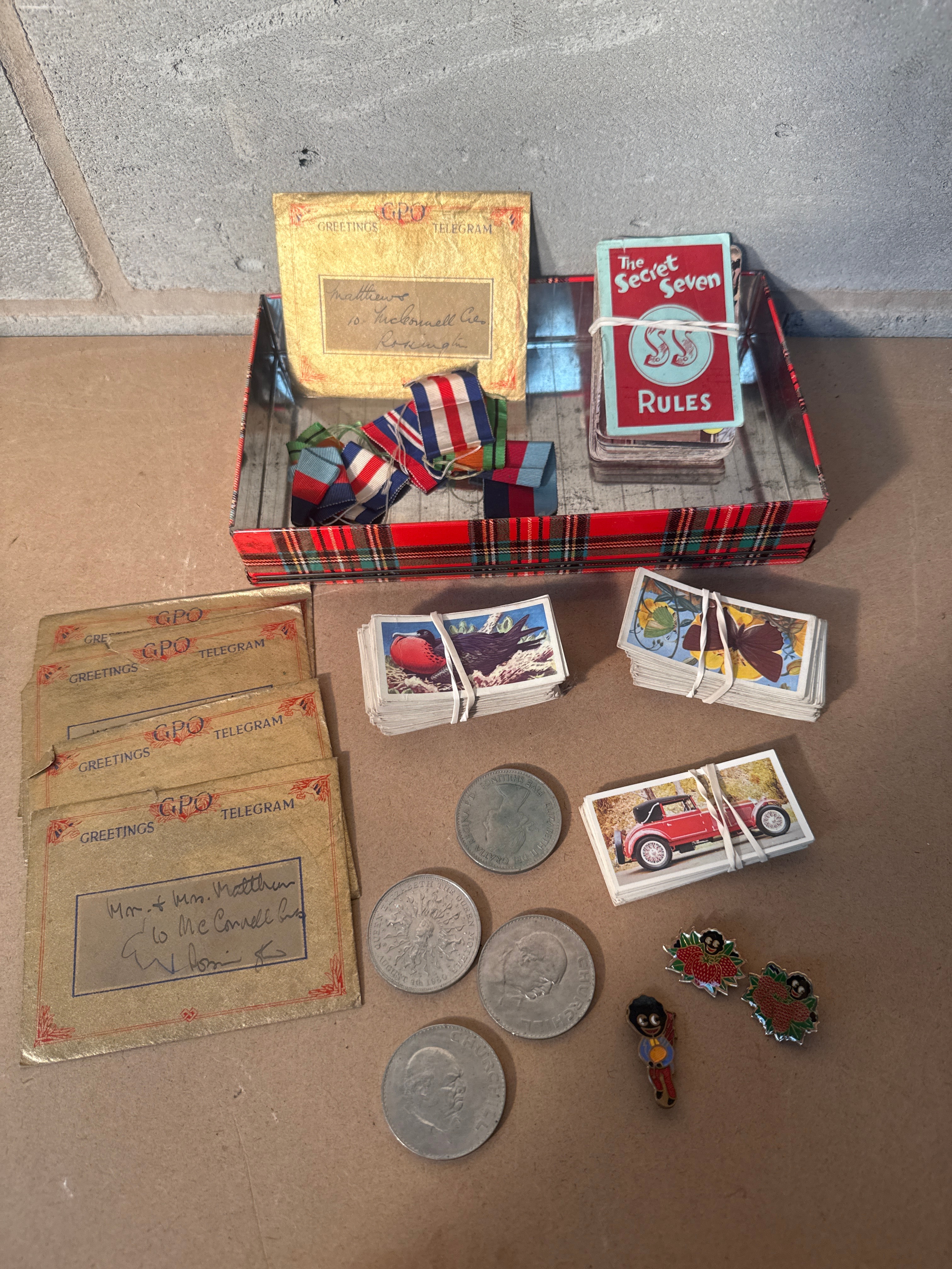 A collection of British militaria and ephemera, primarily dating to the mid-20th century, consistent with WWII-era groupings. The lot is housed within a red tartan-patterned tin box. Inside, there is a group of multi-colored fabric ribbons, possibly medal or service ribbons, and a set of “The Secret Seven RULES” cards featuring an “SS” logo, likely related to the popular children’s book series. Also included is a stack of GPO (General Post Office) Greetings Telegram envelopes, golden-toned and marked “GREETINGS TELEGRAM.” One example is addressed to “Mr. & Mrs. Matthew” in “Rossington, Doncaster,” with an unfolded example displaying a colorful royal crest and floral design alongside a handwritten message “Congratulations + loving wishes.” Additionally, the collection comprises three stacks of pictorial trading cards depicting birds, a butterfly, and a vintage red automobile; a group of British coins bearing the effigies of King George V, King George VI, and Queen Elizabeth II (inscriptions include “GEORGIUS V DEI GRA: BRITT: OMN: REX,” “GEORGIVS VI D: G: BR: OMN: REX,” and “ELIZABETH II D.G. REG. F.D.”); and three enamel pins, two shaped as holly sprigs, and one depicting a ‘Golly’ character.