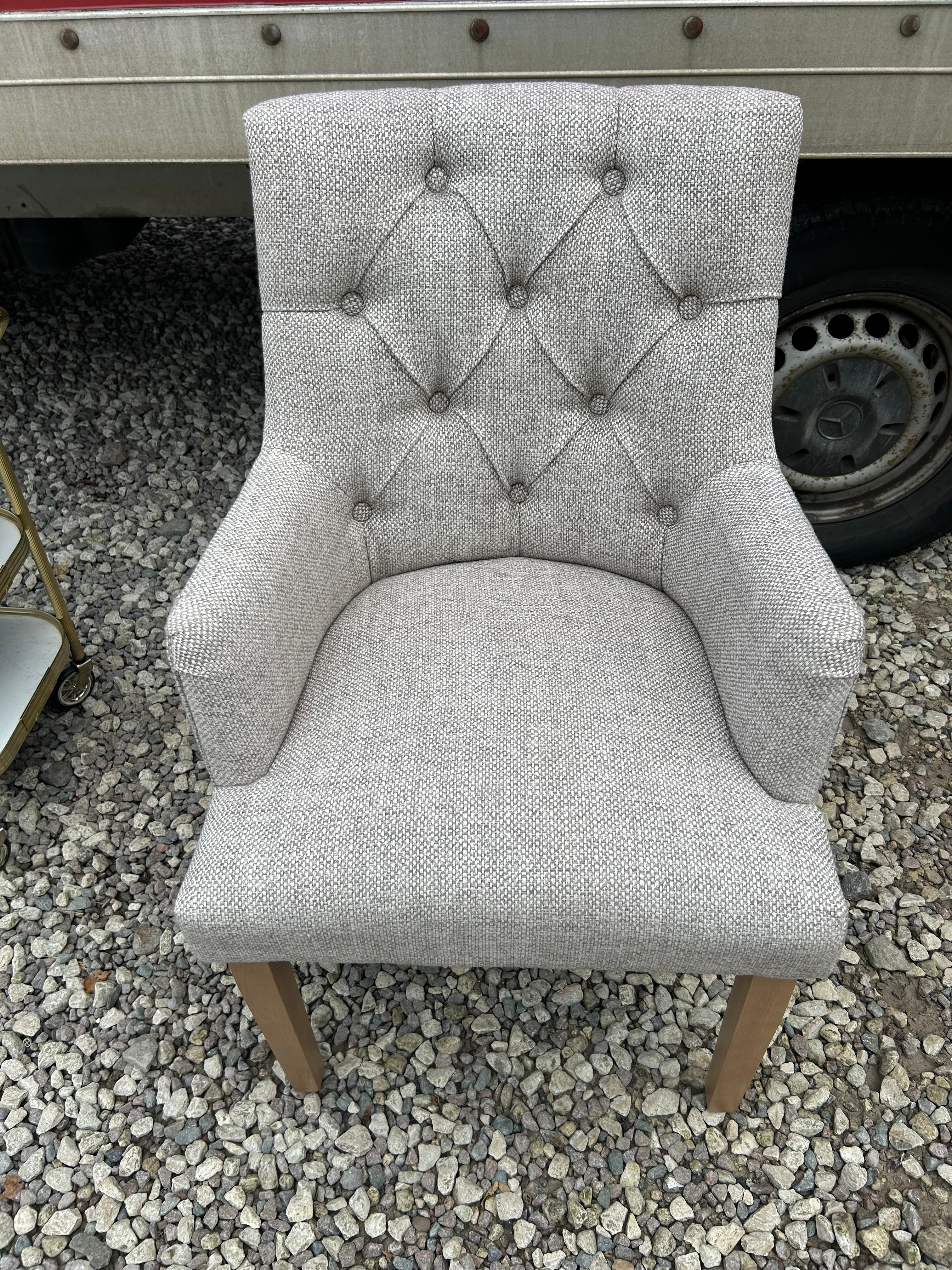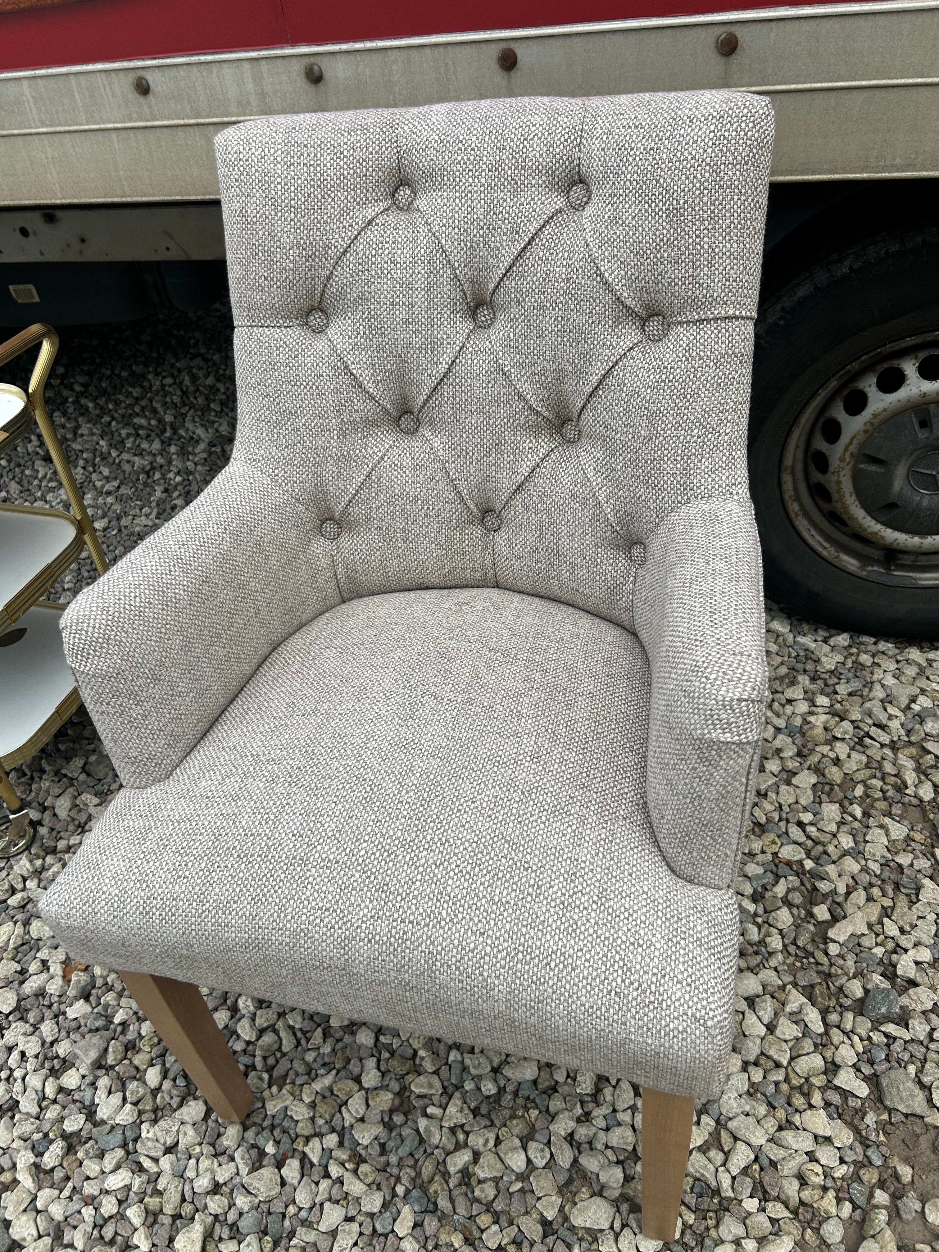 An iNSPIRE Q Artisan Button Tufted Dining Chair. This upholstered arm chair features a diamond-tufted backrest with nine buttons and gently padded arms. It is covered in a light, neutral-toned woven fabric with a visible texture, and stands on four simple, light-colored wooden legs. Its design suggests a contemporary or modern classic style.