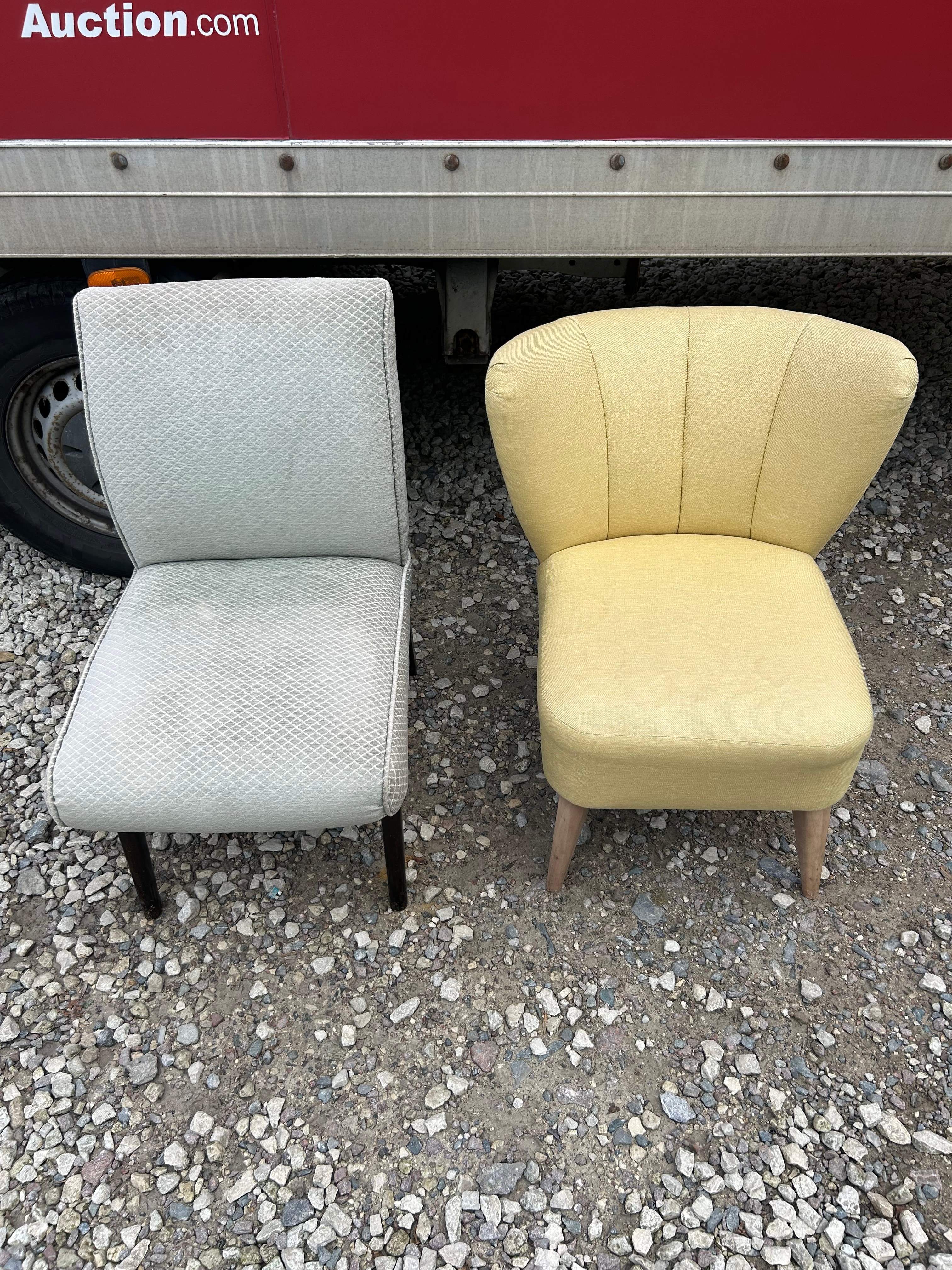 This lot comprises two distinct armless accent chairs, both exhibiting a modern aesthetic suggestive of a mid-20th century or contemporary style. The first chair is upholstered in a light grey or off-white fabric featuring a geometric diamond-patterned design and stands on dark, tapered legs. The second chair, identified through web intelligence as a Gold Sparrow Chico Accent Chair, is upholstered in a solid light yellow fabric with a distinctive scalloped backrest and lighter-toned, tapered wooden legs. No manufacturer’s marks or identifying labels are visibly present on either chair, apart from the Gold Sparrow identification for the yellow chair via research.