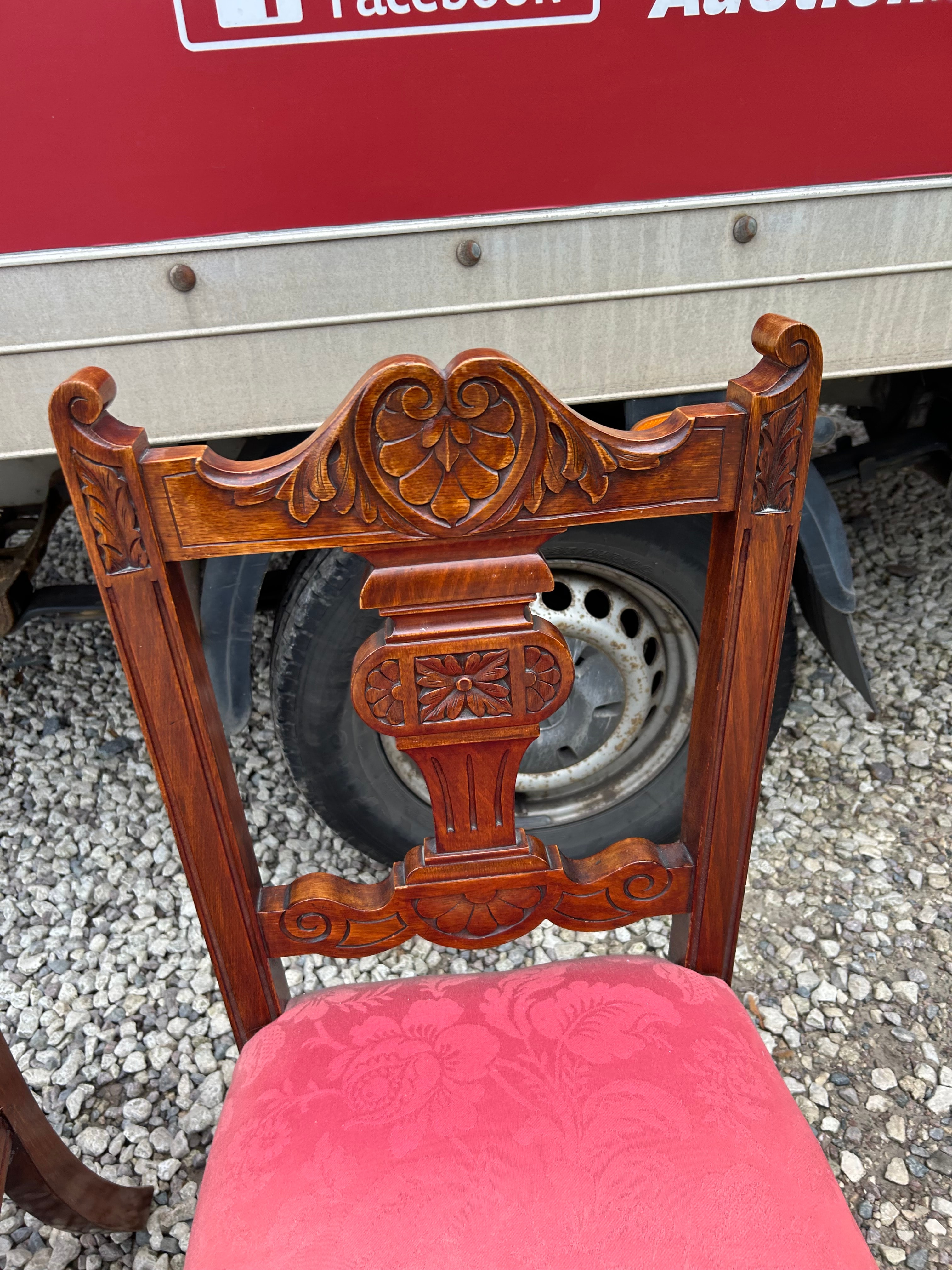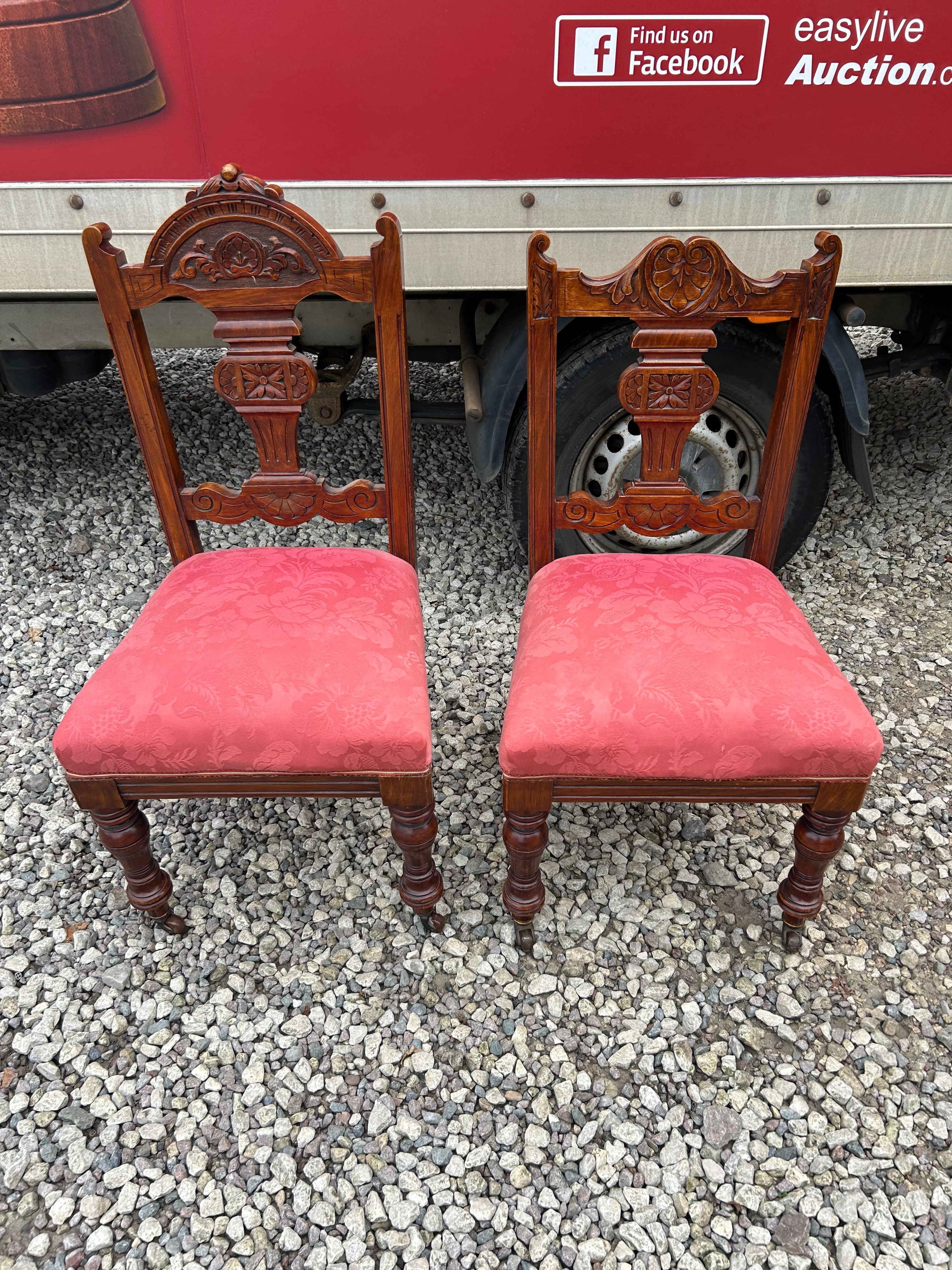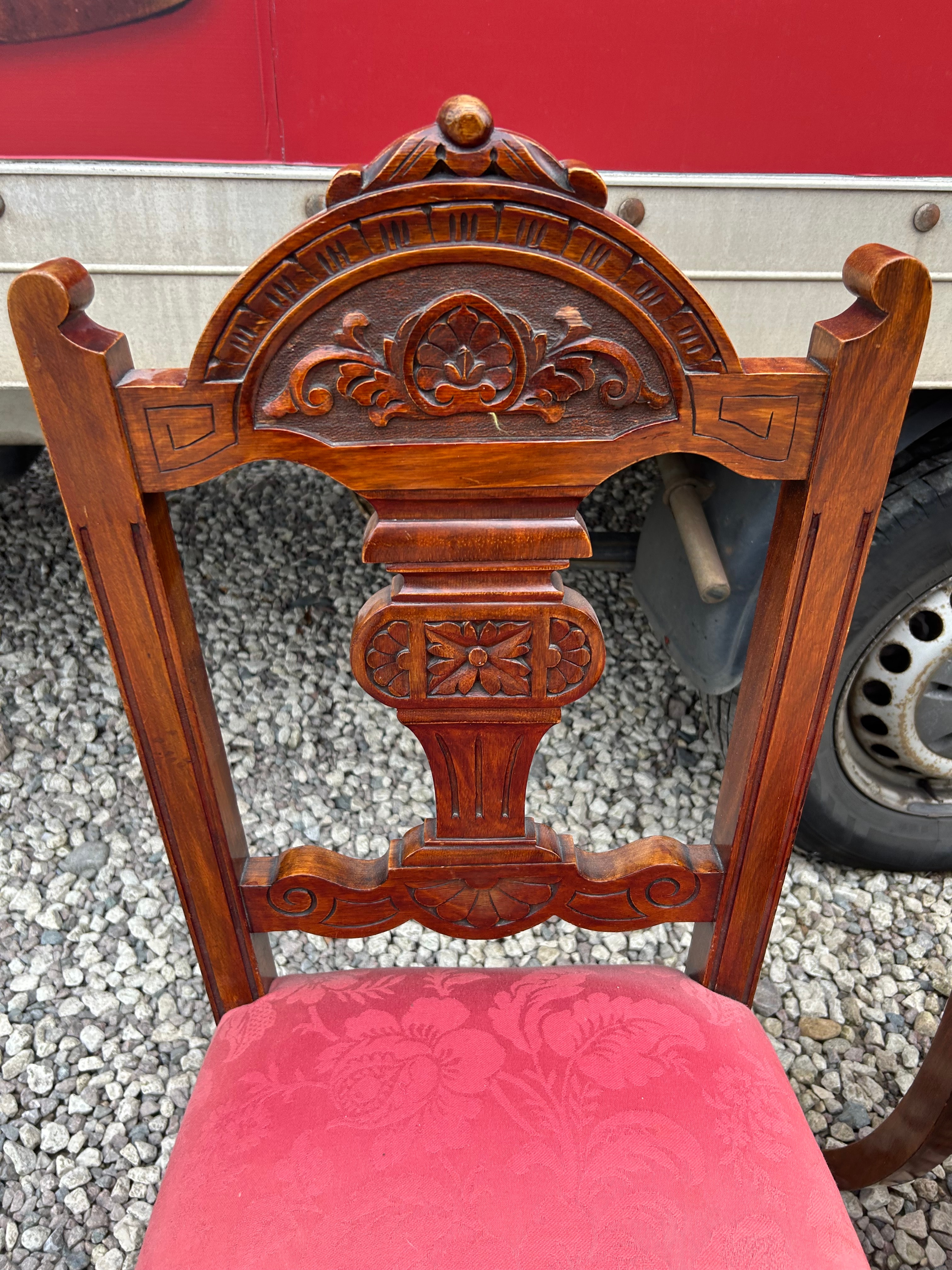 A pair of carved walnut Gothic Revival side chairs, dating to the late 19th century. Each chair features an ornate backrest with scrolled and floral carving on the crest rail and a central carved urn-form splat. The upholstered seats are covered in a red damask fabric with a repeating floral and foliate pattern, supported by turned and fluted front legs.